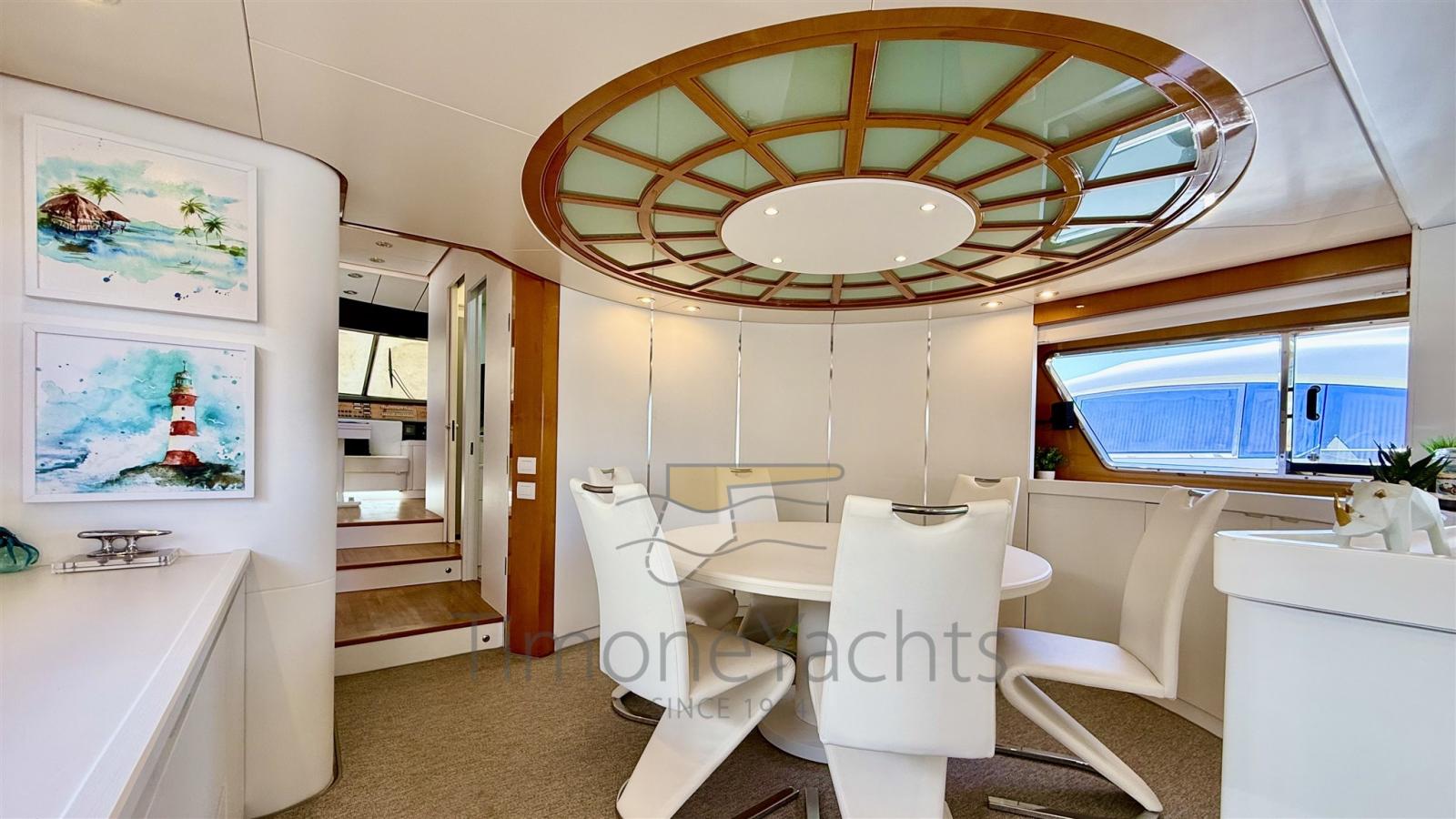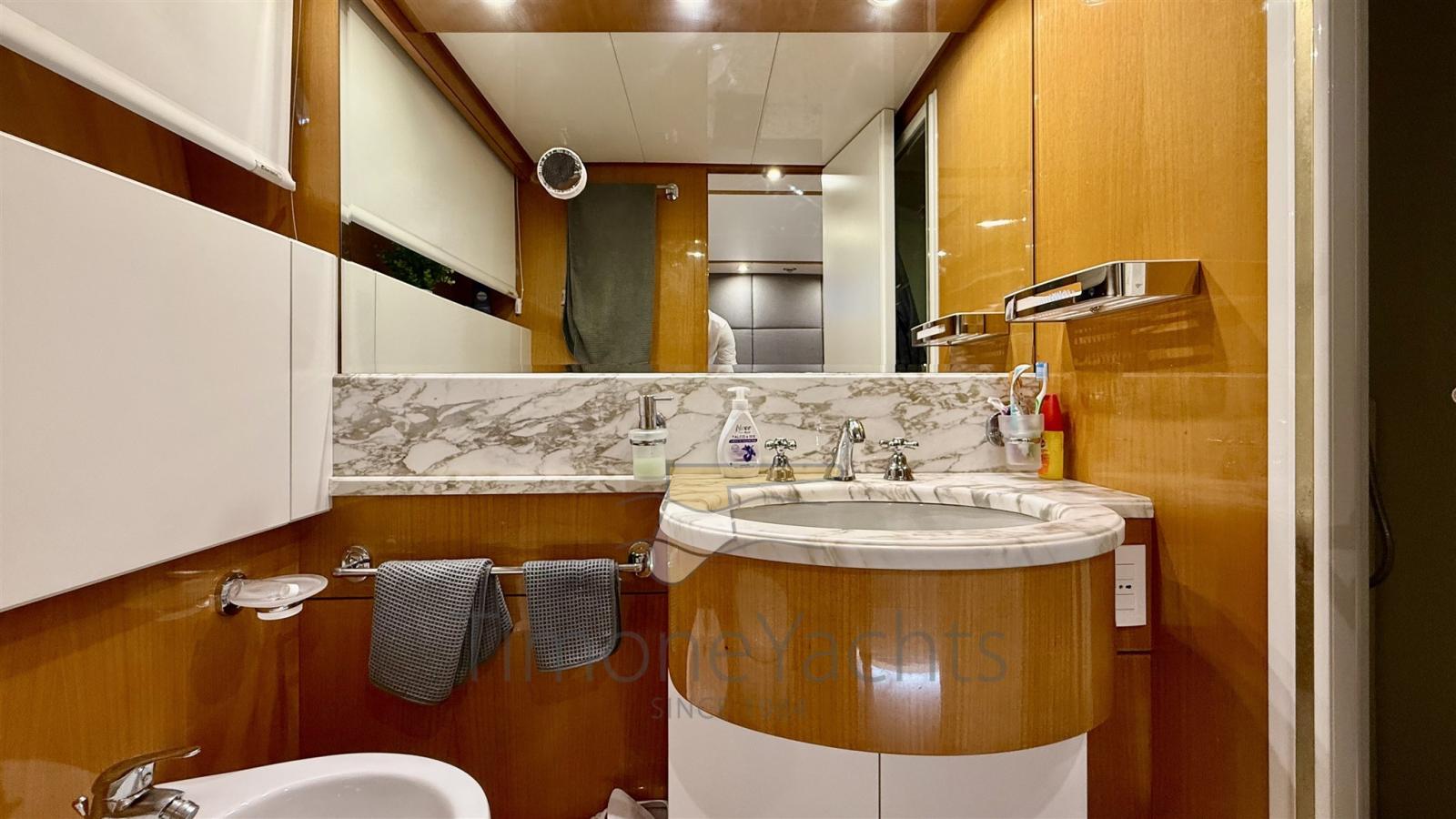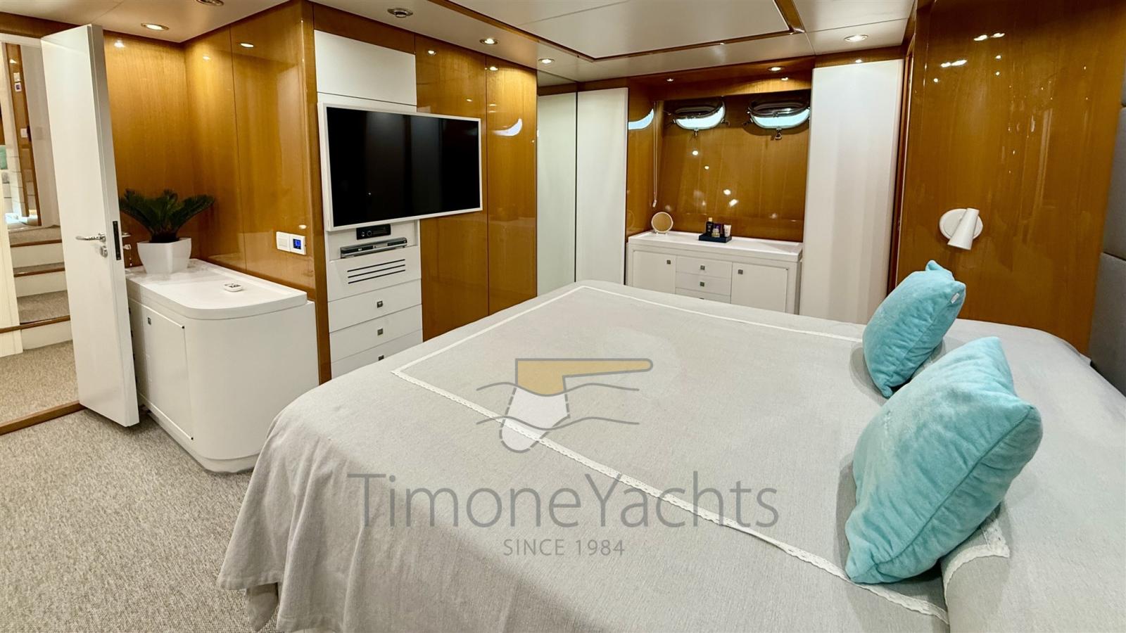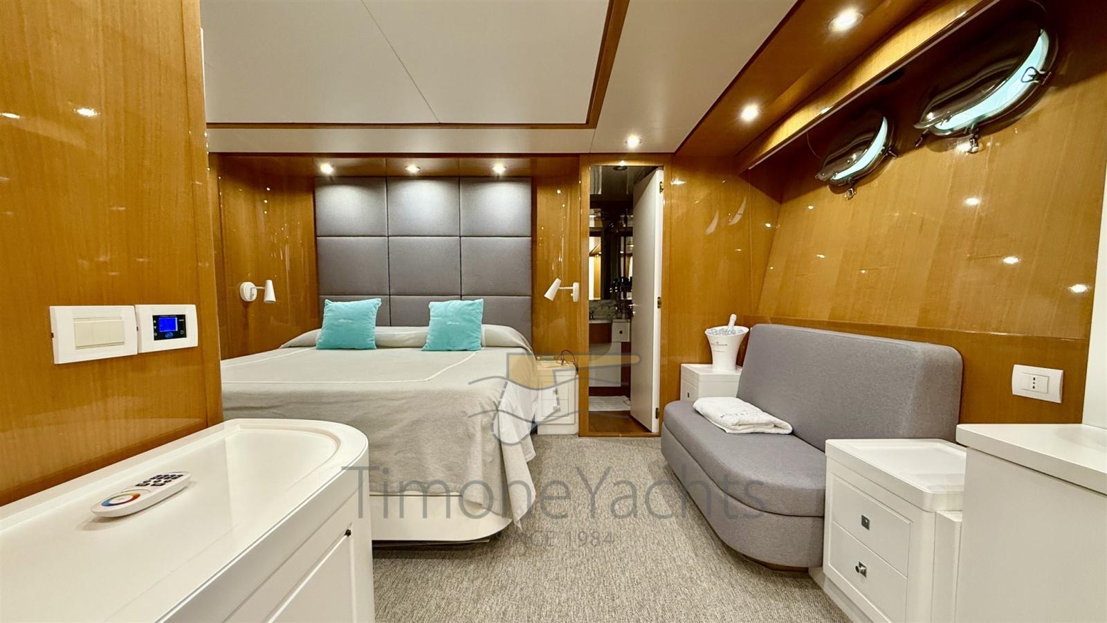 Bilge Alarm, Electric Engine Compartment Opening, Water pressure pump, Teak Side Decks, Deck Shower, Twin Steering, Directional Spotlight, Hydraulic Flaps (N°2), Davits for tender on fly, Fire Extinguishing System, Anchor Chain Washdown, Gangway, Platform, Automatic Bilge Pump, Teak deck, Entry door, Side door, Teak Cockpit, Voltage Rectifier, Rollbar, Electric Windlass, swimming ladder, Saddles for tender, cockpit table, Horn, Stern Winches.