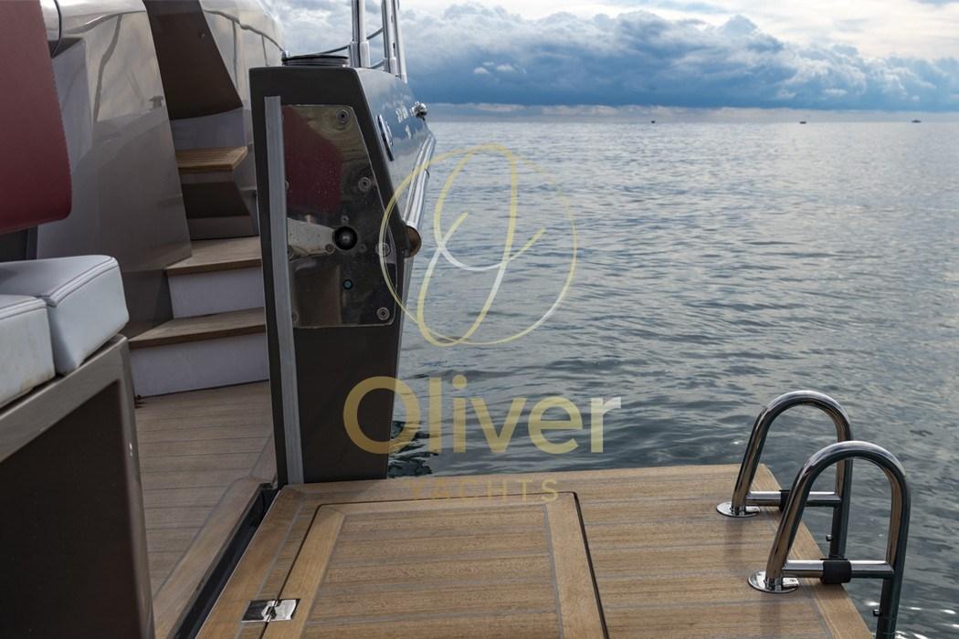 Fume/Gas Detector, Engine Alarm, Bilge Alarm, Alternator, Deck Suction of Dirty Water, Auto Dynamic Trim Interceptor, Water pressure pump, Auto-Trim, Teak Side Decks, Special Colour, Guard rail, Deck Shower, Anchor mount, Electric Flaps, Fire Extinguishing System, Anchor Chain Washdown, Washbasin in the cockpit, Courtesy Lights, Underwater lights, Battery Monitor, Fenders, Gangway, Platform, Automatic Bilge Pump, Manual Bilge Pump, Teak deck, Entry door, Teak Cockpit, Shorepower connector, Water harbor connector system, Electric Windlass, swimming ladder, cockpit table, Horn.