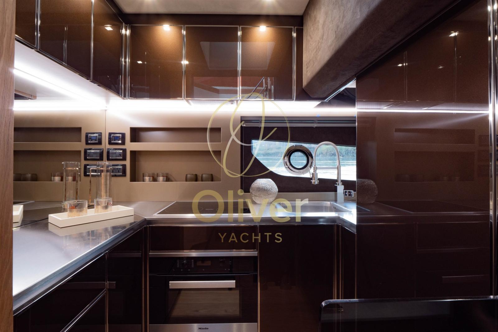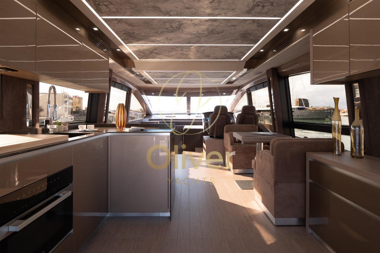 The saloon, bright thanks to the large windows and the "Gullwing" doors, houses a refined living area with sofa, dining table and ergonomic helm station with dual Raymarine GPS, digital instrumentation and joystick. The kitchen, fully equipped with induction hob, combi oven, refrigerator and freezer, is designed to ensure functionality and space, like at home.