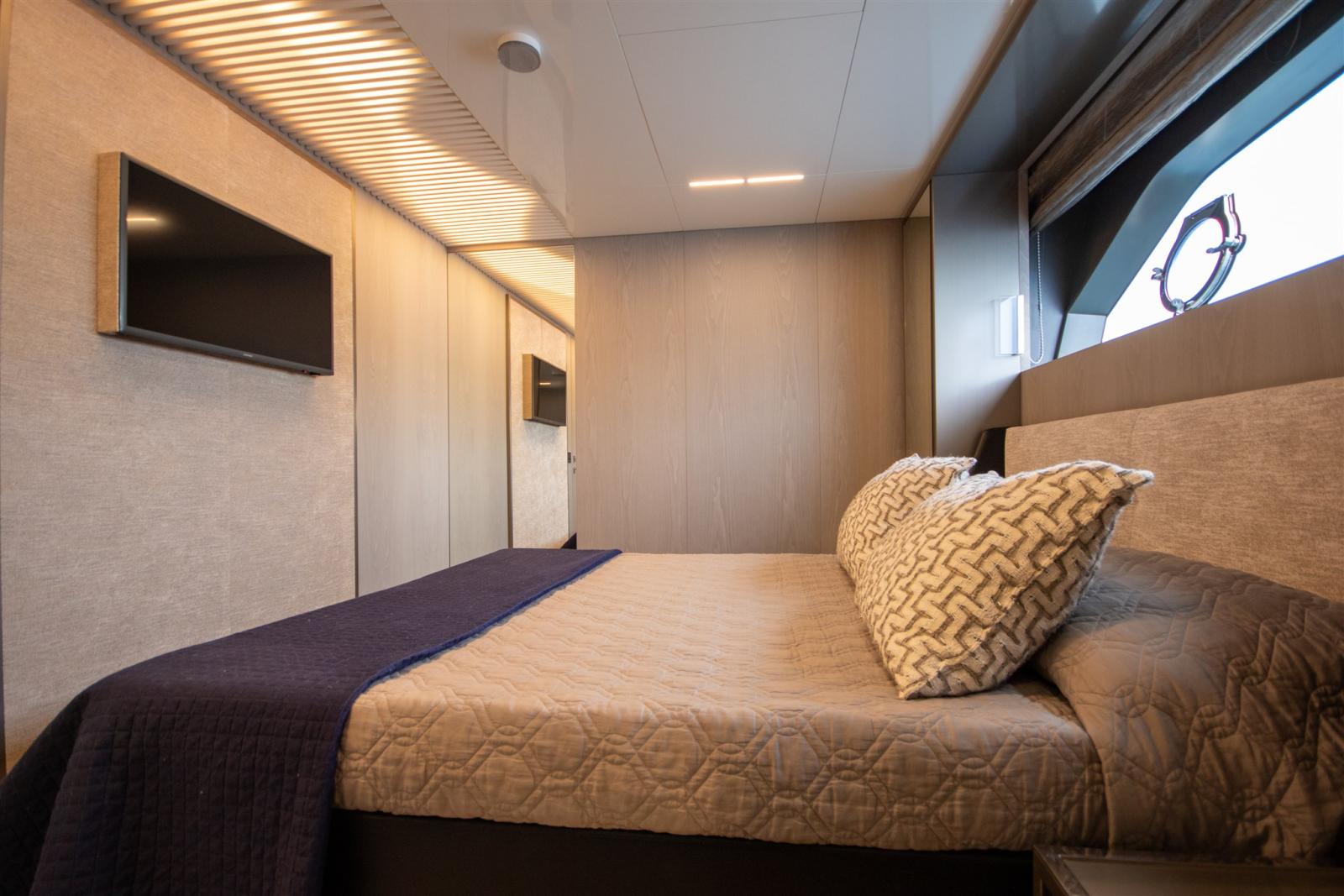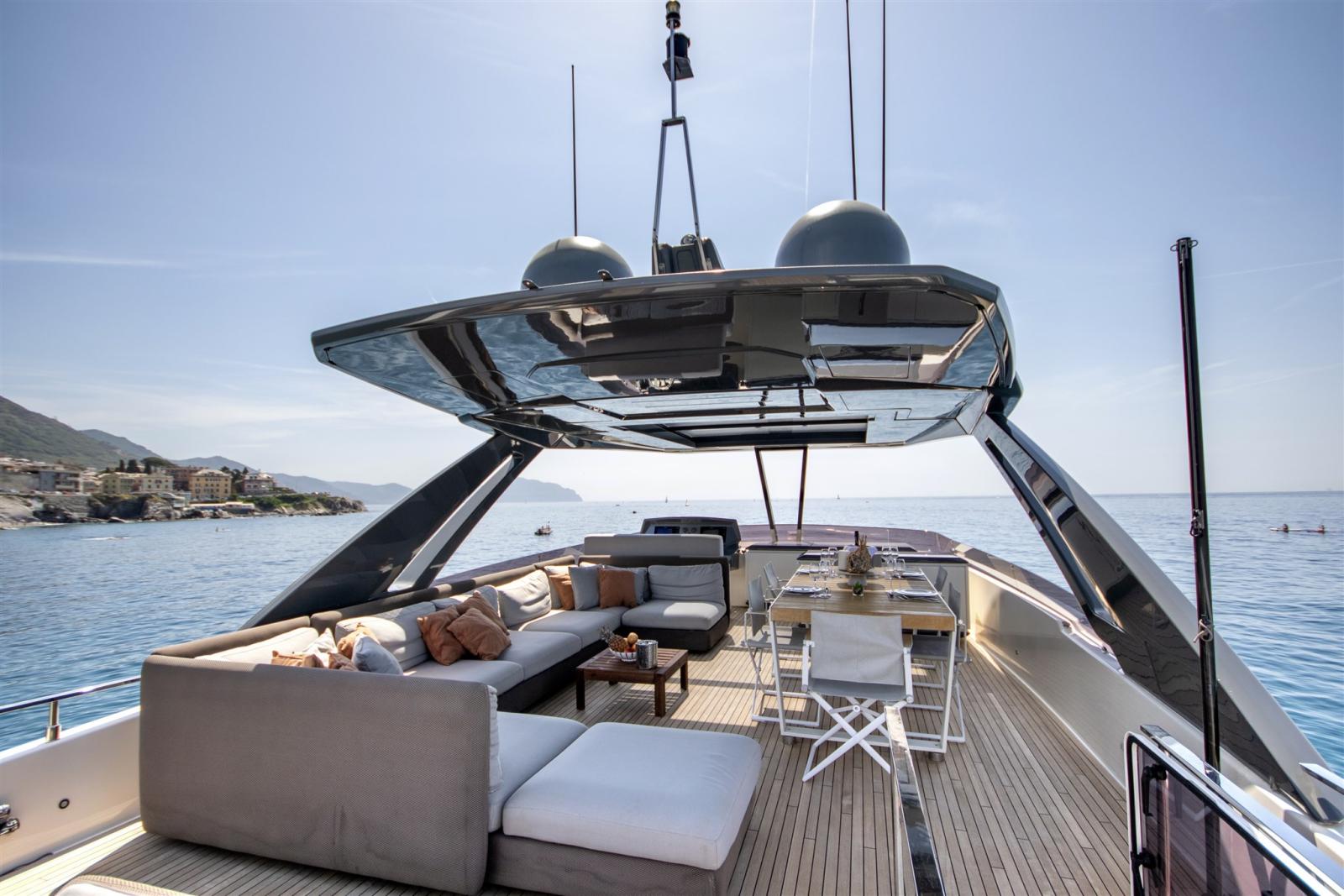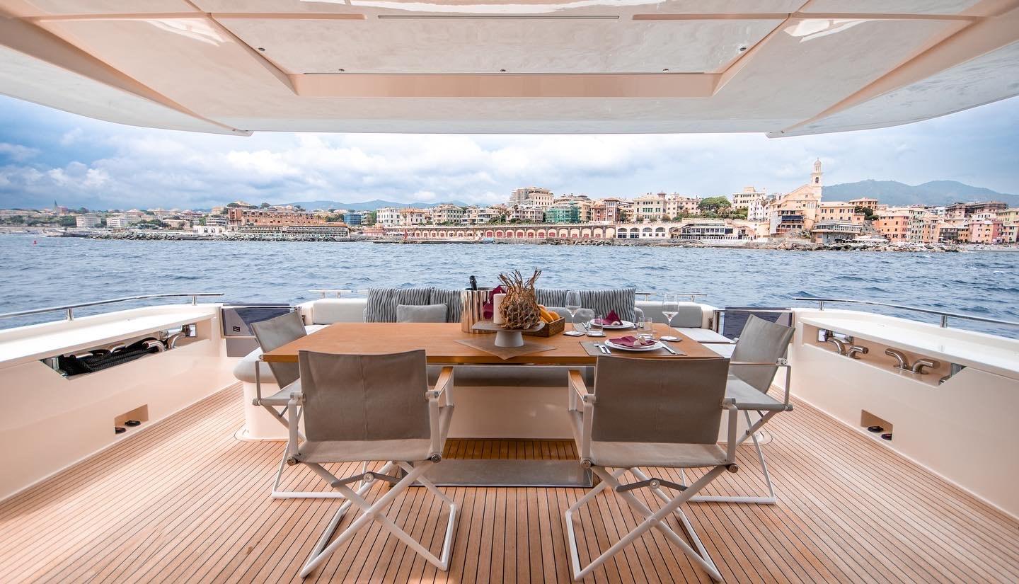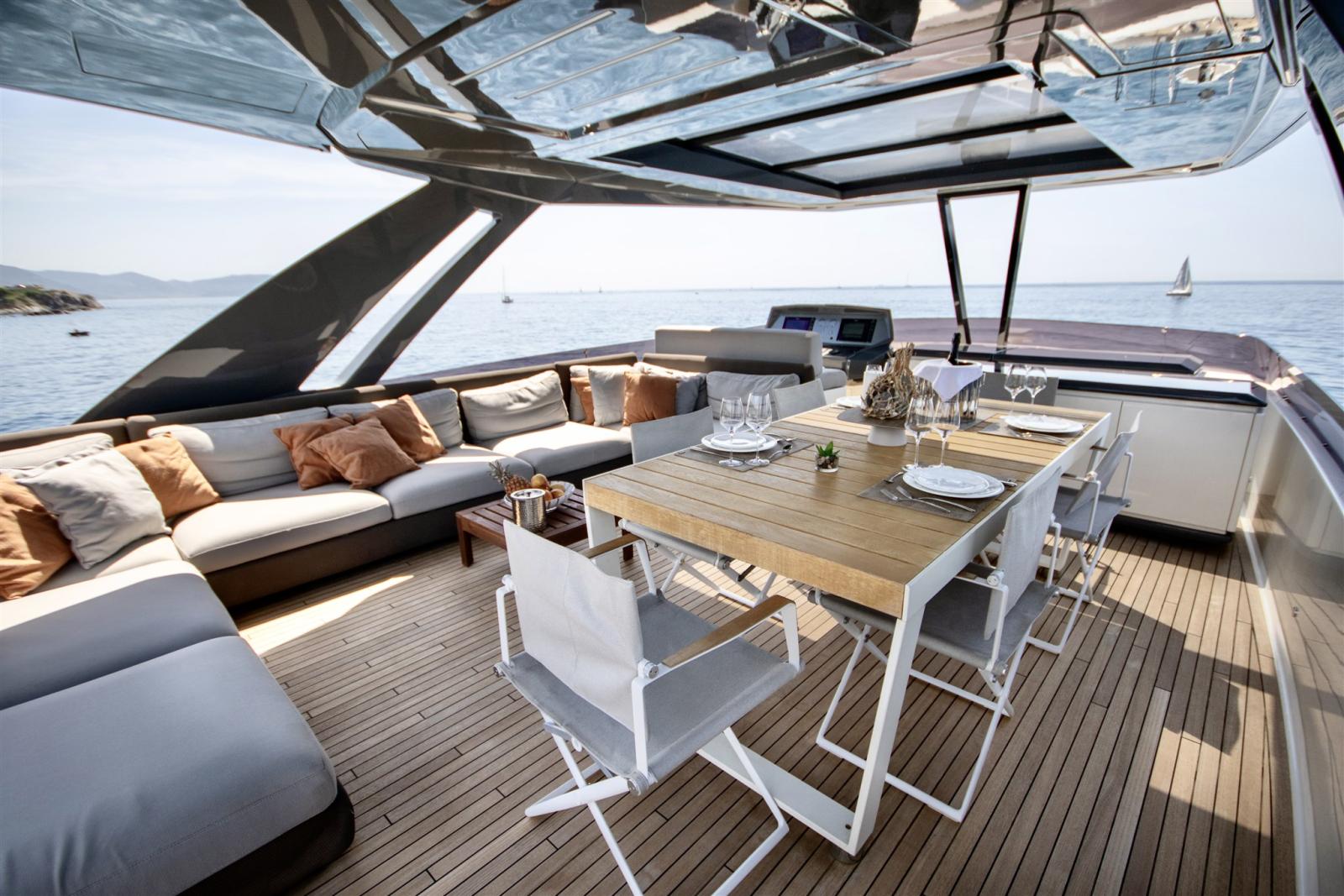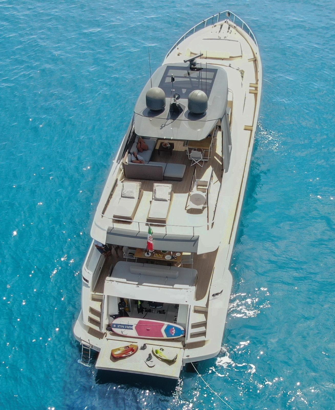 Engine Alarm, Bilge Alarm, Alternator, Water pressure pump, Teak Side Decks, Deck Shower, Twin Steering, Directional Spotlight, Electric Flaps, Tender Garage, Fire Extinguishing System, Flaps Indicators, Anchor Chain Washdown, Courtesy Lights, Gangway, Platform, Automatic Bilge Pump, Manual Bilge Pump, Teak deck, Entry door, Side door, Teak Cockpit, Shorepower connector, Electronic instrumentation repeater, Electric Windlass, swimming ladder, Stabilizers (ZERO SPEED), cockpit table, guard rails with gates, Horn, T-Top, Stern Winches.