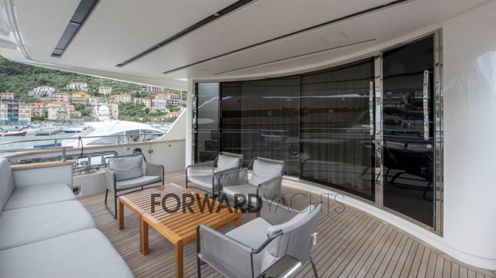 2 Anchor, Teak Side Decks, 2 Battery charger, Stern Thruster (idraulica), Bow Thruster (elettrica), Hydraulic Flaps, Tender Garage, Hard top, Underwater lights, Gangway (idraulica), Teak deck, Teak Cockpit, Water harbor connector system, Electric Windlass, Stabilizers (a pinne), cockpit table.