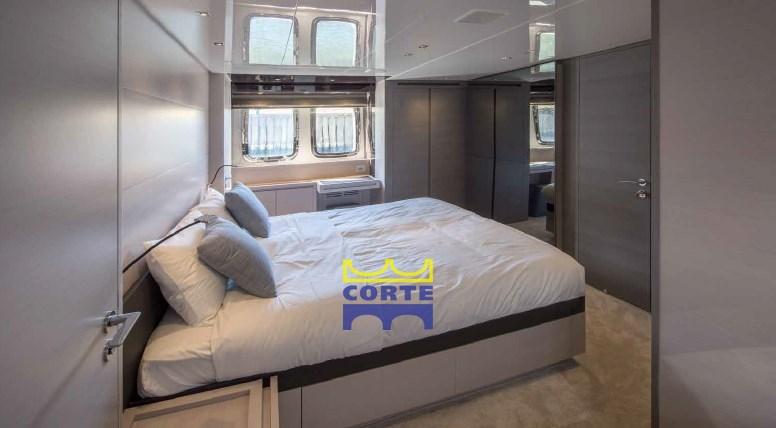 Full-beam double master cabin with walk-in closet and bathroom with shower. TV behind the mirror.