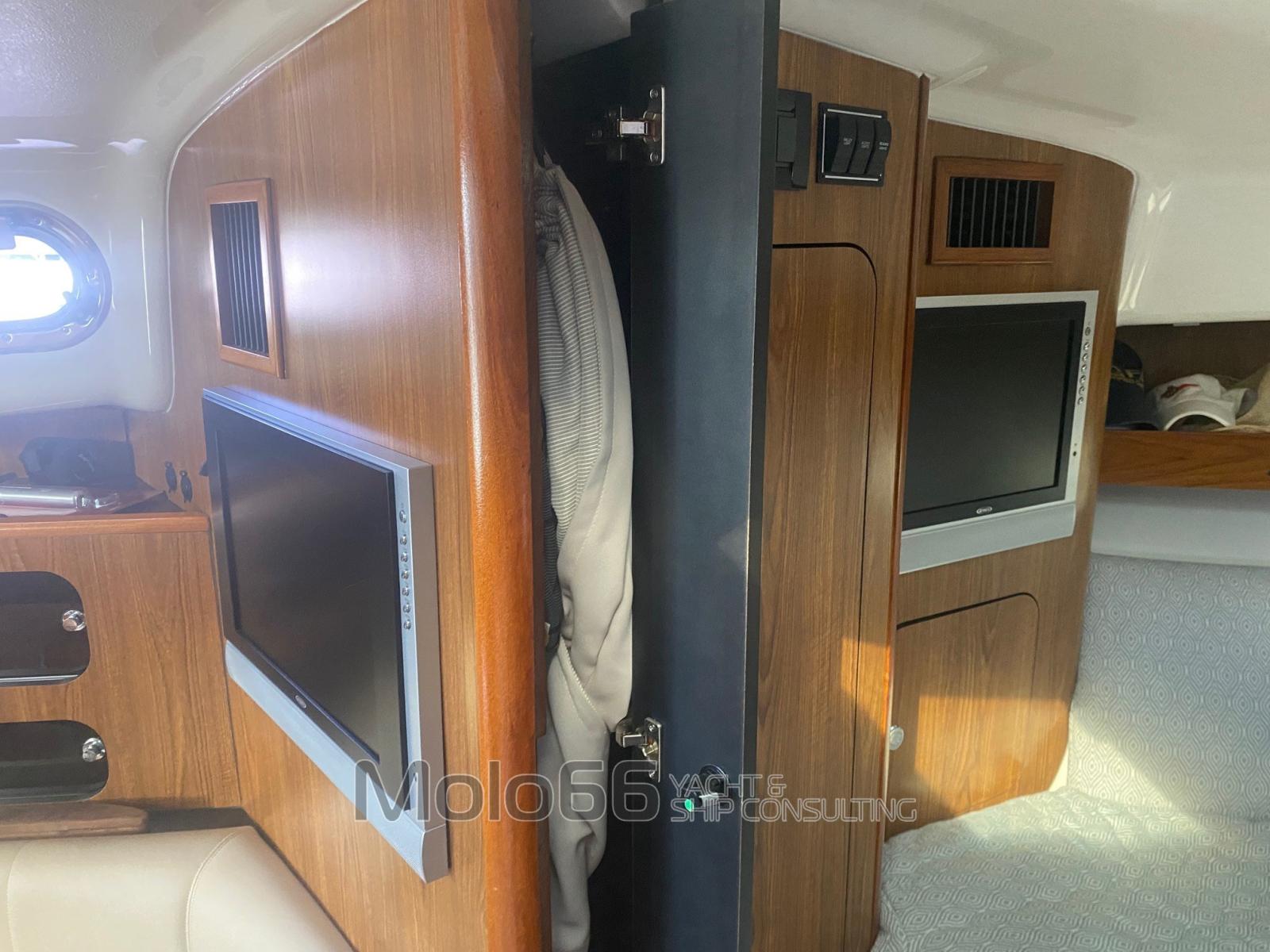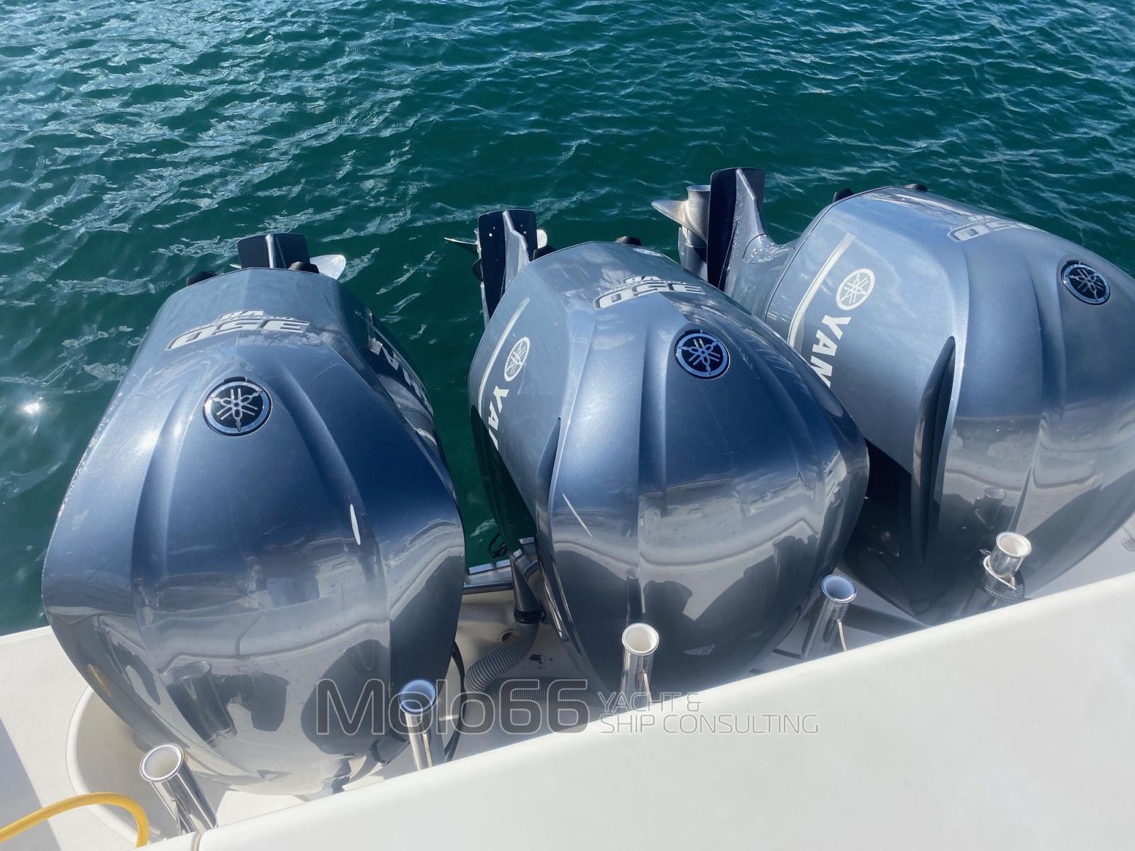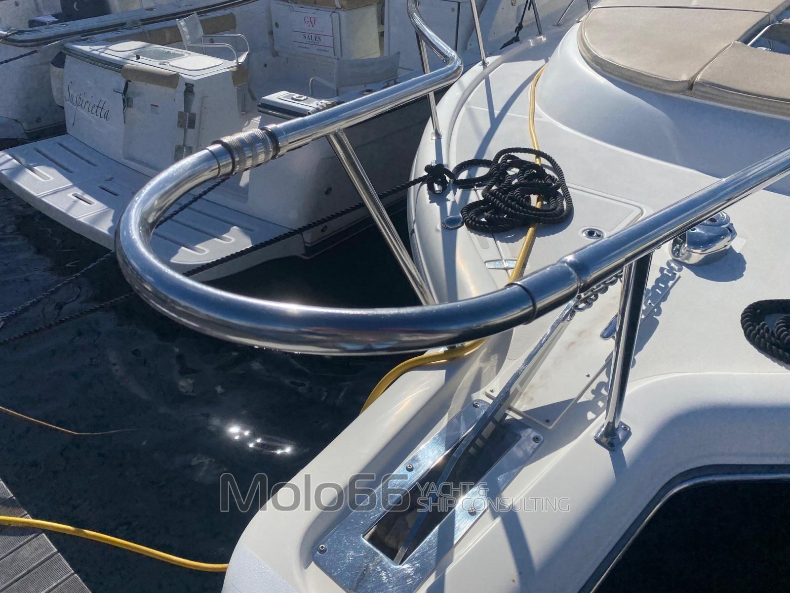 Fume/Gas Detector (monossido di carbonio), Engine Alarm, Bilge Alarm, Water pressure pump, Batteries (n° 7), Shore power cable, Deck Shower (calda/fredda), Bow Thruster (5.4 hp), Headlights fixed on the stem, Directional Spotlight, Electric Flaps (Lenco), Hard top, Fire Extinguishing System, Flaps Indicators, Anchor Chain Washdown, Washbasin in the cockpit, Courtesy Lights, Solar panels, Fenders, Automatic Bilge Pump (n° 3 - 2 da 1500 lth e1 da 1100 lth), Deck Wash Pump, Shorepower connector, Voltage Rectifier, Electric Windlass, swimming ladder, cockpit table, Horn.