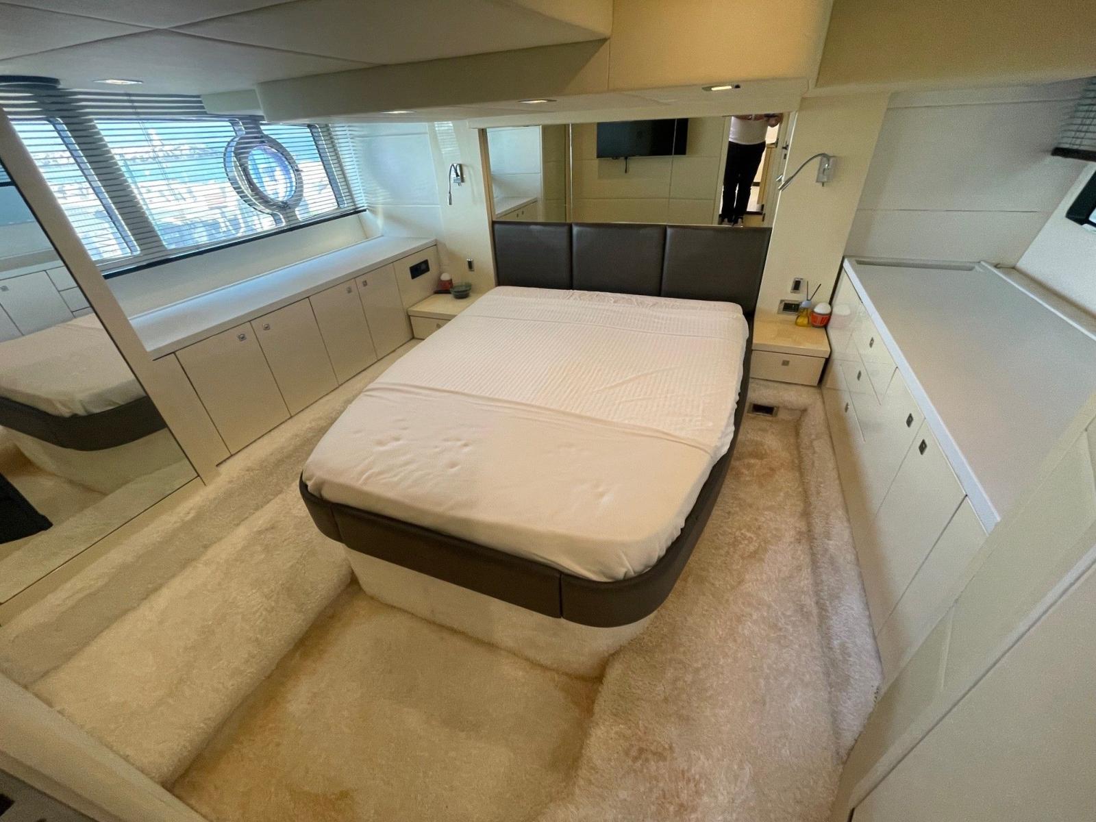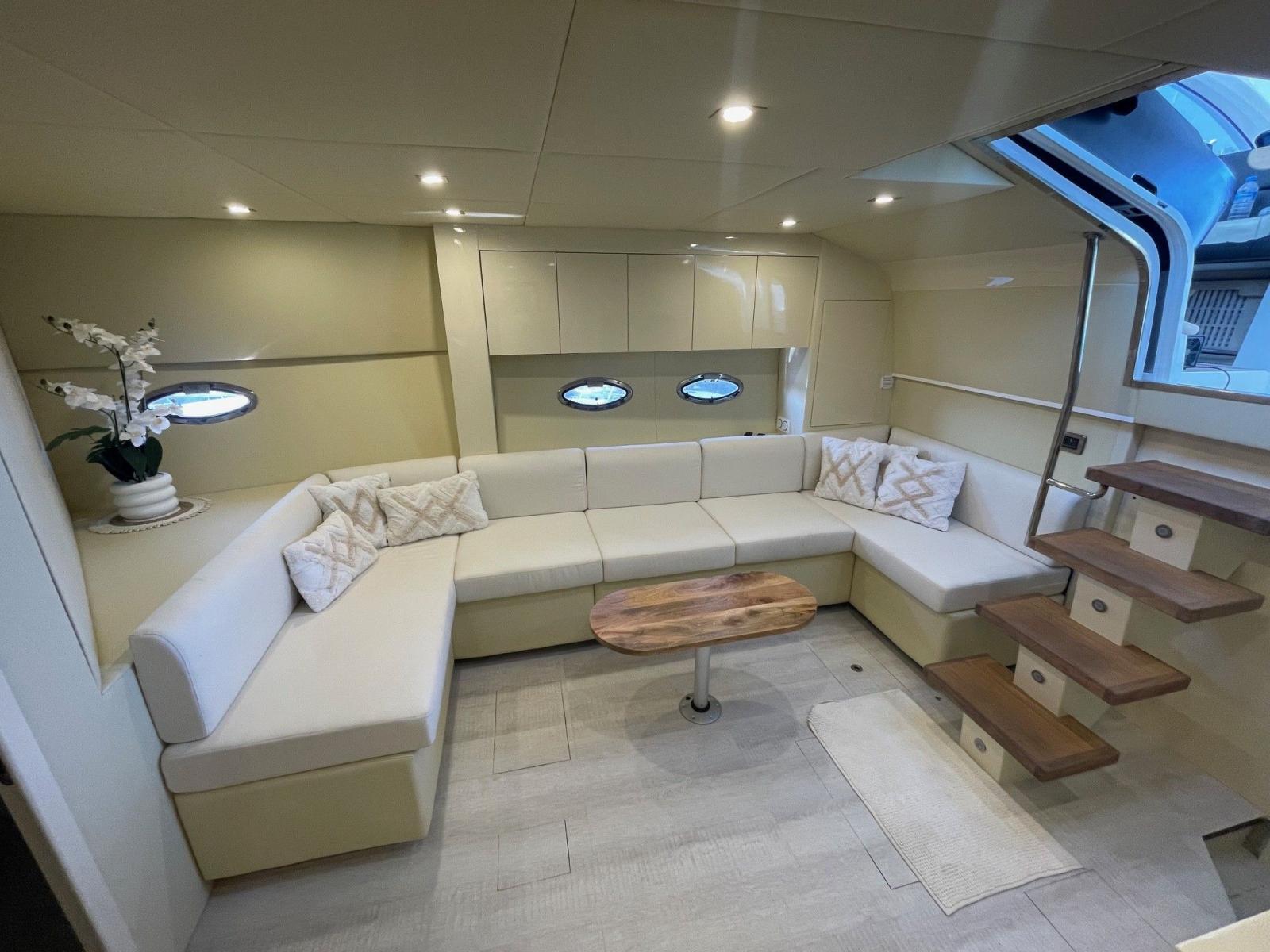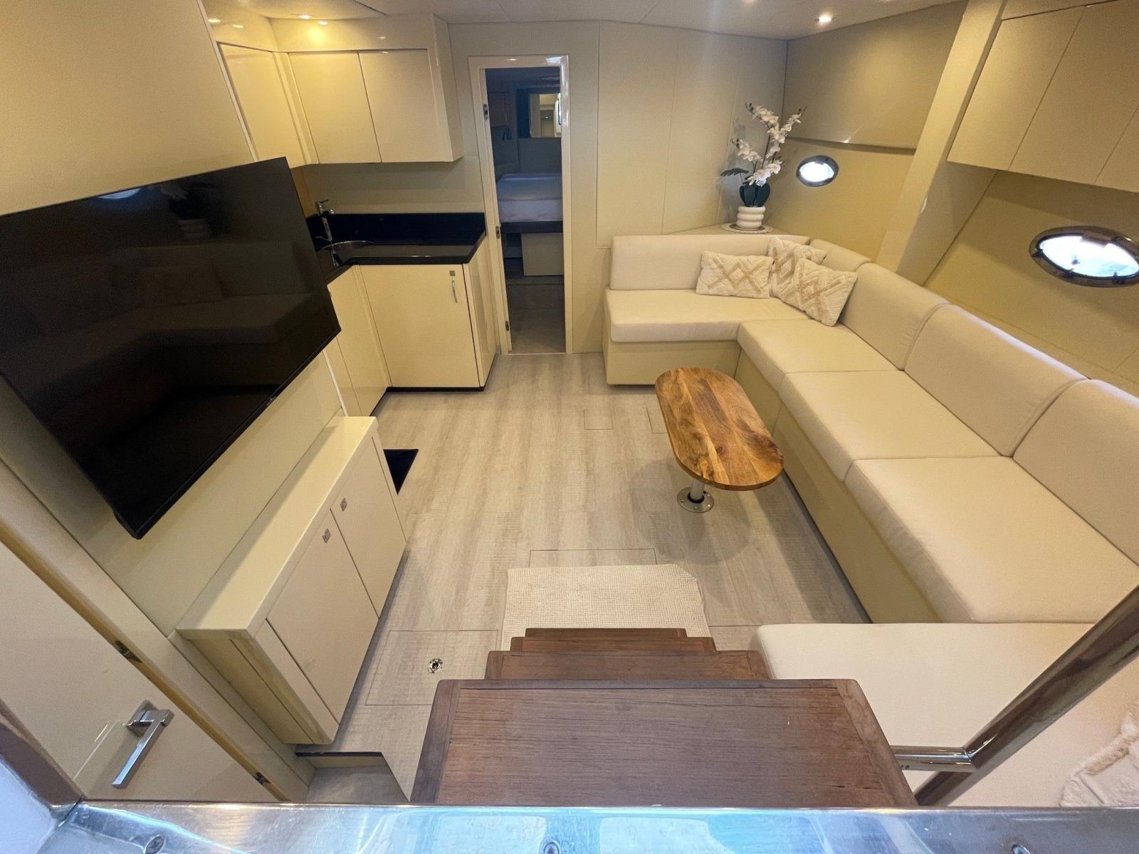 The interior houses a large saloon with a TV and a fully equipped galley. Accommodation consists of an aft owner's cabin and a forward VIP cabin with a double bed that can be separated into two berths. The forward head was removed to enlarge the saloon. There is now a single head with dual access, a separate shower and an electric toilet.