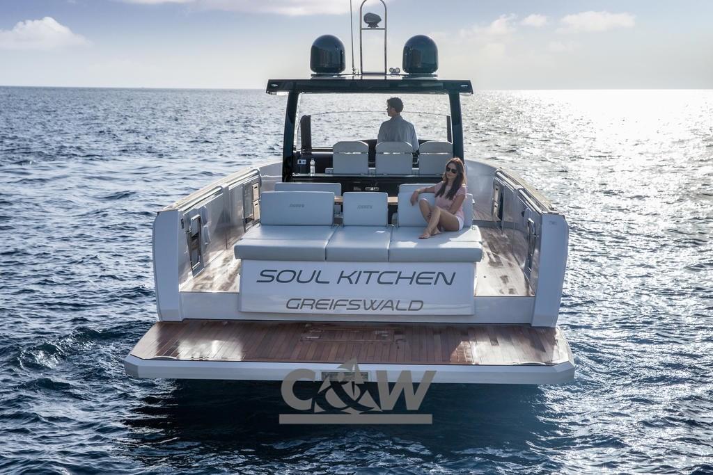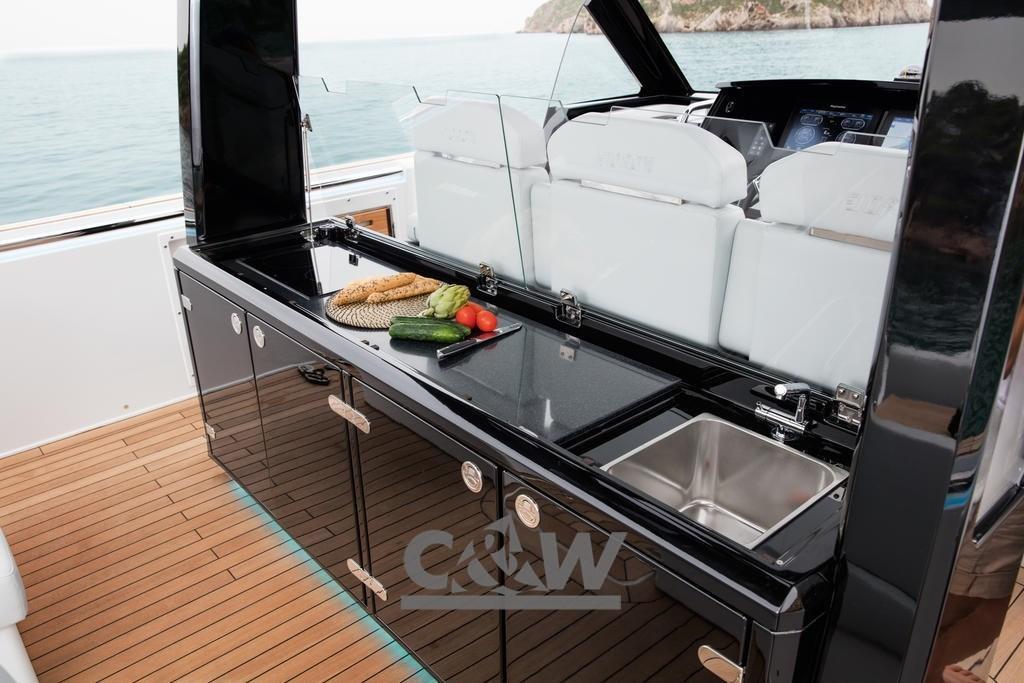 Galley (esterna), 3 Deck Refrigerator (2 sotto le panche + 1 mobile bar), 2 Ceramic hot plate (induzione).