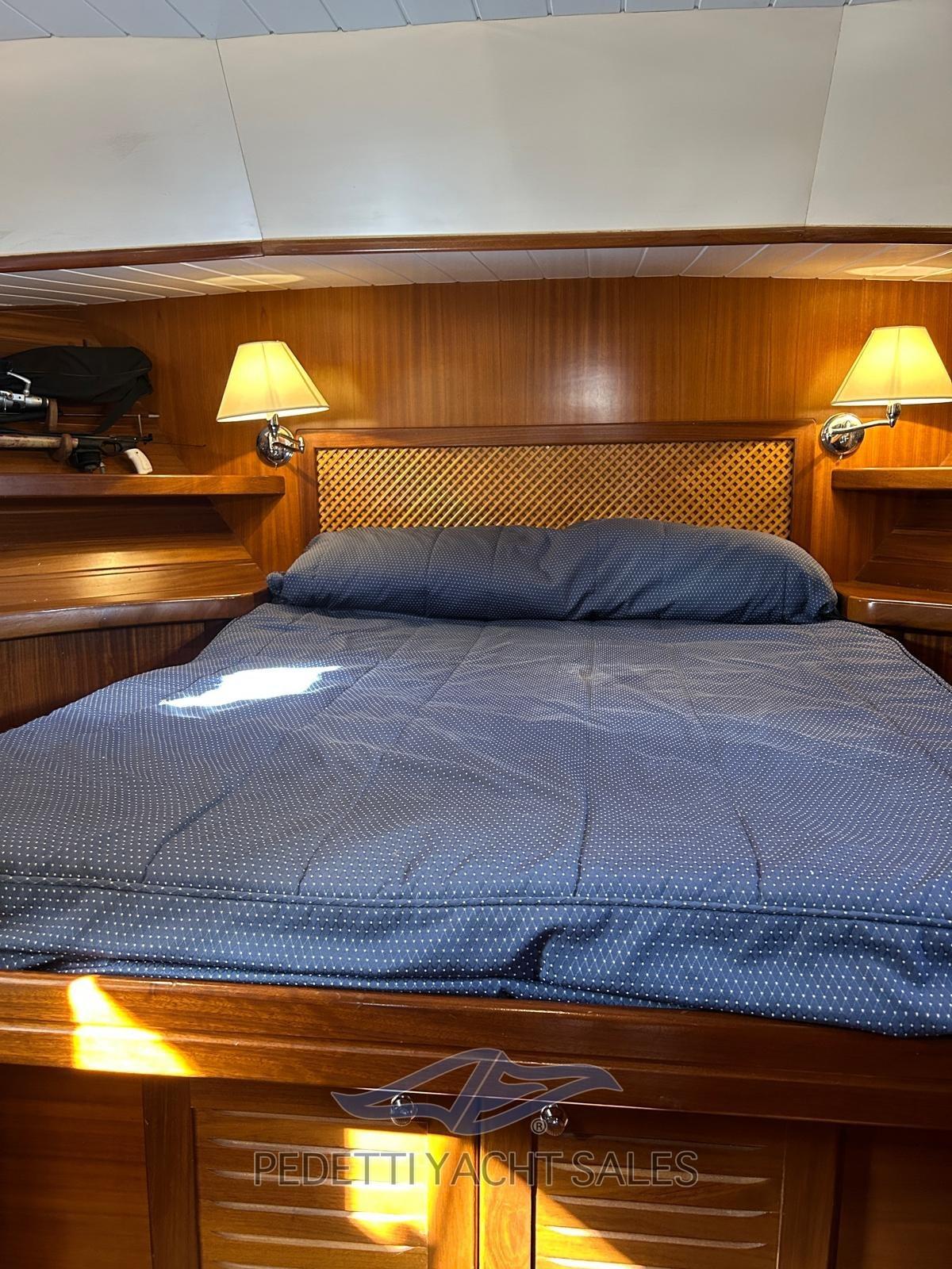 Engine Alarm, Bilge Alarm, Anchor (inox), Water pressure pump, 8 Batteries, 2 Folding cleats, Shore power cable, Special Colour (blue navy), Deck Shower, 2 Secondary Propeller, Directional Spotlight, Outboard engine for tender, 8 Fenders, Gangway (idraulica), Platform (portante), 3 Automatic Bilge Pump, Deck Wash Pump, Seawater Pump, Teak Cockpit, Shorepower connector, Electric Windlass, swimming ladder, Saddles for tender, cockpit table (con 4 sedie regista), Tender (3,40 mt), Horn, Stern Winches.