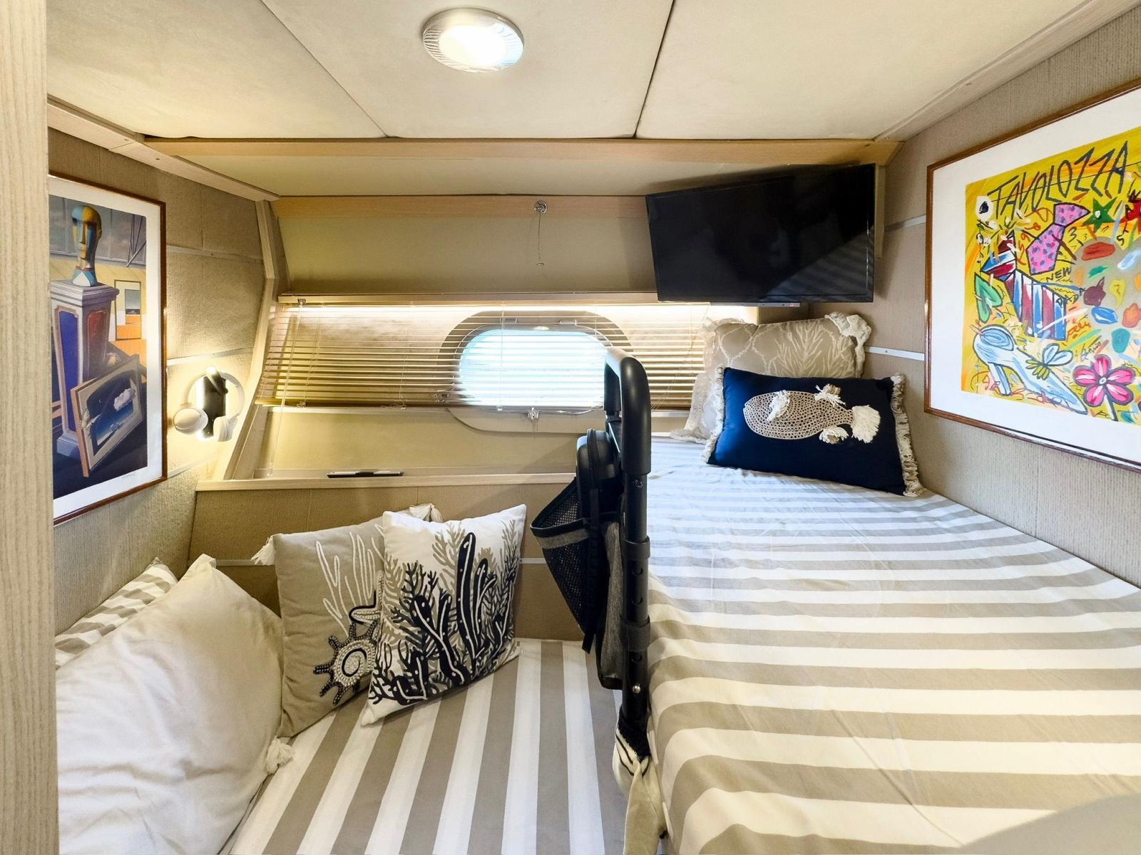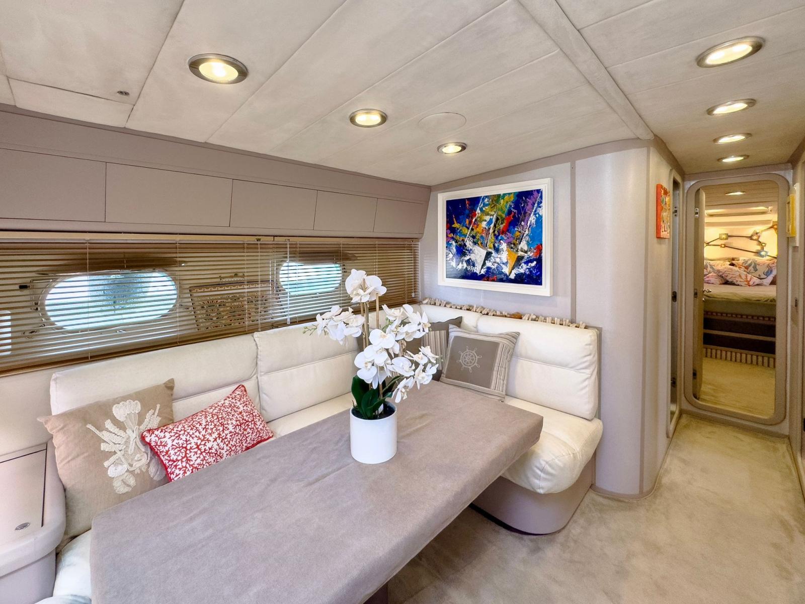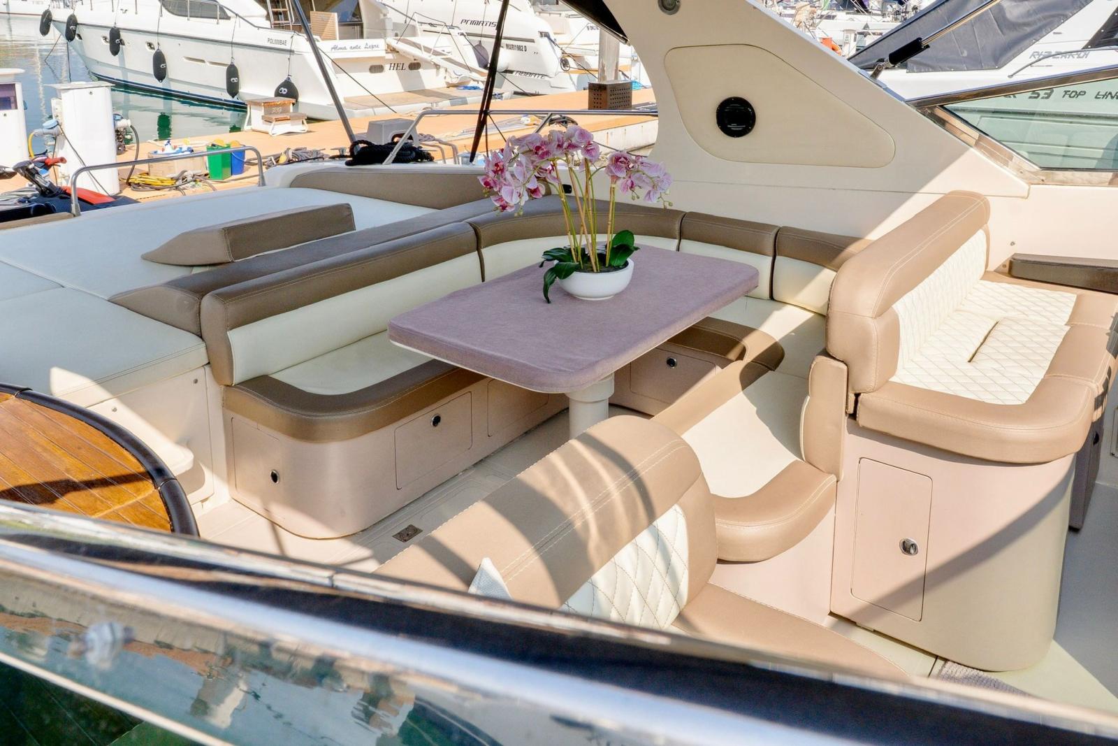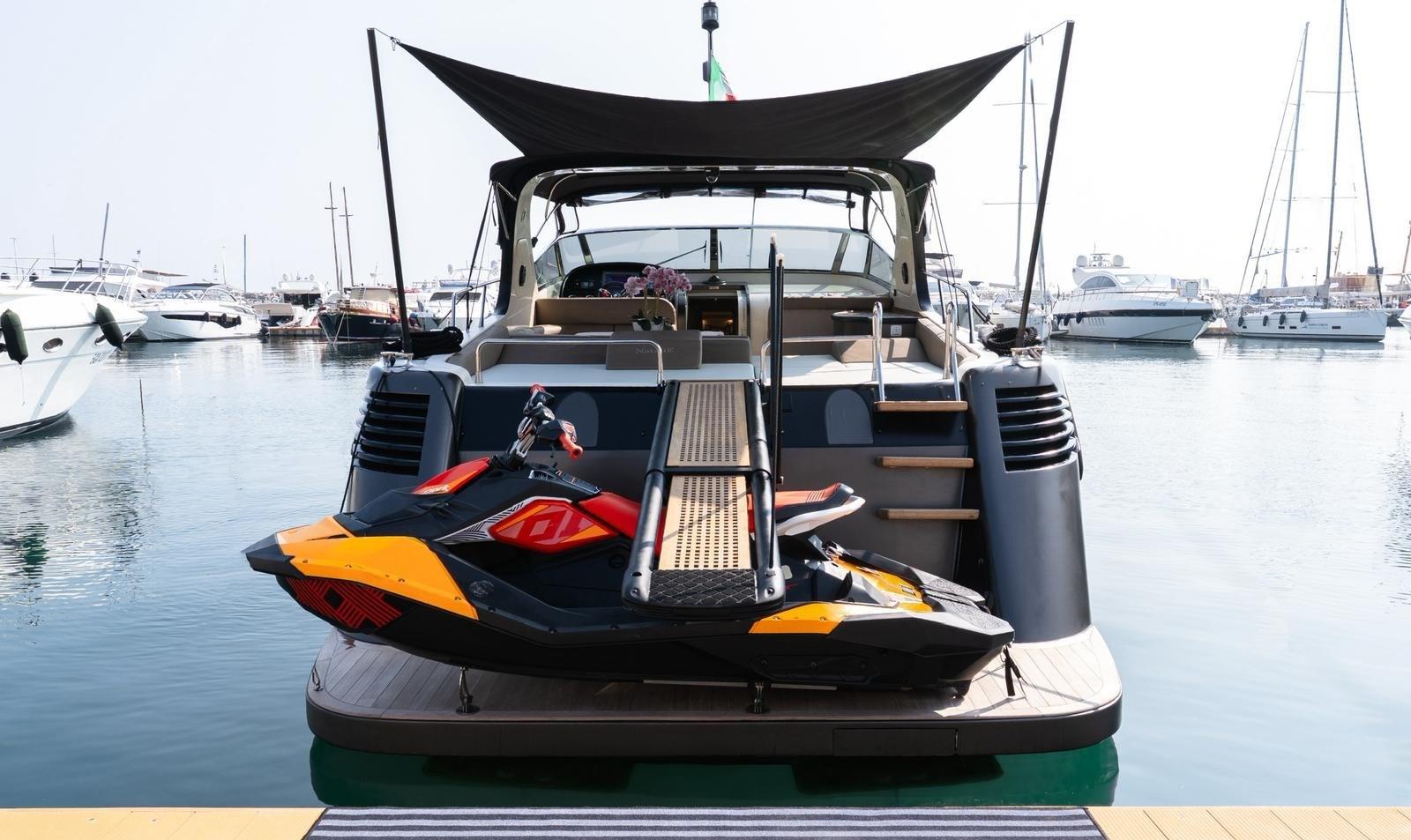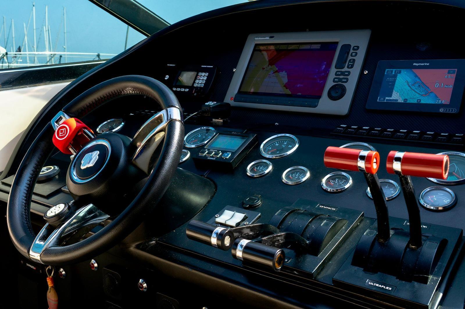 Engine Alarm, Bilge Alarm, Water pressure pump, Draining System, Teak Side Decks, Shore power cable, Special Colour, Deck Shower, Headlights fixed on the stem, Hydraulic Flaps, Fire Extinguishing System, Flaps Indicators, Washbasin in the cockpit, Courtesy Lights, Underwater lights, Fenders, Gangway (idraulica), Platform, Automatic Bilge Pump, Manual Bilge Pump, Teak Cockpit, Shorepower connector, Water harbor connector system, Rollbar, Electric Windlass, swimming ladder, cockpit table, Horn, Stern Winches, Bow Winches.