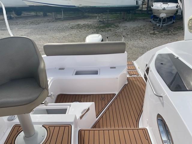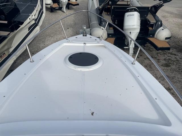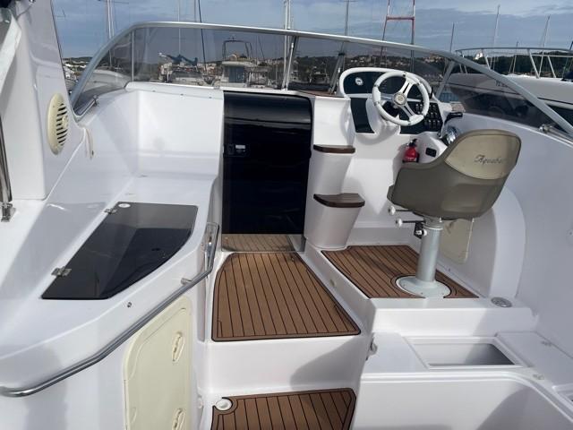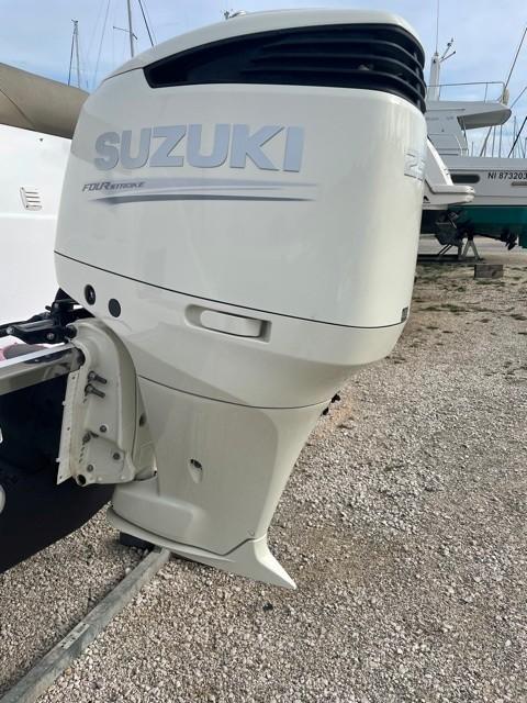 Super SPORT CRUISER 24, a boat that combines performance, comfort, and elegance. It is designed to offer you unforgettable outings at sea. Powered by a SUZUKI DF250APX engine, it can accommodate up to 8 people on board. Year 2021 with 163 hours of navigation. Ideal for sailing enthusiasts looking for a reliable and well-equipped boat. Turnkey ready-to-sail package price – 2-year warranty. SUZUKI DF 250APX engine (163h) petrol. Hydraulic steering system. Fuel tank 200l Equipment Included in the Pack V-shaped polyester hull Double cabin with upholstery + porthole Electric shower/WC compartments with black water tank Storage lockers Sunbathing areas fore/aft Transformable aft seating Daybed Adjustable Bolster-type pilot seat Teak aft cockpit table Stove & sink Cabin table Cockpit shower – fresh water tank 90l Swim platform with ladder Navigation lights, waterproof switches with fuses, Blue courtesy lights Polyester roll bar with Spotlight. Camping tarpaulin, SEA DECK floor covering Shore charger 220v, Battery charger, dual USB and 12v sockets. HUMMIMBIRD HELIX 7 GPS depth finder unit Dometic 50L refrigerator Electric windlass, anchorage Audio pack with 4 speakers Safety equipment pack for 8 people + Mooring pack, fender kit.