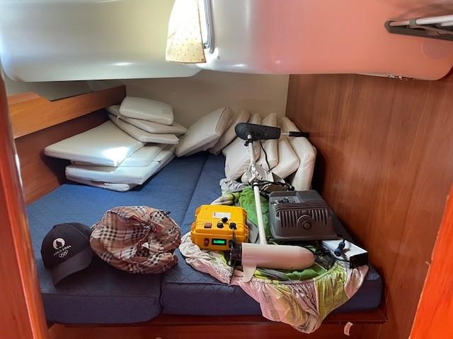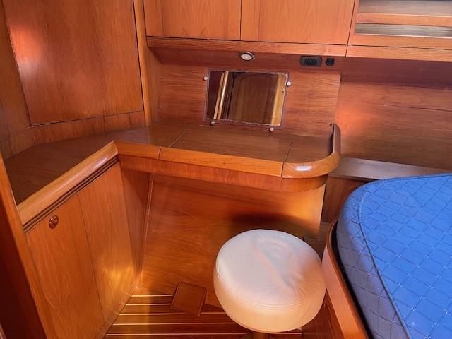 Forward owner's cabin with storage, vanity, wardrobe and separate bathroom with electric toilet, sink, separate shower, black water tank, hot/cold pressurized water.