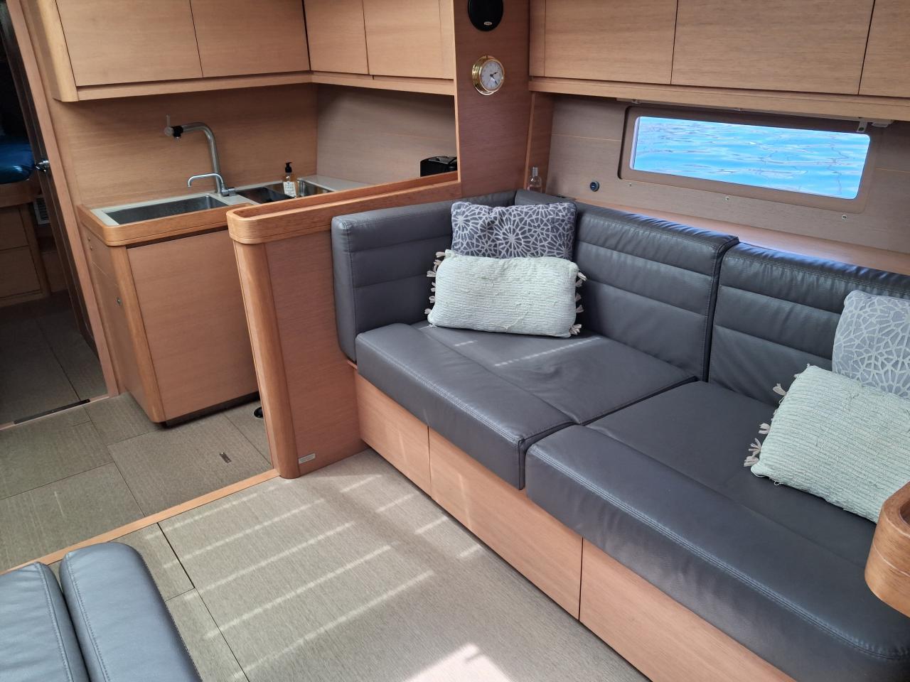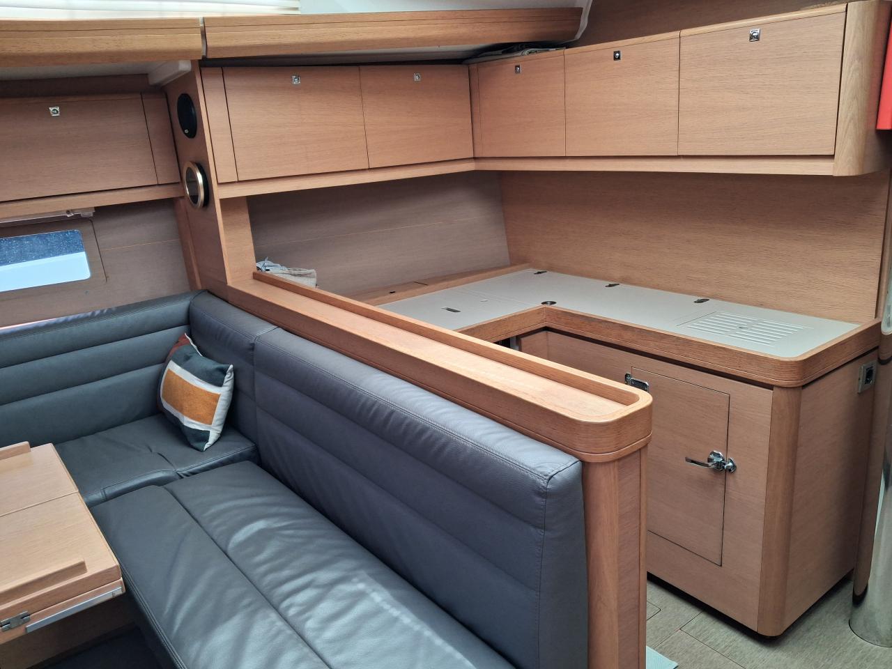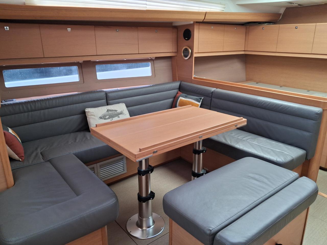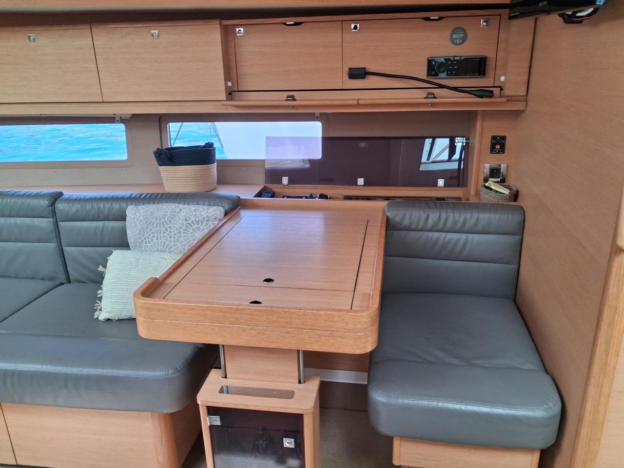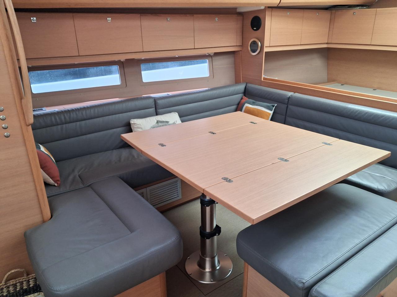 Three-way saloon table and bench seat to port