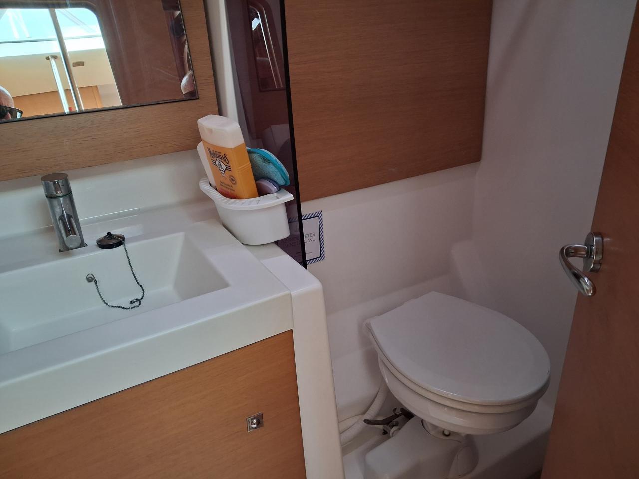 Two aft shower rooms with shower, washbasin and WC, including a large electric toilet to port