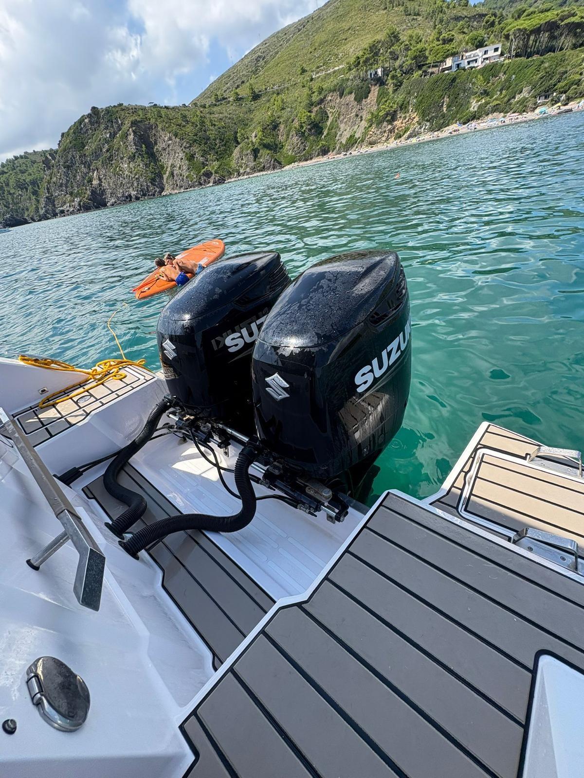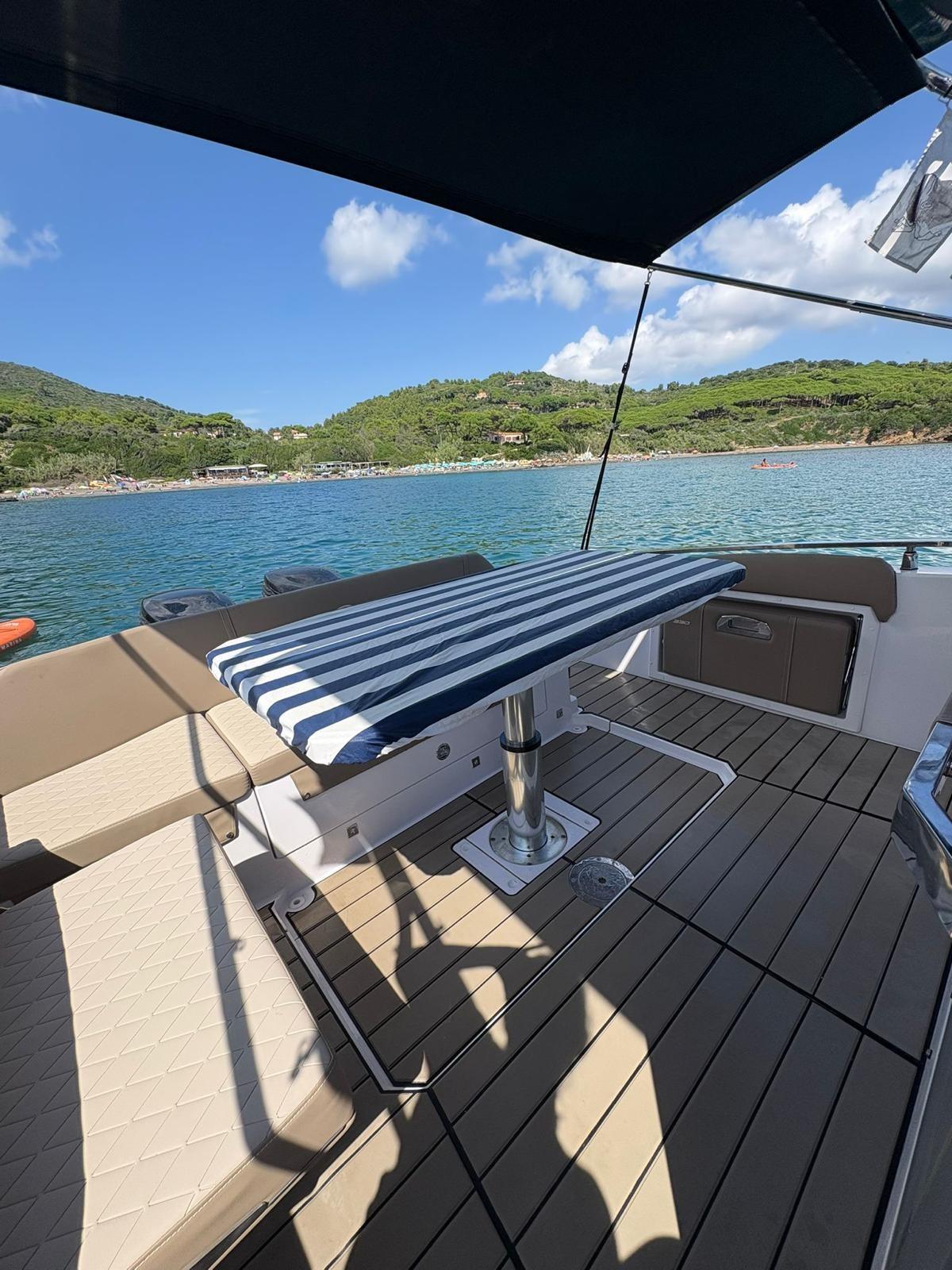 Additional battery system, internal and external LED kit, internal awning kit (made by upholsterer), Garmin 12", stainless steel anchor cubicle, cabin cushions, complete shower system, electric aft table and sundeck kit, GRP platform with telescopic ladder, Luxury upholstery, telescopic cabin table, hydraulic steering, steel hatch, opening bow hatch, 2 additional bollards.