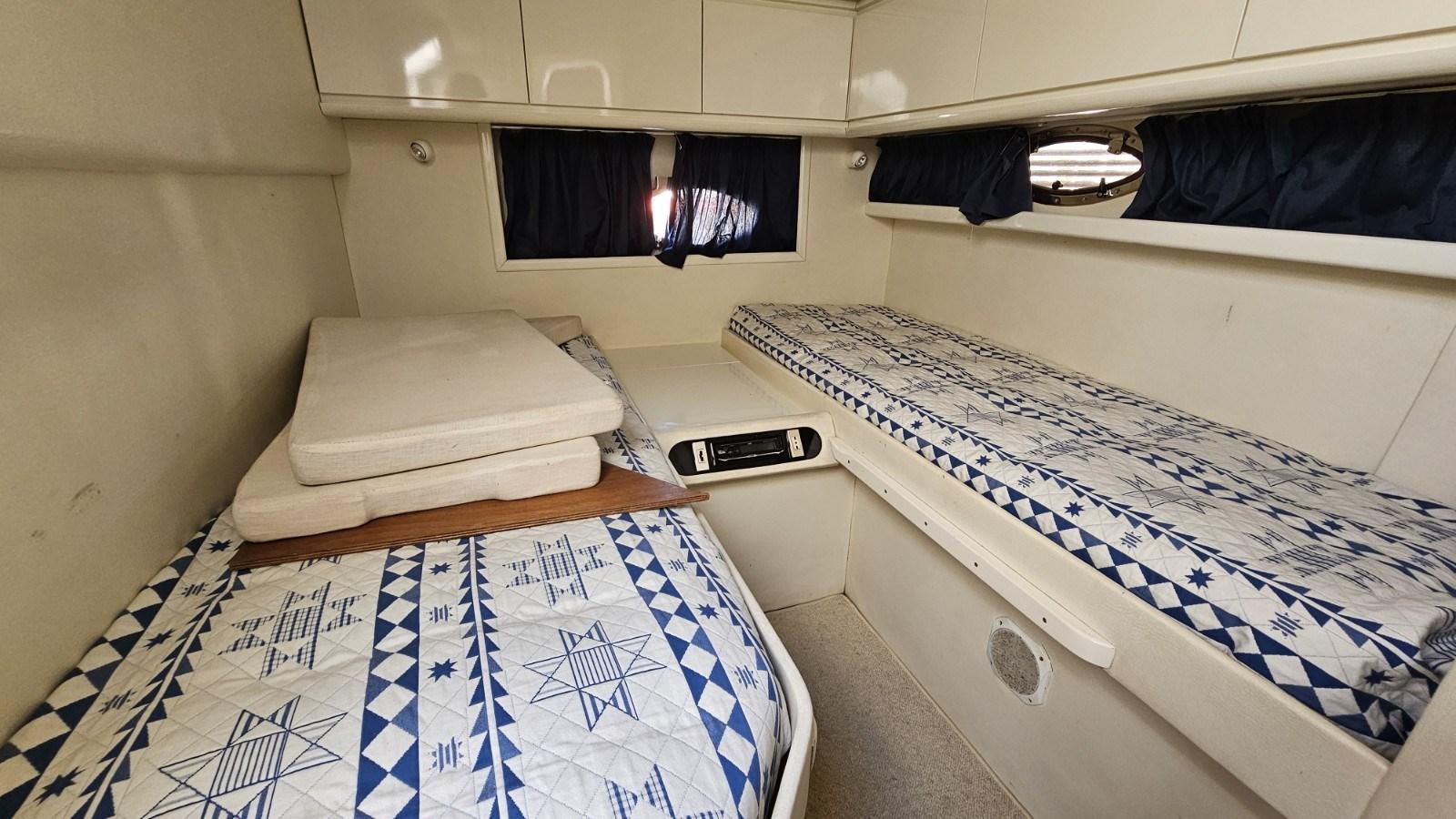Master cabin with double bed and bathroom - guest cabin with two flat beds and bathroom.