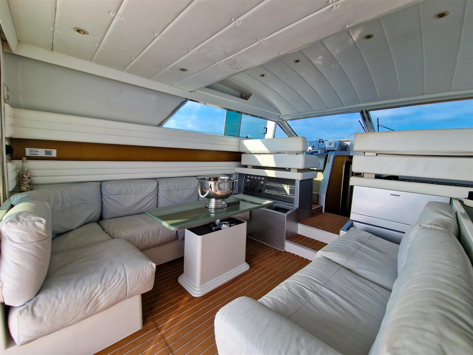 Fume/Gas Detector, 2 Engine Alarm, Bilge Alarm, Water pressure pump, 6 Batteries (150ah), Shore power cable, Guard rail, Deck Shower, Twin Steering, Headlights fixed on the stem, 2 Electric Flaps, 2 Flaps Indicators, Anchor Chain Washdown, Washbasin in the cockpit, Courtesy Lights, Fenders, Gangway, Platform, Automatic Bilge Pump, Entry door, Shorepower connector, Water harbor connector system, Electric Windlass, swimming ladder, cockpit table, Living Room Foldable Table, guard rails with gates, Horn, Bow Winches.