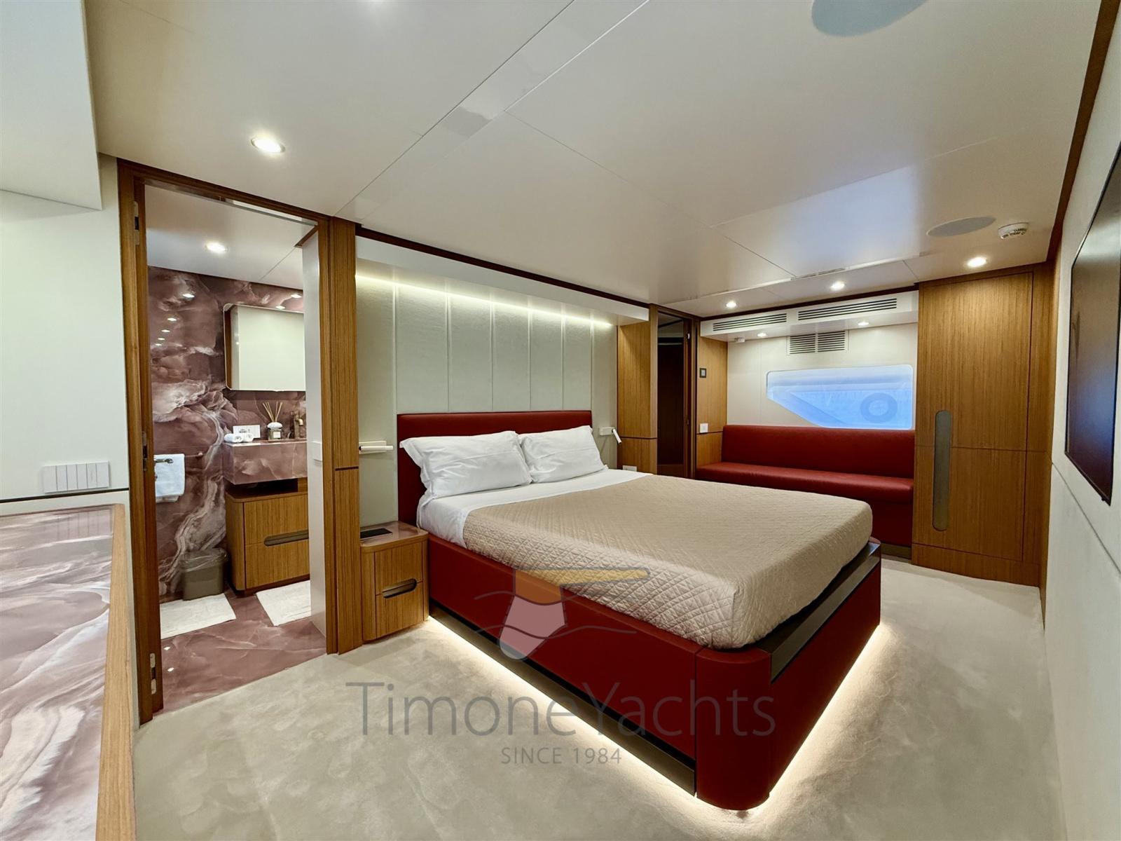 The main salon then is an overwater villa itself, with windows that big it will be hard to distinguish the insideout. The enormous salon has two niches amidship, those will favour your guests' boarding in style while alongside at port. Upfront the main deck there's clearly the master apartment where, well yes, there's an electrically openable glass door that gets you out on the front deck. Not to consider the large entrance corridor the master area starts wth.