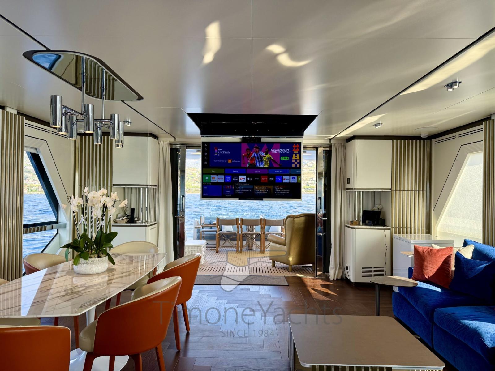 Speakers, Satellite TV antenna, Home Theater, 2 TV Lift Mechanism (folding down from ceiling, 1 in salon and 1 in master cabin), Radio AM/FM, Hi-Fi, 5 TV.