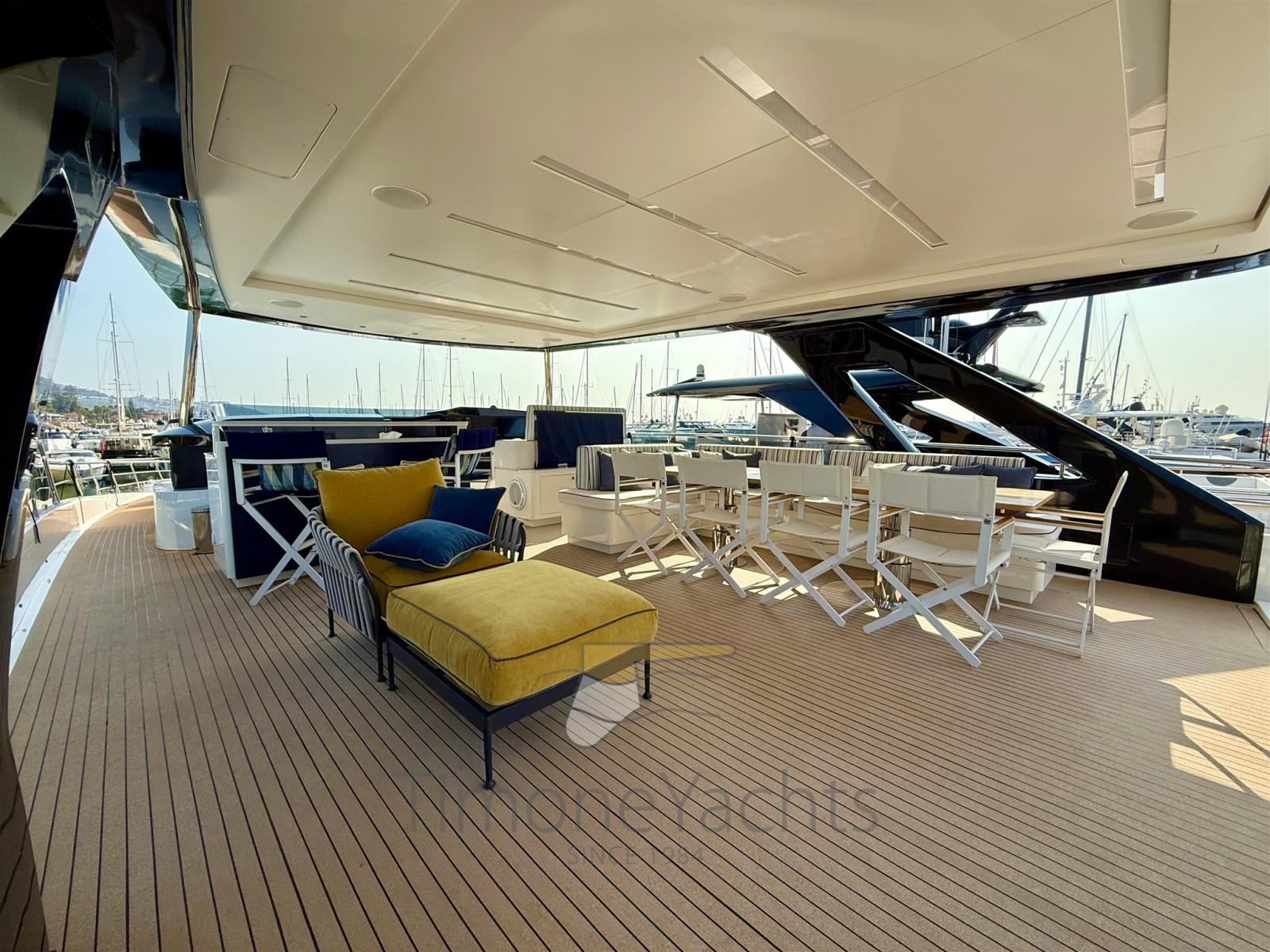 18/19 kts continous cruise speed and a 25kts max will take you effortlessly all over the Med. Your sailing is smooth up on a flybridge simply extraordinary; one sole deck developing all the way around the social core of the unit. Dining areas, sunbathing areas, bar unit and luxurious outdoor furnitures are flowing together in one as its hard to find on a yacht this size.