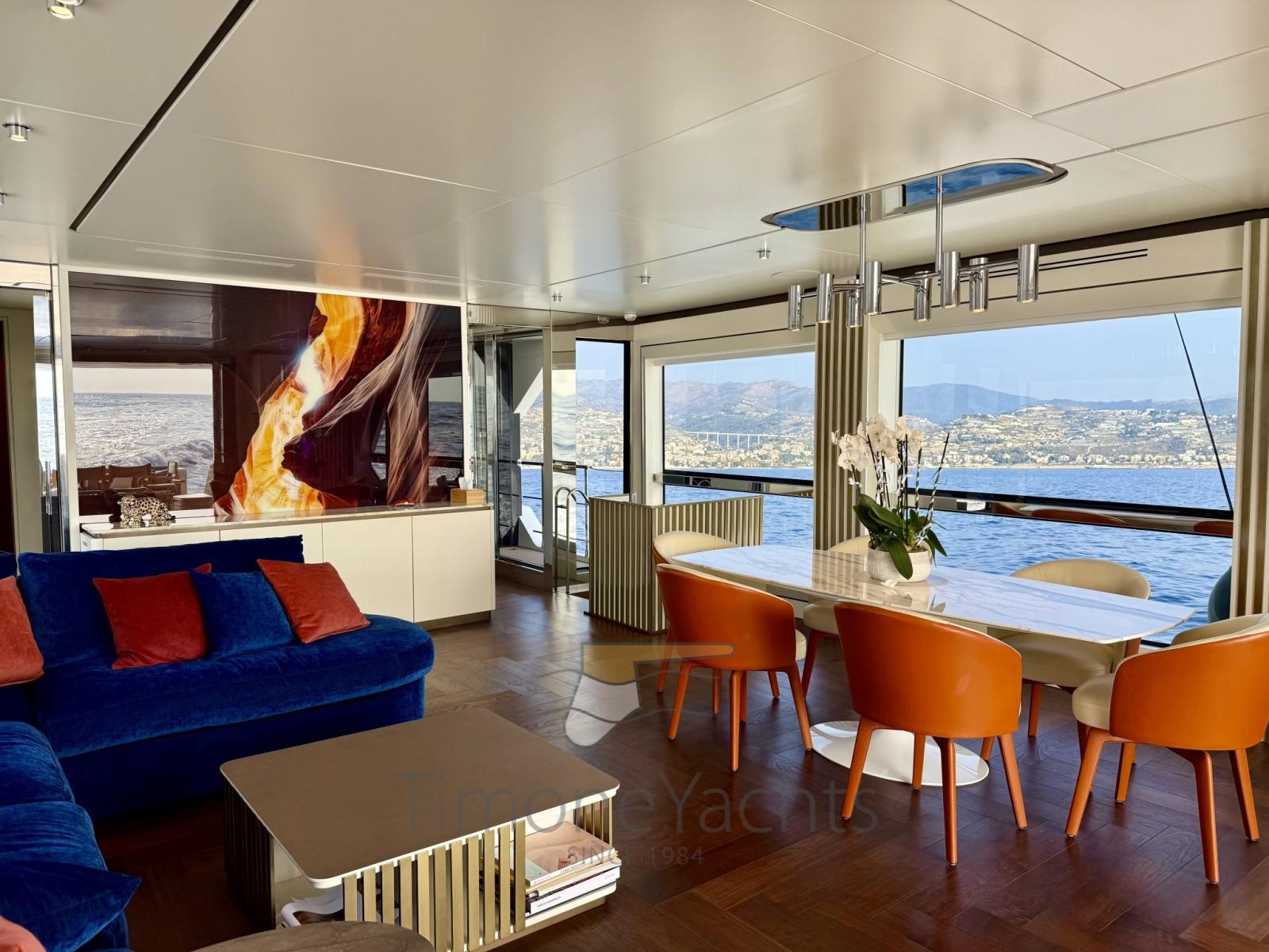 The audio video system is the best you can have today, tvs fold down from ceilings and ipads control sound and images throughout the vessel. The tender has its own garage and the jetski can eventually stay on the up/down platform, where a modern style chaise longues area is.