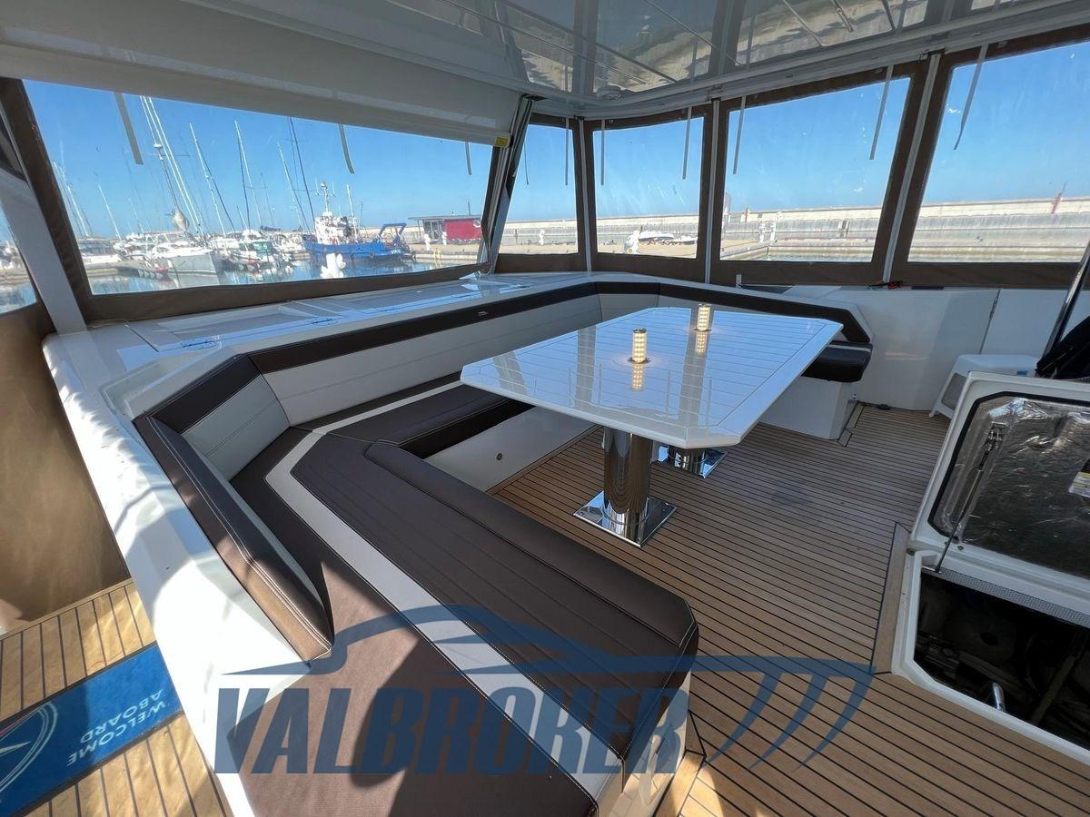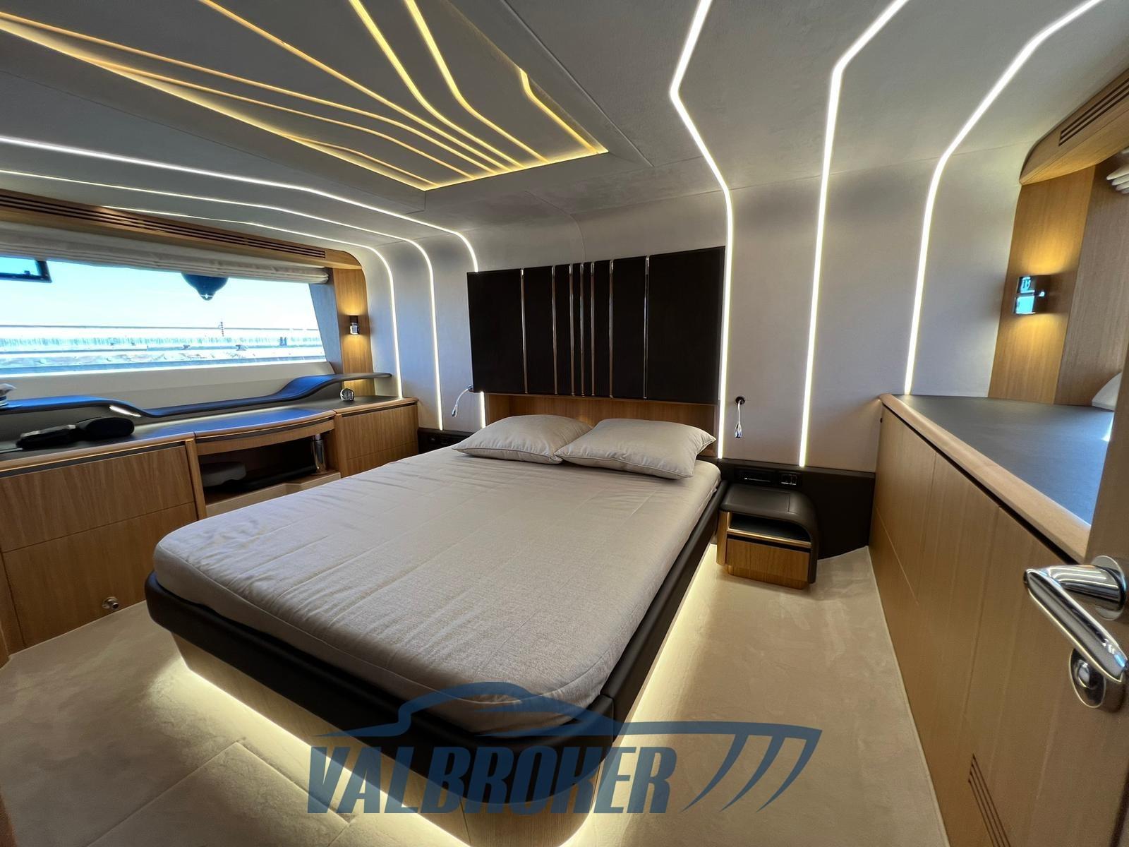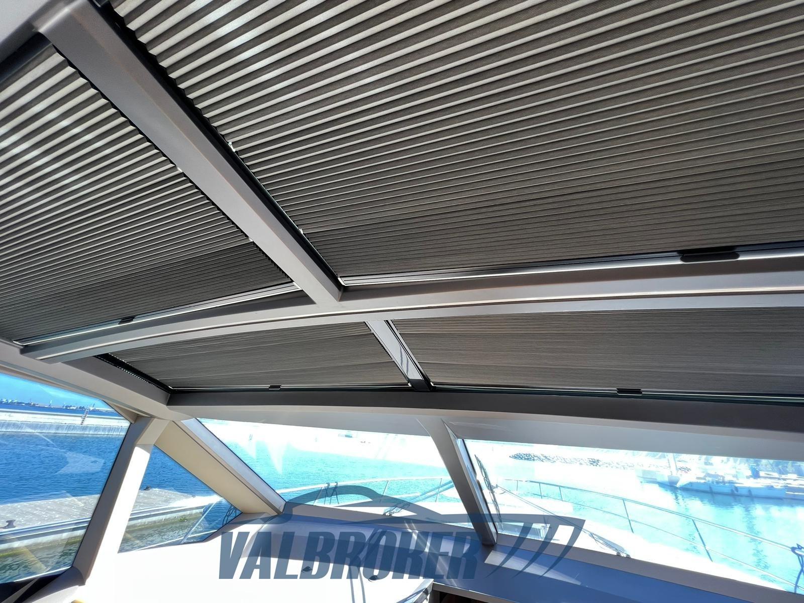 A full-beam master cabin with its own en-suite bathroom has a separate entrance from the saloon. The VIP cabin is located in the bow and two equipped double cabins, the other with an en-suite bathroom. The hardtop is equipped with an electrically operated soft top to allow for sun/shade.