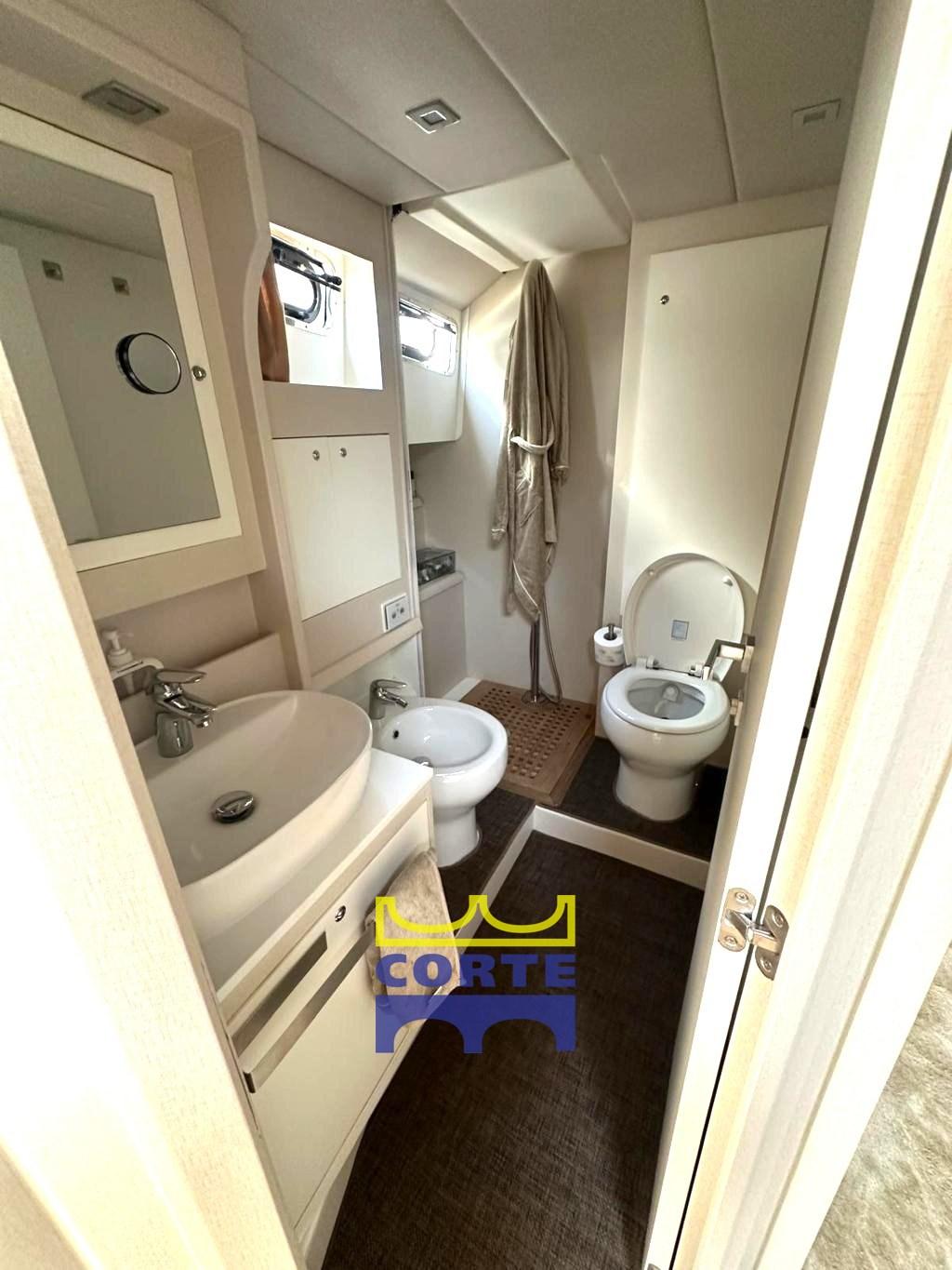 Fume/Gas Detector, Engine Alarm, Bilge Alarm, Water pressure pump, Teak Side Decks, Shore power cable, Special Colour, Guard rail, Deck Shower, Directional Spotlight, Hydraulic Flaps, Hard top, Fire Extinguishing System, Flaps Indicators, Washbasin in the cockpit, Courtesy Lights, Underwater lights, Gangway (elettroidraulica a scomparsa), Platform (di poppa in teak), Automatic Bilge Pump, Teak deck, Entry door, Teak Cockpit, Shorepower connector, Water harbor connector system, Electric Windlass, swimming ladder, cockpit table, Horn, 2 Stern Winches (Quick), Bow Winches.