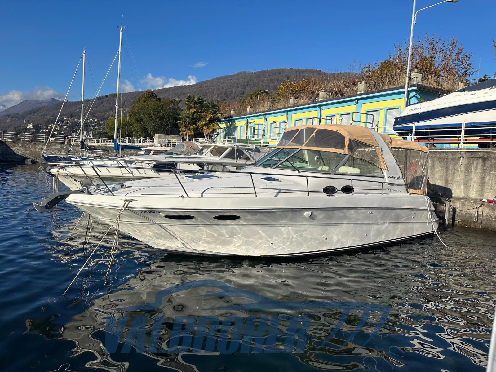 American shipyard with a sporty line with a large cockpit and generous interior spaces. Full cabin height, immaculate interior. 2x 300 Mercruiser MAG 350 V8 Mercruiser petrol shaft drive with V drive. Visible on Lake Maggiore. Boat not plated.