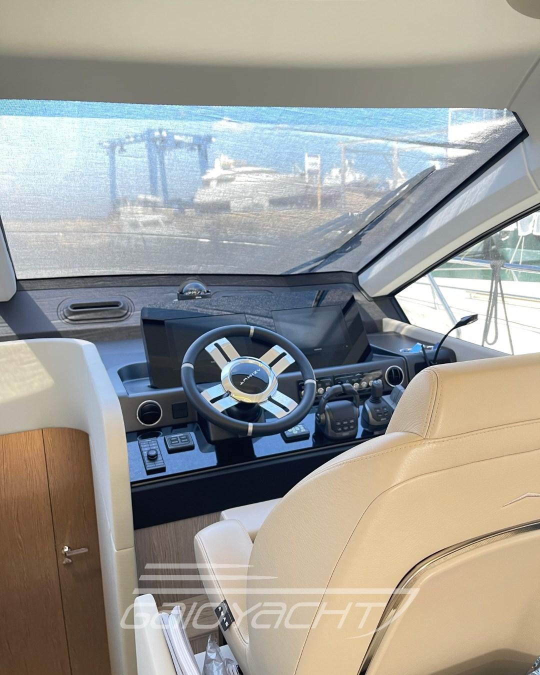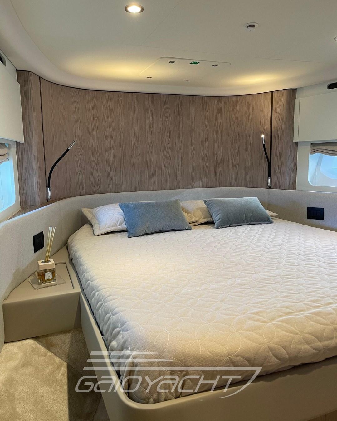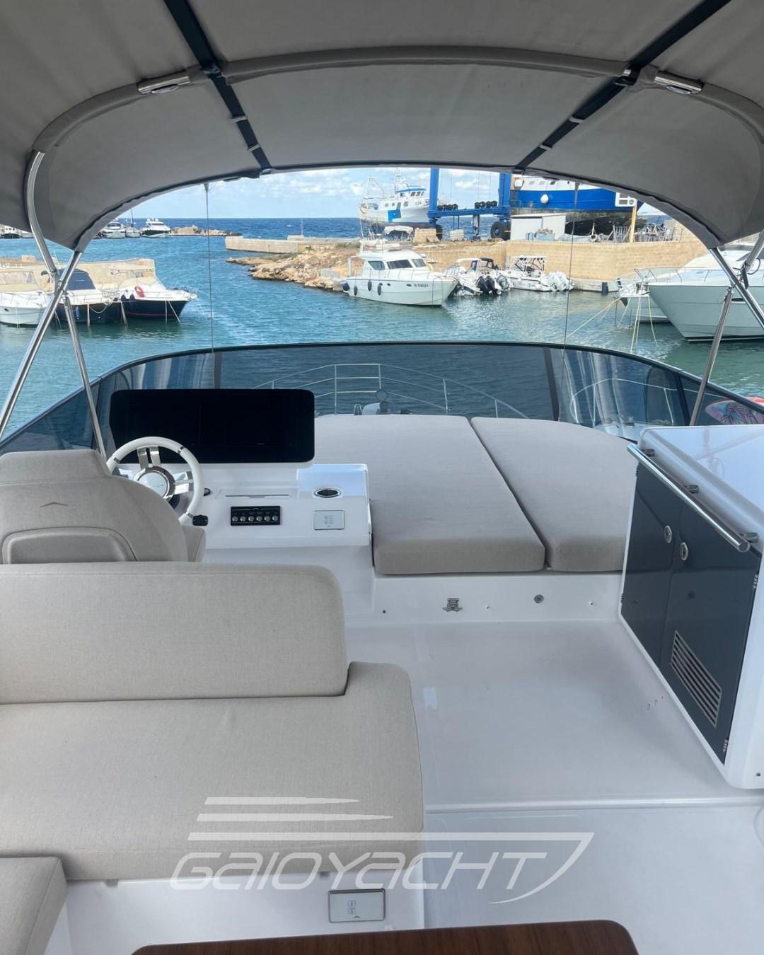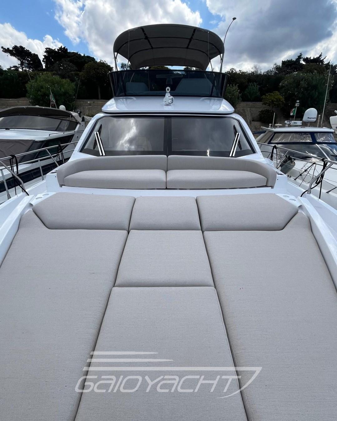 Volvo Interceptor system automatic; Sunbathing cover at the bow; Outdoor cover (chairs, dashboard, sofa and flybridge); Dual Racor Filter for Engines, Racor Filter for Generator; Winches for manhole mooring; Additional electrical conduit; Galvanic isolator; Mesh window covers for windshield and side windows; Miele appliances; Flagpole; Flybridge table with teak ups and downs and opening top; Mobile fly equipped with fridge and barbecue; Bathing platform in blockboard teak; External cushions in Batyline fabric; Blackout roller blind in the owner's cabin; Fabric Roman blinds in the cabins instead of Venetian blinds (with blackout fabric only in the VIP and guest cabins); Garmin AIS 800; Smart audio - video package; Crew cabin.