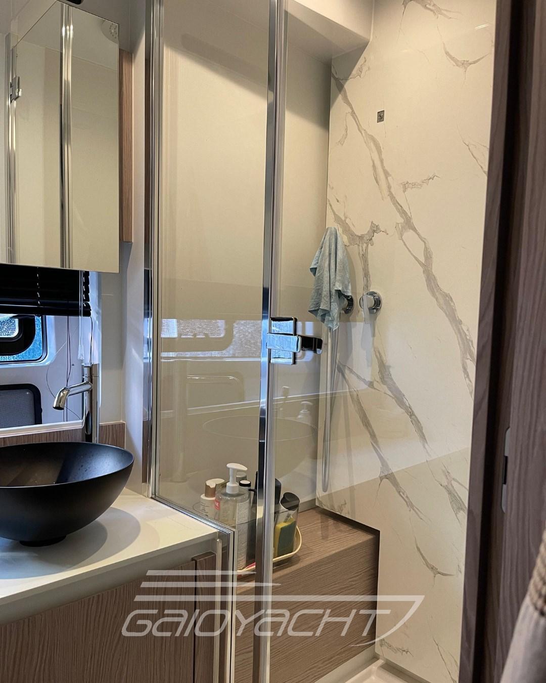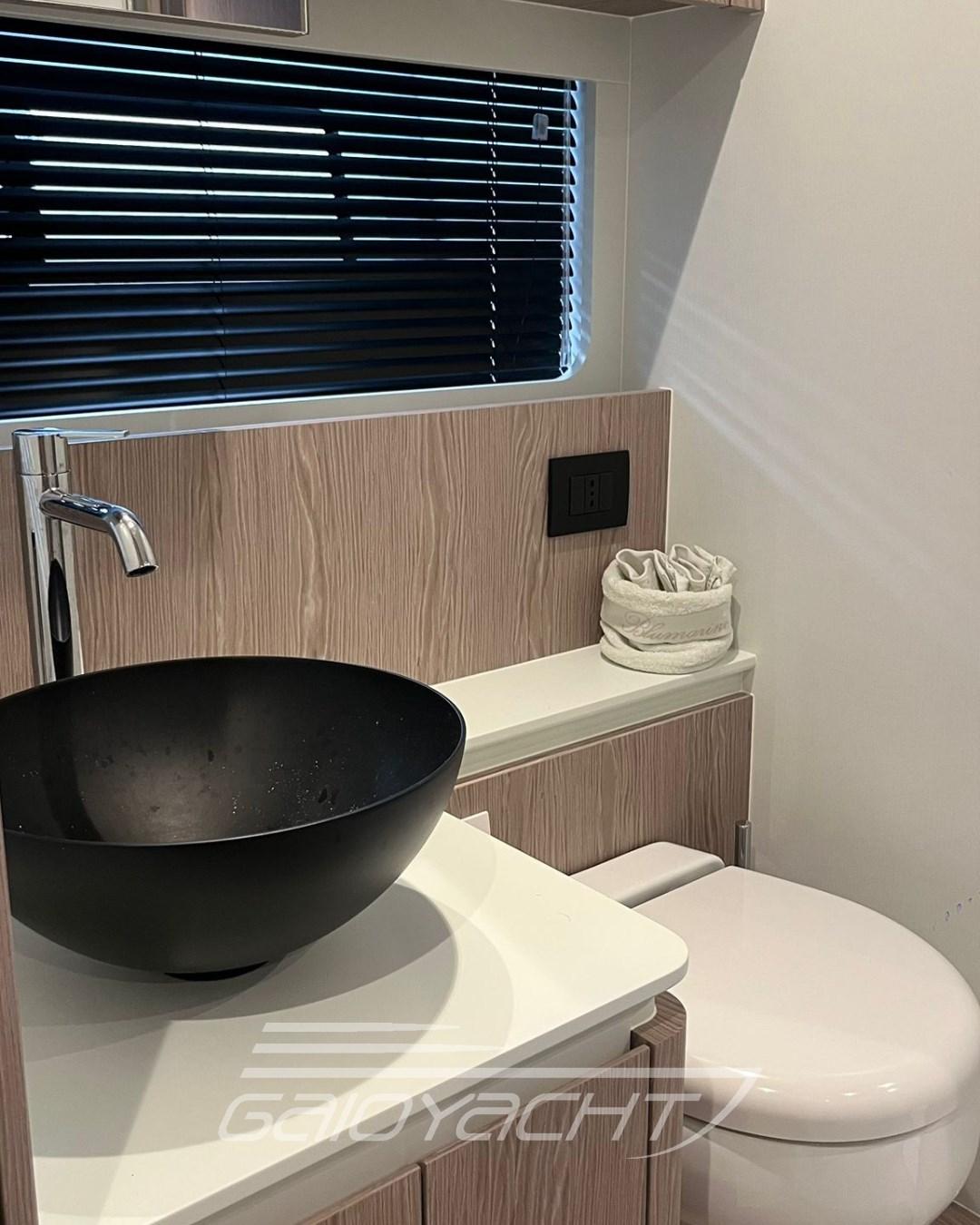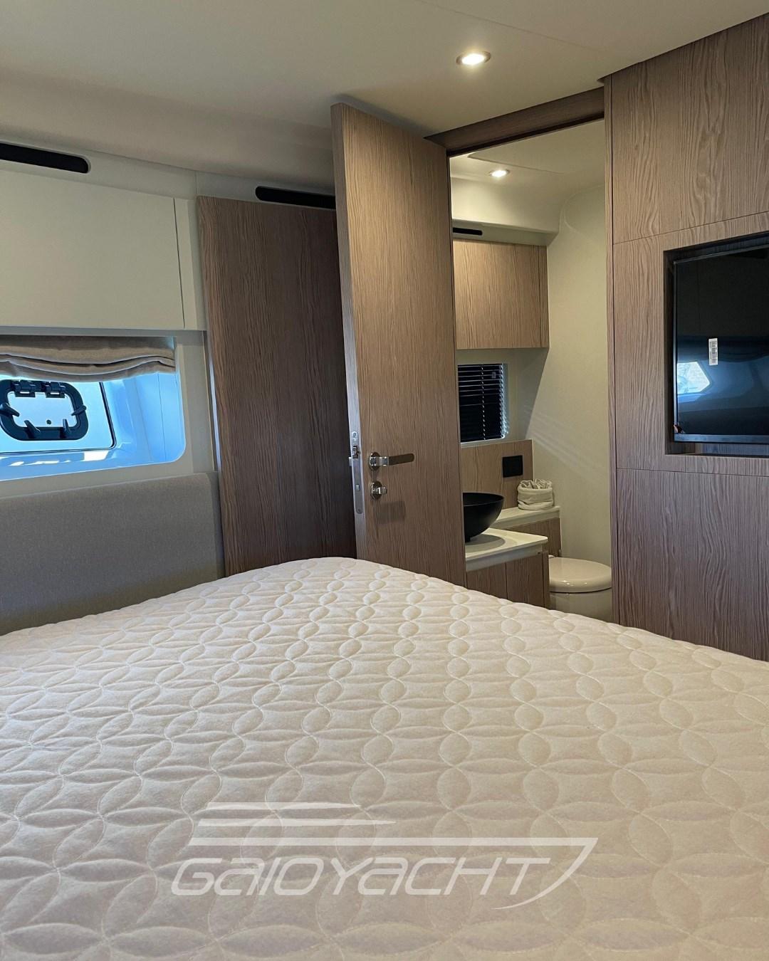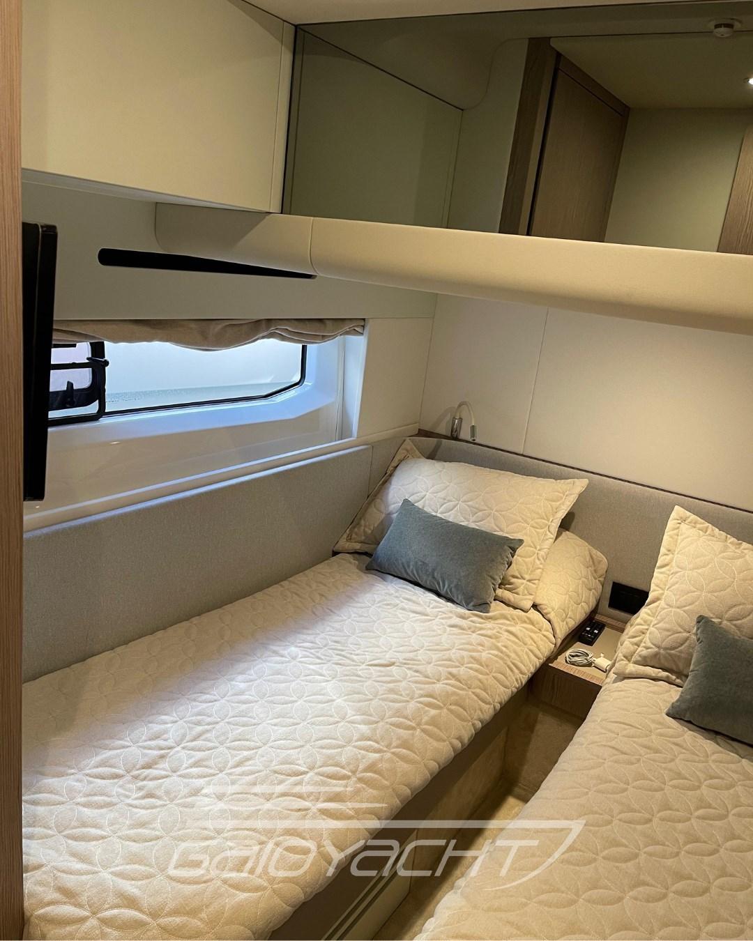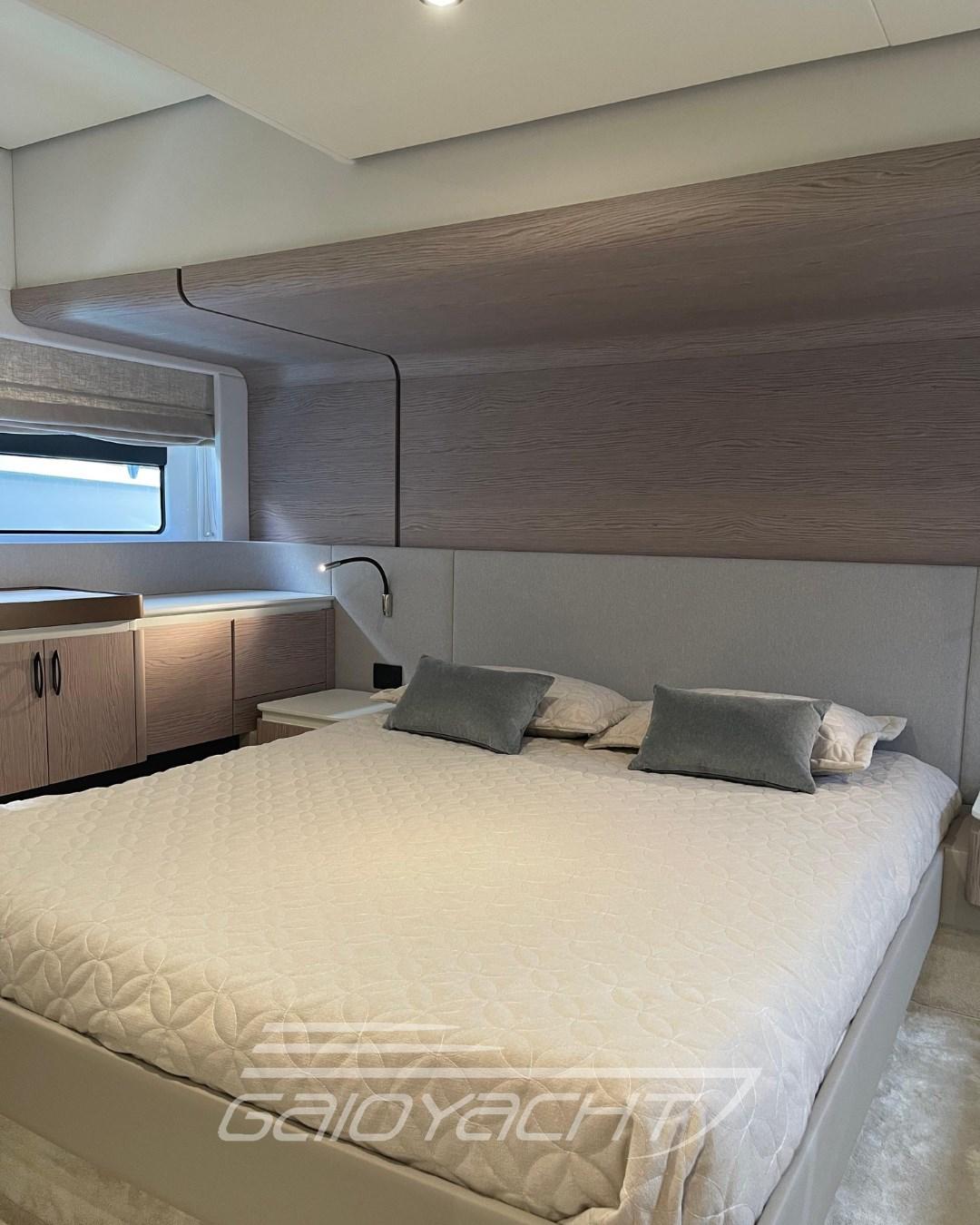 Volvo Interceptor system automatic; Sunbathing cover at the bow; Outdoor cover (chairs, dashboard, sofa and flybridge); Dual Racor Filter for Engines, Racor Filter for Generator; Winches for manhole mooring; Additional electrical conduit; Galvanic isolator; Mesh window covers for windshield and side windows; Miele appliances; Flagpole; Flybridge table with teak ups and downs and opening top; Mobile fly equipped with fridge and barbecue; Bathing platform in blockboard teak; External cushions in Batyline fabric; Blackout roller blind in the owner's cabin; Fabric Roman blinds in the cabins instead of Venetian blinds (with blackout fabric only in the VIP and guest cabins); Garmin AIS 800; Smart audio - video package; Crew cabin.