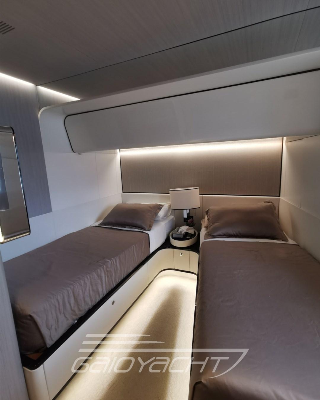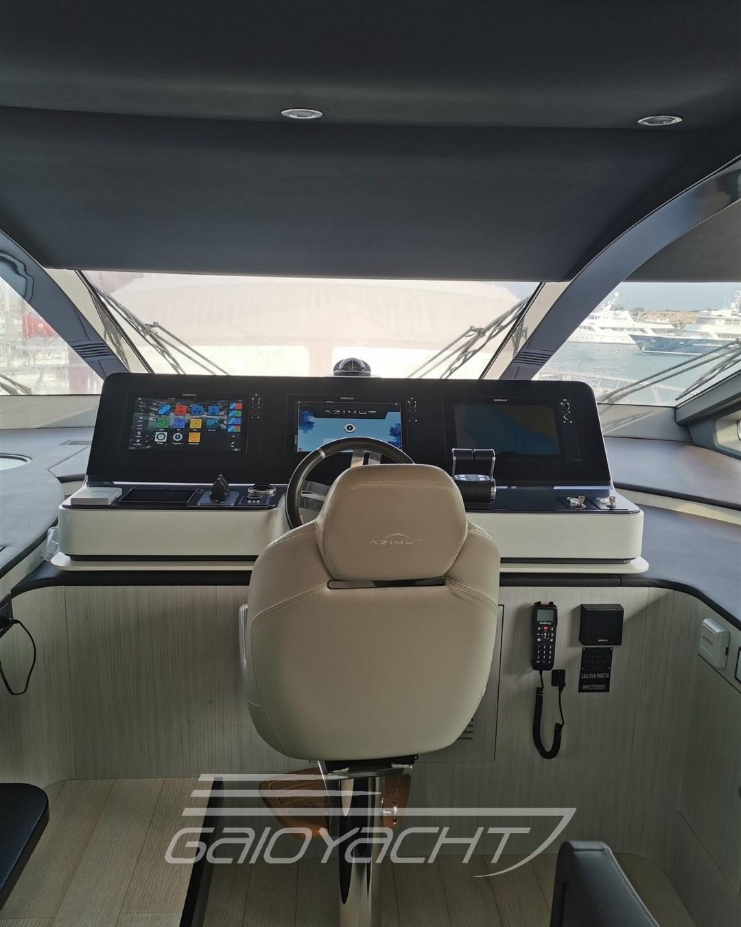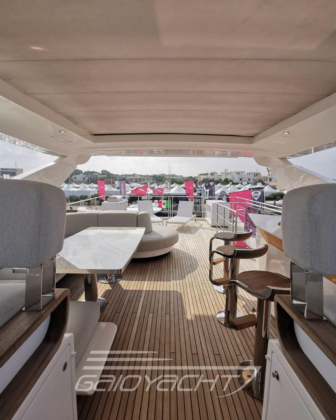 Teak Side Decks, Deck Shower (mobile bar sul Fly), Twin Steering, Directional Spotlight, Tender Garage, Hard top, Courtesy Lights, 6 Underwater lights, Gangway, Platform, Teak Cockpit (e fly), Shorepower connector, Water harbor connector system, Electric Windlass, swimming ladder, Stabilizers (Zerospeed), cockpit table (Dekton, tavolo Dekton sul Fly e a prua).