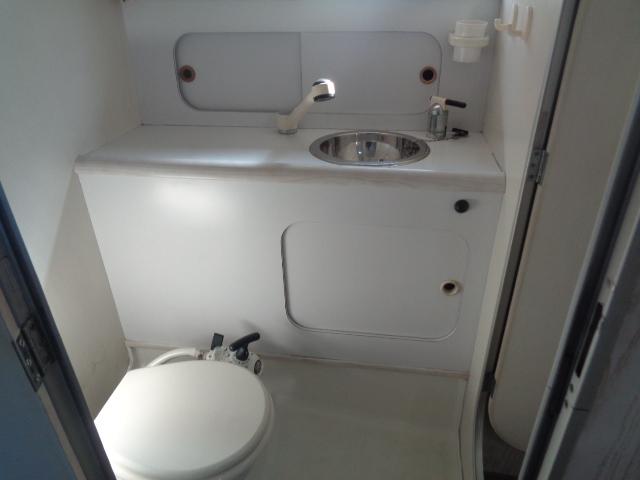 Bathroom including a sink, marine toilet, shower with hot/cold pressurized water.