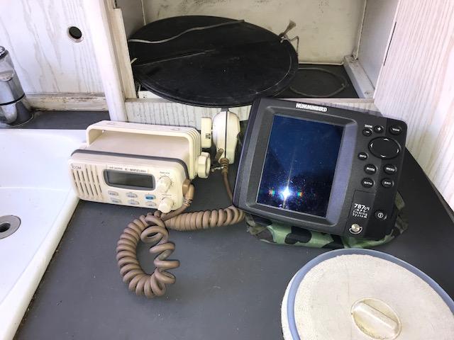 Hummimbird depth sounder (2007), ICOM VHF, 2 new batteries (2023), automatic Cristec charger, navigation lights, Vétus 35Kgs bow thruster, Int/ext table, rear swim platform with ladder, electric and manual bilge pump.