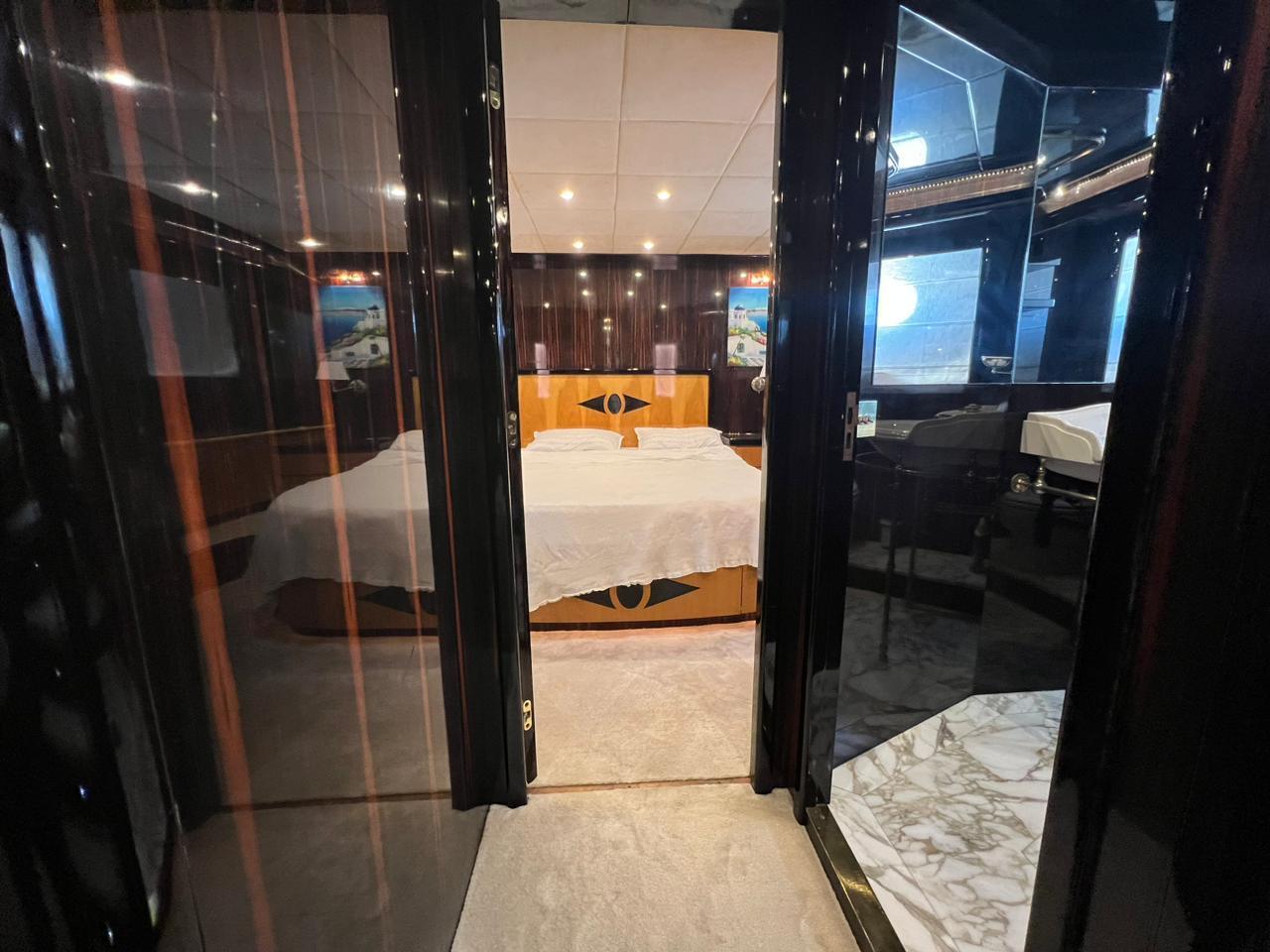 She can accommodate up to 6 guests in 3 staterooms, with 3 crew members waiting on their every need. Her outdoor deck features an al fresco dining area next to the main saloon, a small galley with a fridge, barbecue and wash basin; and an additional large seating area that also doubles as a solarium. On the bow is a large solarium that hides below it a big Jacuzzi for 4 persons. A large Bikini tent covers the entire area.