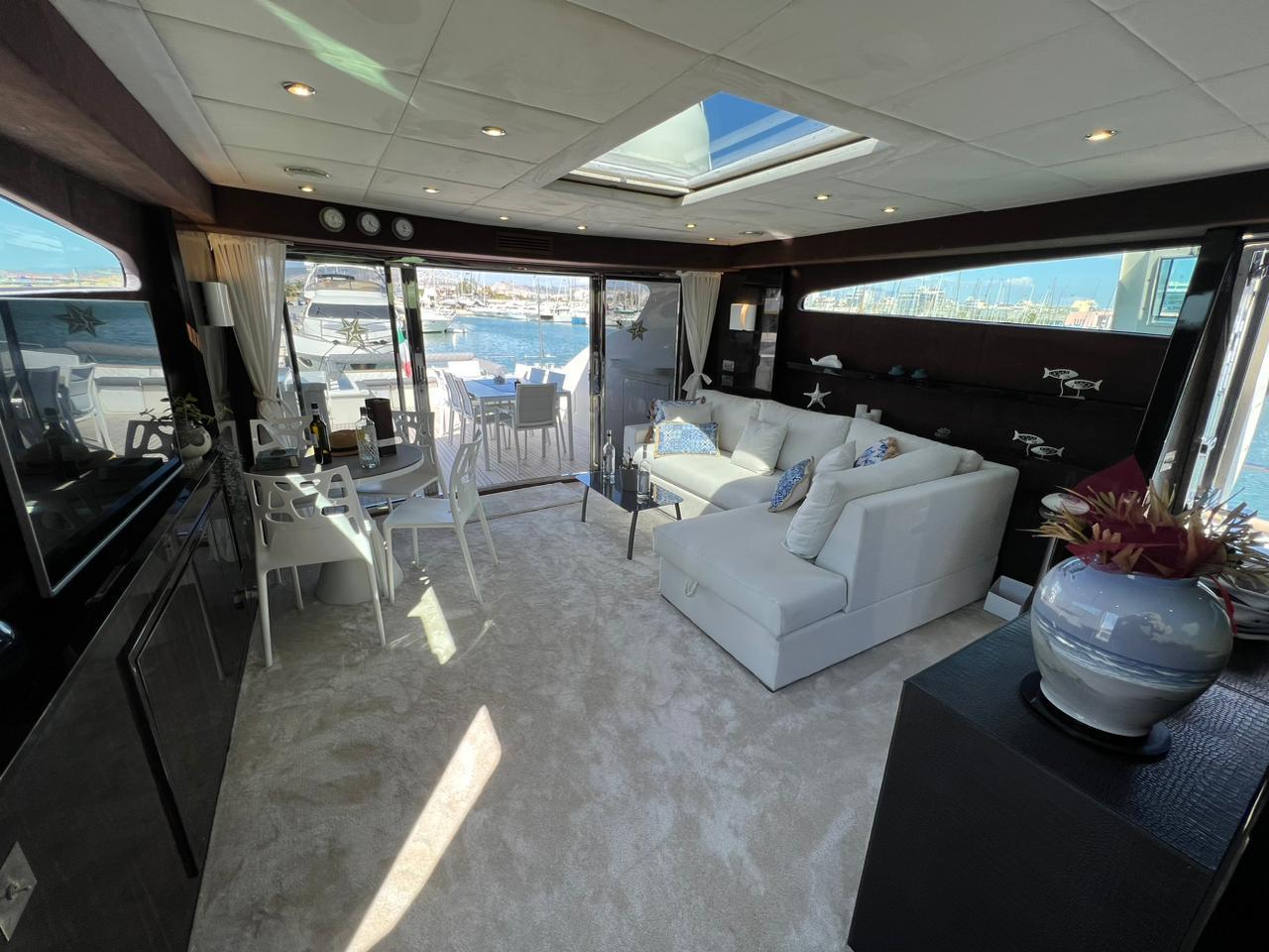 In the main salon found on the main deck, a large and comfortable L shaped sofa is facing the big TV and a small dining area for those windy days. Below deck there is a central large corridor leading to a full beam aft Master stateroom where a separate dressing room and big bathroom with marble shower. The front VIP stateroom with ensuite and big wardrobe is located on the other end of the corridor. The third Guest stateroom with ensuite head is on the port side, and the Galley is on the starboard side.