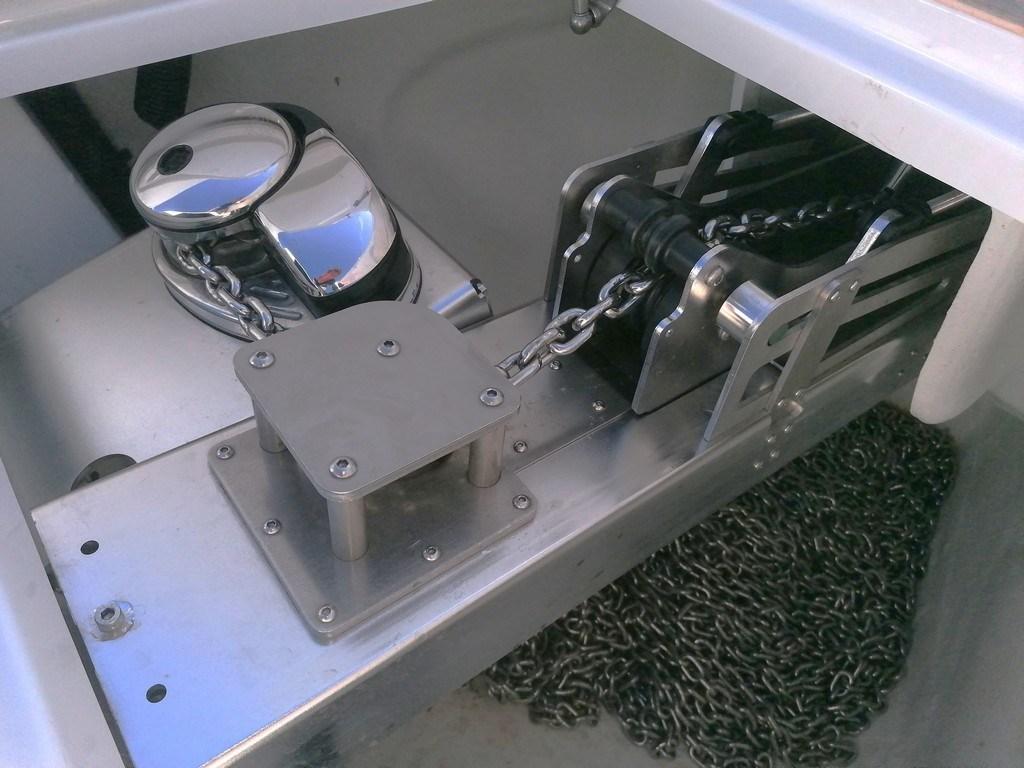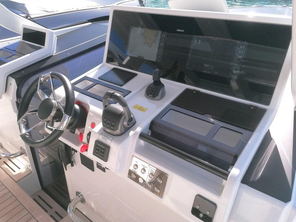 AIS ((option) Simrad NAIS500), Rudder angle indicator, 2 Electronic engine control (Volvo 2,5" engine + EVC), Chain counter ((option) Quick), Display (Volvo multifunction 7" display), DSC vhf (Simrad VHF RS100, with VHF antenna and splitter for FM/AIS), Joystick (Volvo), Autopilot ((option) Simrad with electronic compass), Chartplotter (Simrad multifunction display NSS evo3-12" at dashboard with DST transducer), Radar ((option) Simrad HALO20+), Sonar (Simrad Sonarhub Sounder).