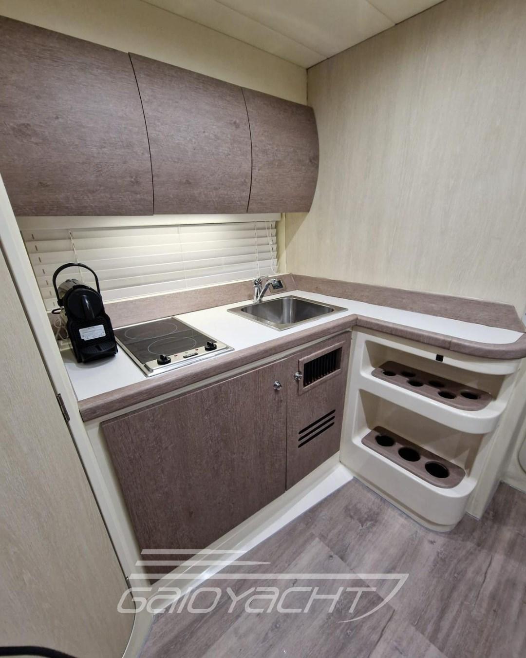 Flaps; Electric handcuffs; Complete Volvo Penta on-board instrumentation; External induction kitchenette (cockpit) with two burners and convenient sink; External kitchen cabinet (cockpit); Double fridge; Induction dinette kitchen plate with two burners; TV system in the cockpit and with TV in the owner's room; Hi-Fi radio.