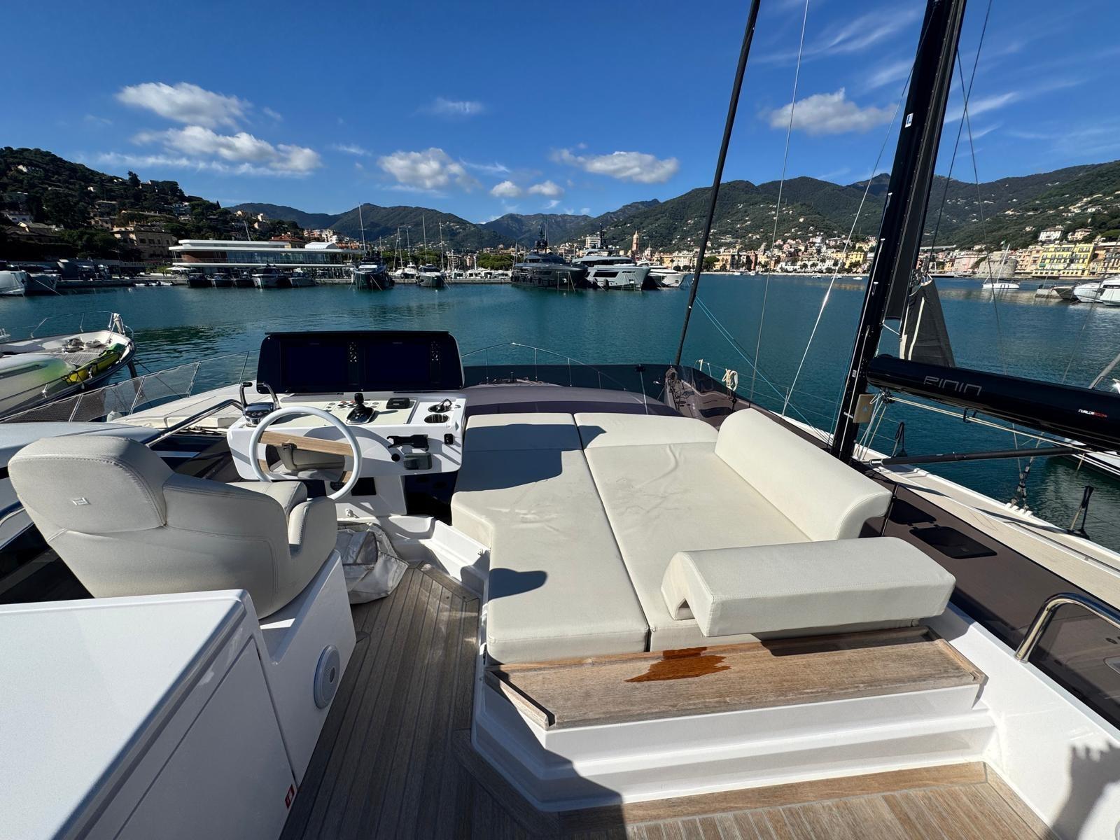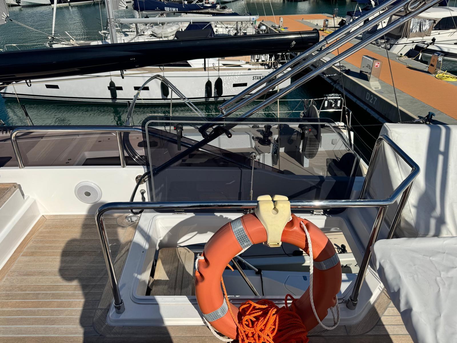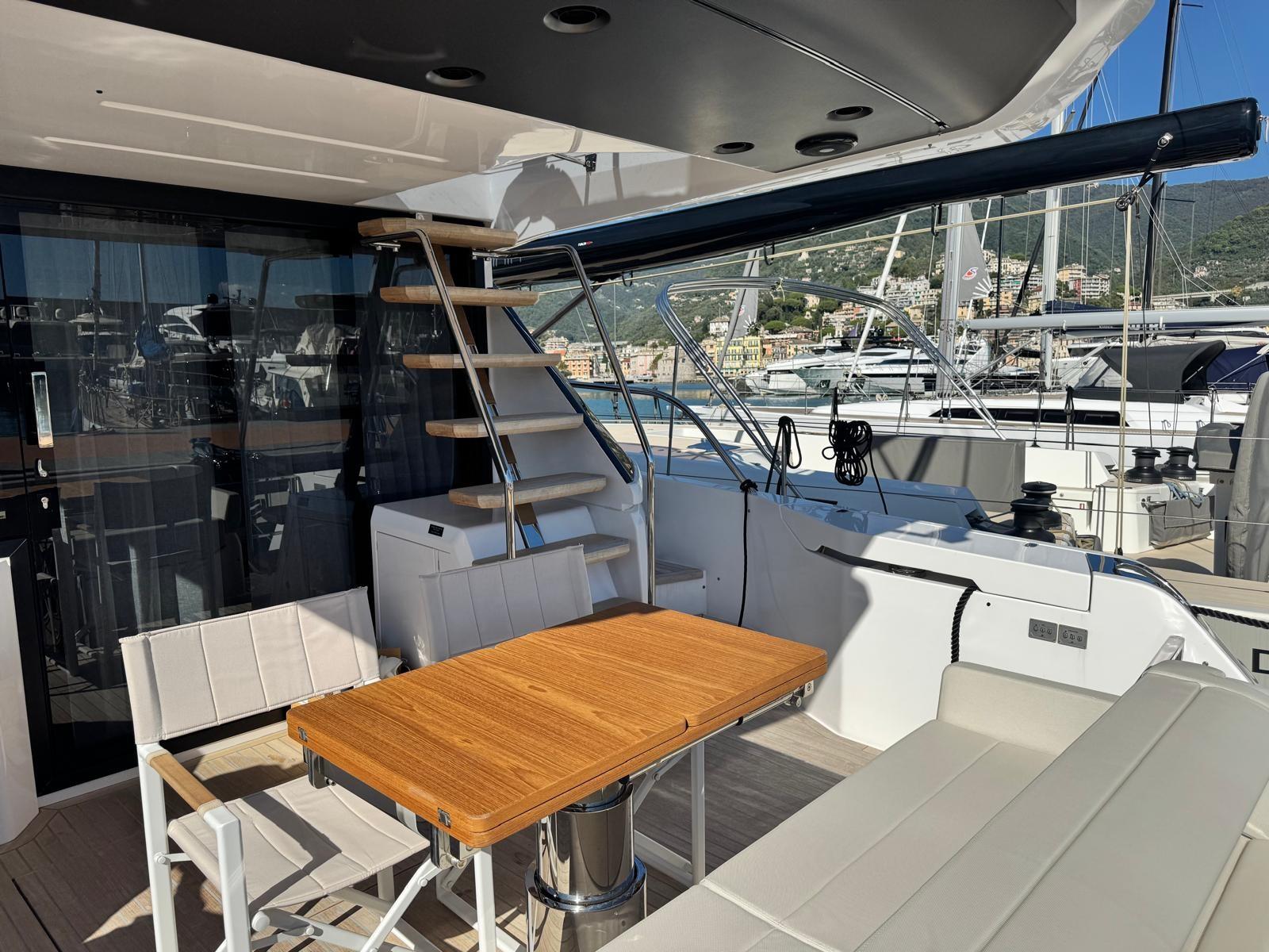 Fume/Gas Detector, Bilge Alarm, Anchor (30 kg), Water pressure pump, Shore power cable, Twin Steering, Washbasin in the cockpit, Courtesy Lights, Gangway, Platform (Con discesa a mare), 4 Automatic Bilge Pump, 4 Electric Bilge Pump, Entry door, Teak Cockpit, Shorepower connector, Electric Windlass, swimming ladder, Saddles for tender, cockpit table (Telescopico), Living Room Foldable Table, Tender, guard rails with gates, Horn, 2 Winch Electric (Poppa dx e sx).