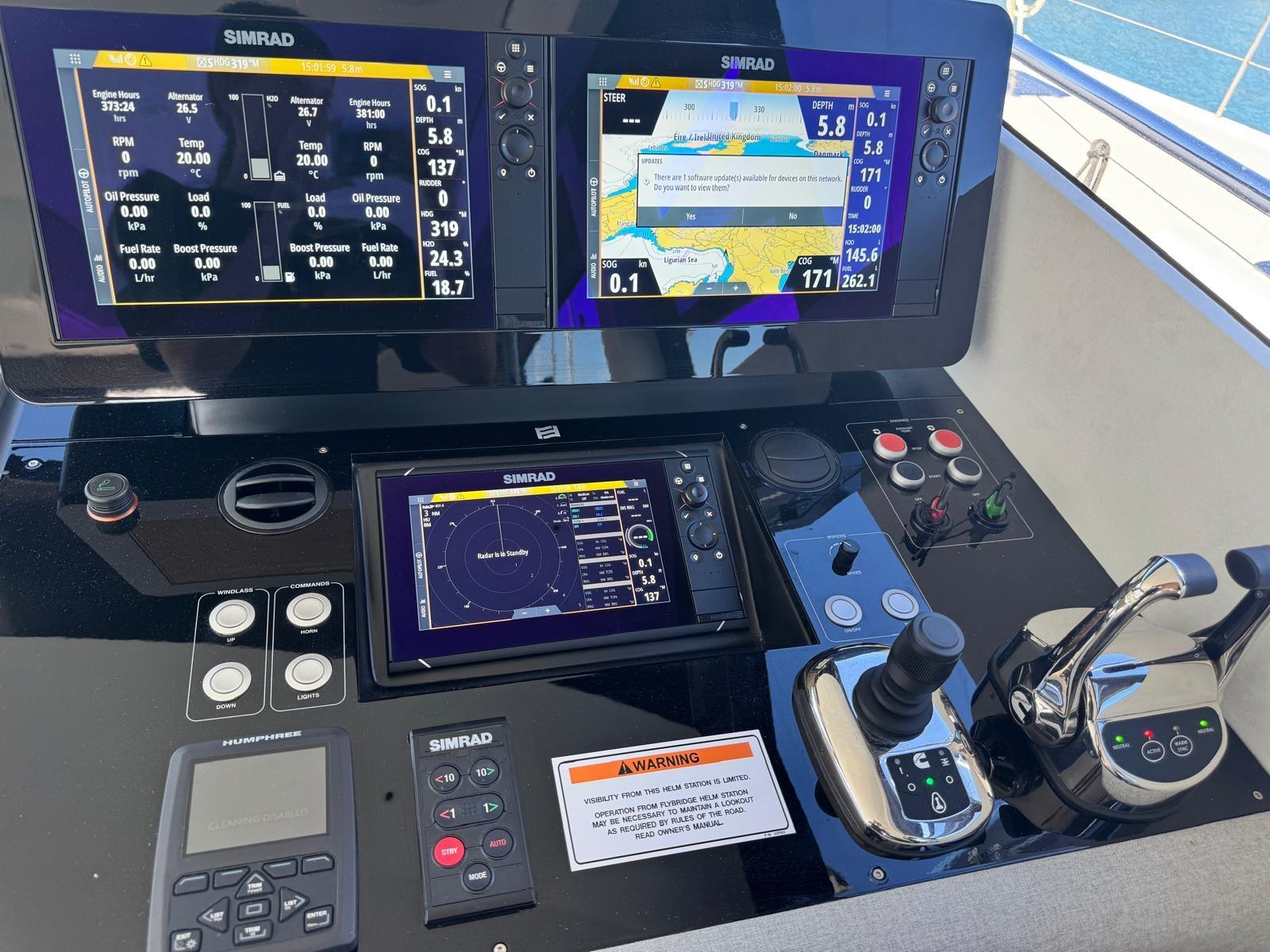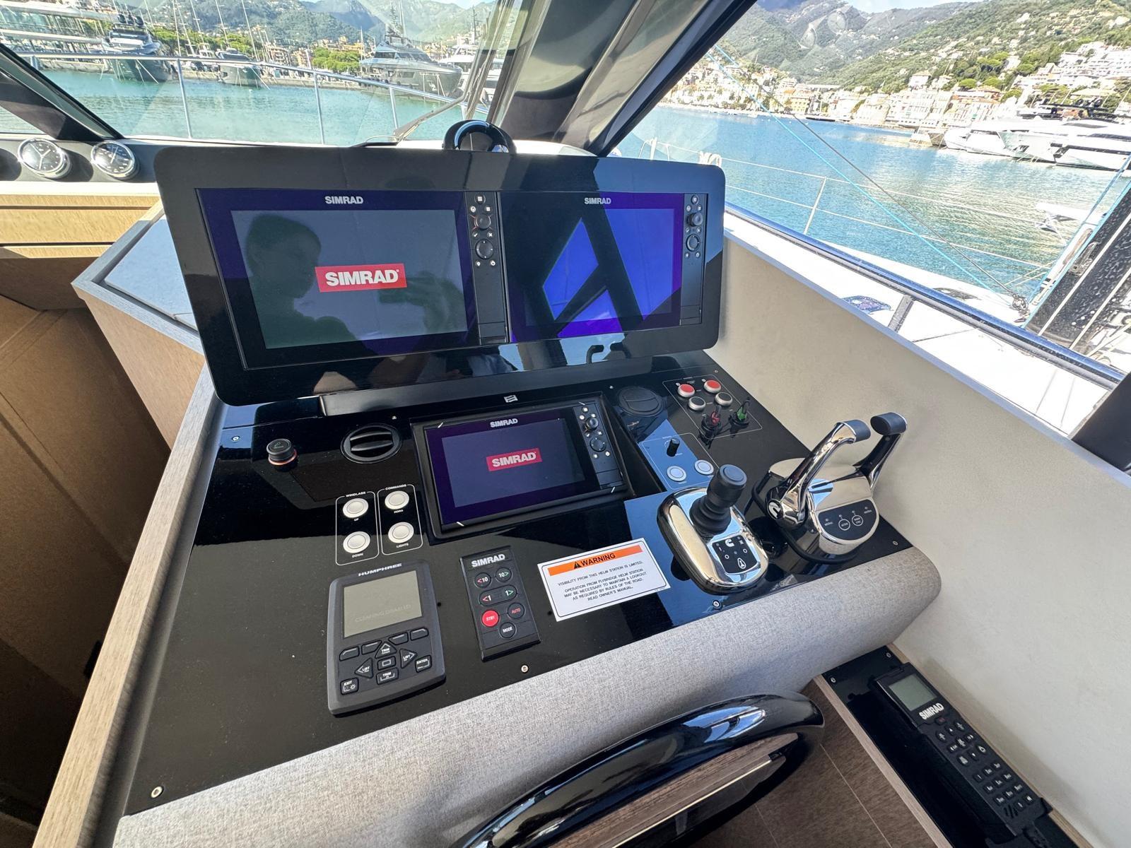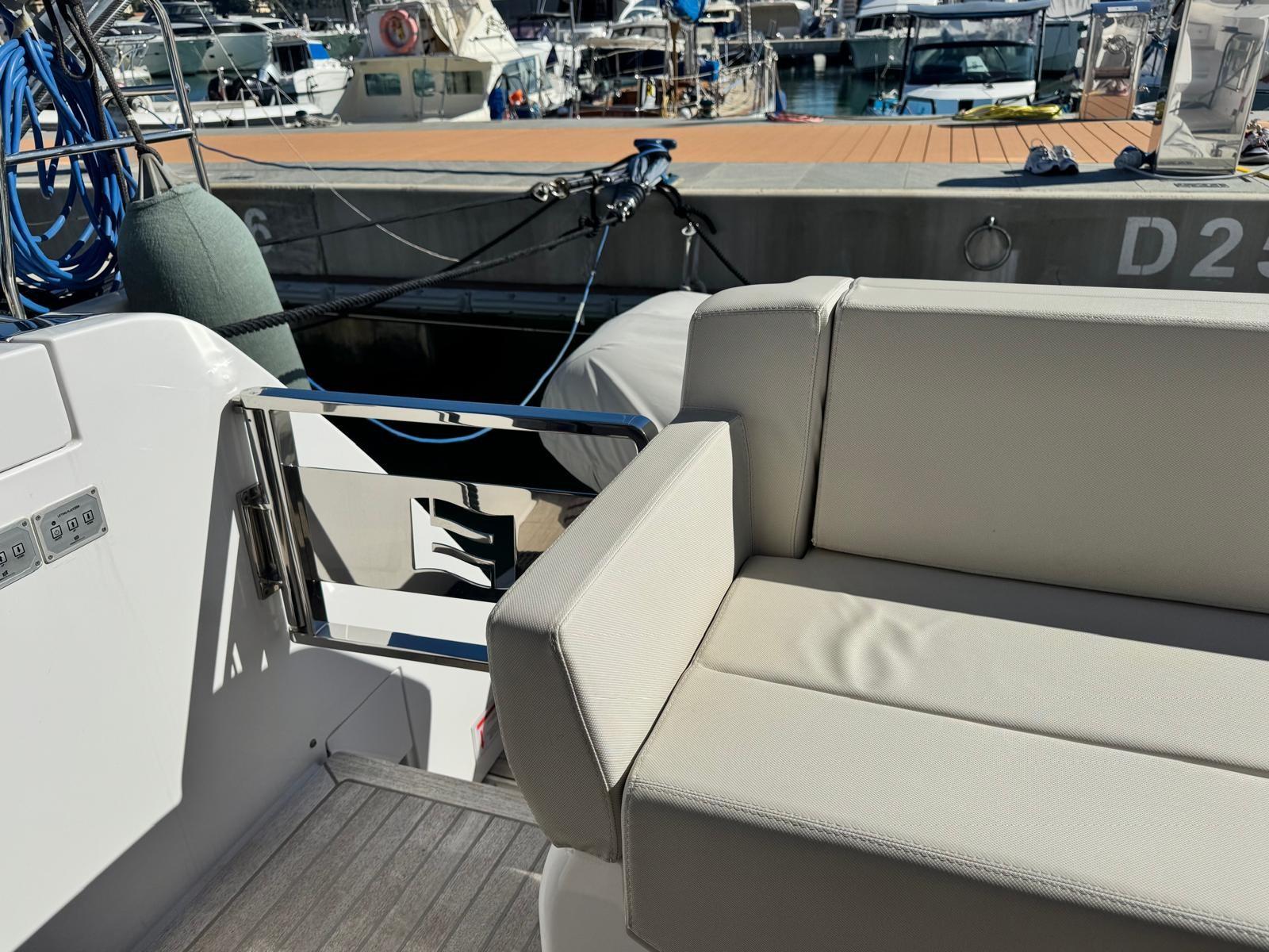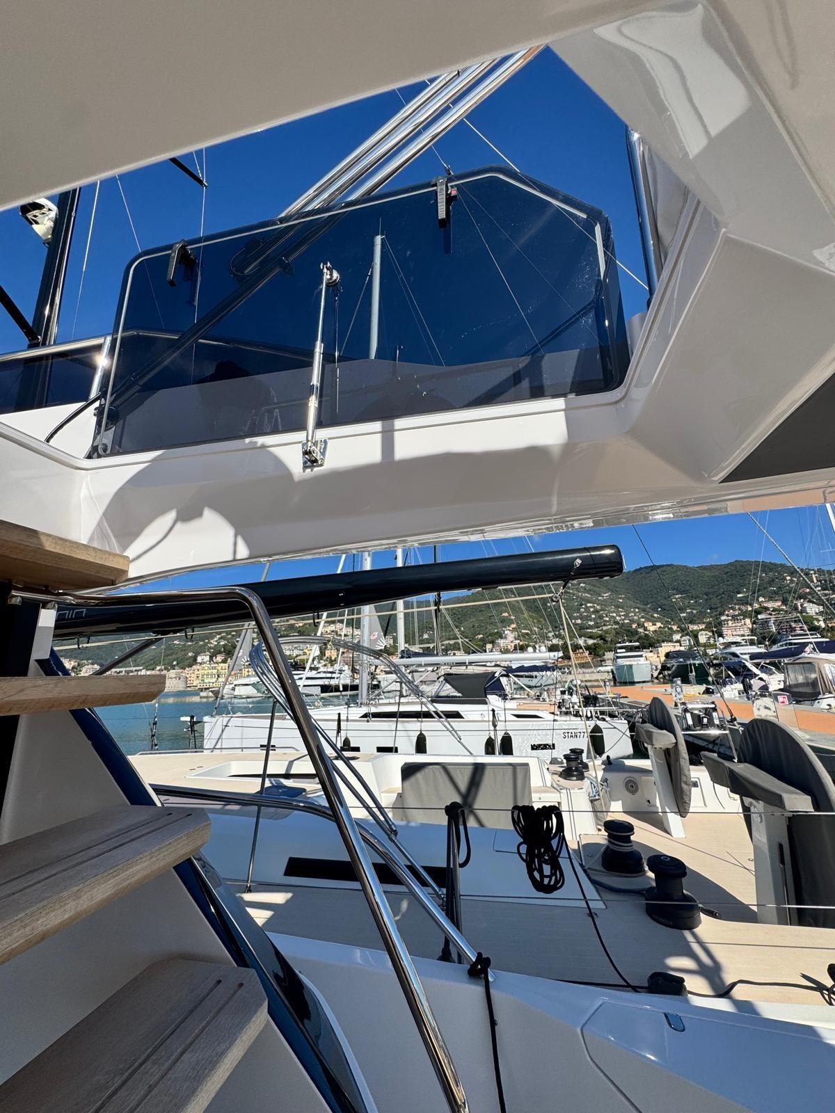 Fume/Gas Detector, Bilge Alarm, Anchor (30 kg), Water pressure pump, Shore power cable, Twin Steering, Washbasin in the cockpit, Courtesy Lights, Gangway, Platform (Con discesa a mare), 4 Automatic Bilge Pump, 4 Electric Bilge Pump, Entry door, Teak Cockpit, Shorepower connector, Electric Windlass, swimming ladder, Saddles for tender, cockpit table (Telescopico), Living Room Foldable Table, Tender, guard rails with gates, Horn, 2 Winch Electric (Poppa dx e sx).