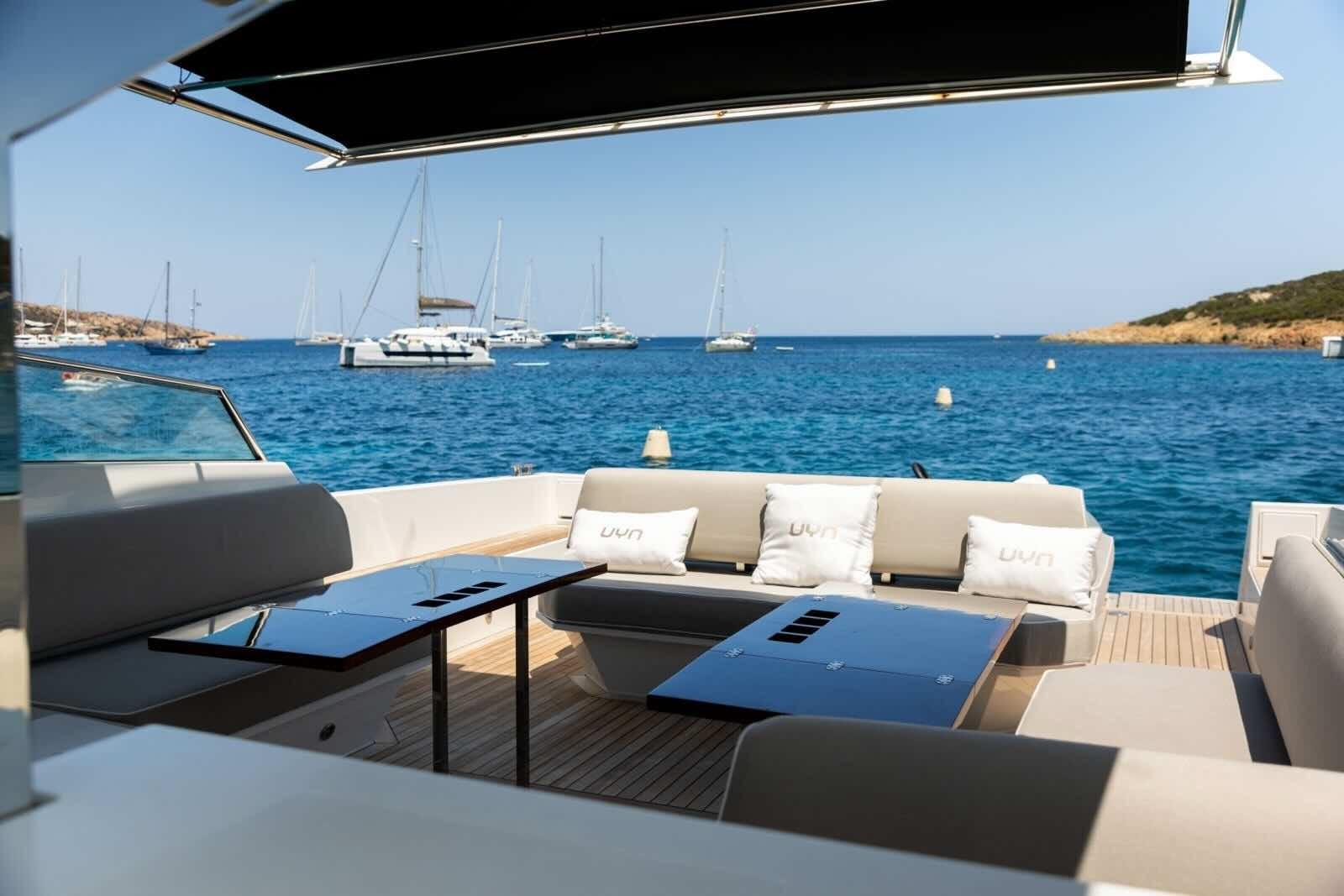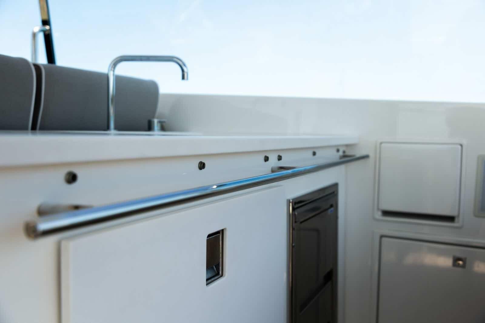 Anchor, Autoclave, 4 x Batteries (Lithium), Teak side walkways, Battery charger, Deck shower, Bow thruster, Hydraulic flaps, Solar panels, Gangway (hydraulic), Platform (hydraulic Tender lift), 3 x Electric bilge pump, Teak cockpit, 220V quay socket, Electric windlass, Swim ladder, Tender Saddles, Stabilizers (Seakeeper 9), Cockpit table, Tender (Williams waterjet), Trumpet, T-Top, Teak deckhouse.