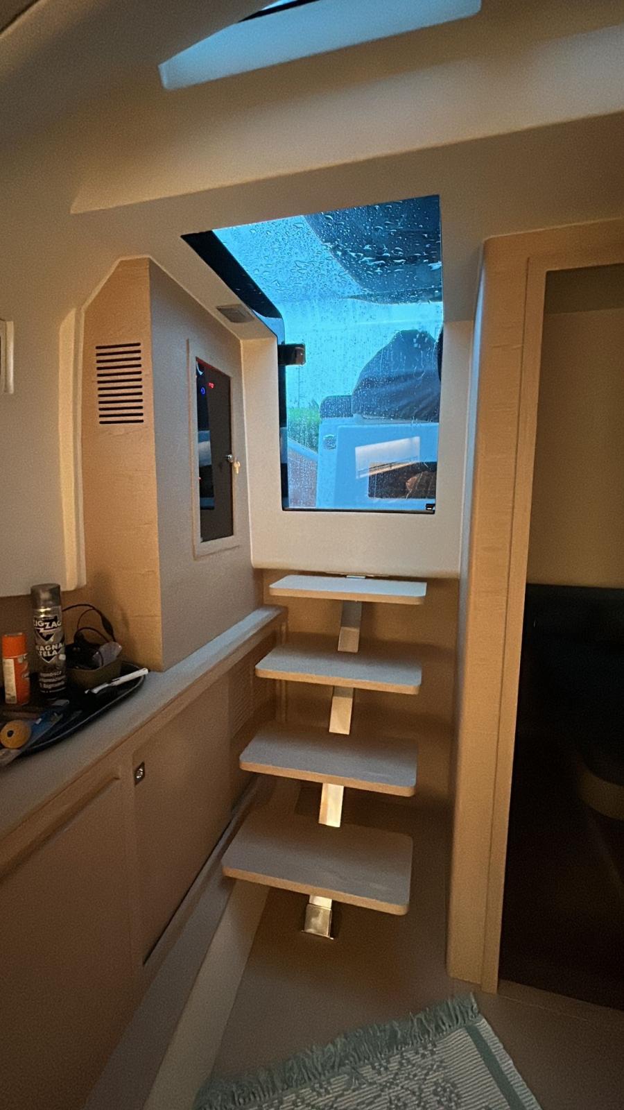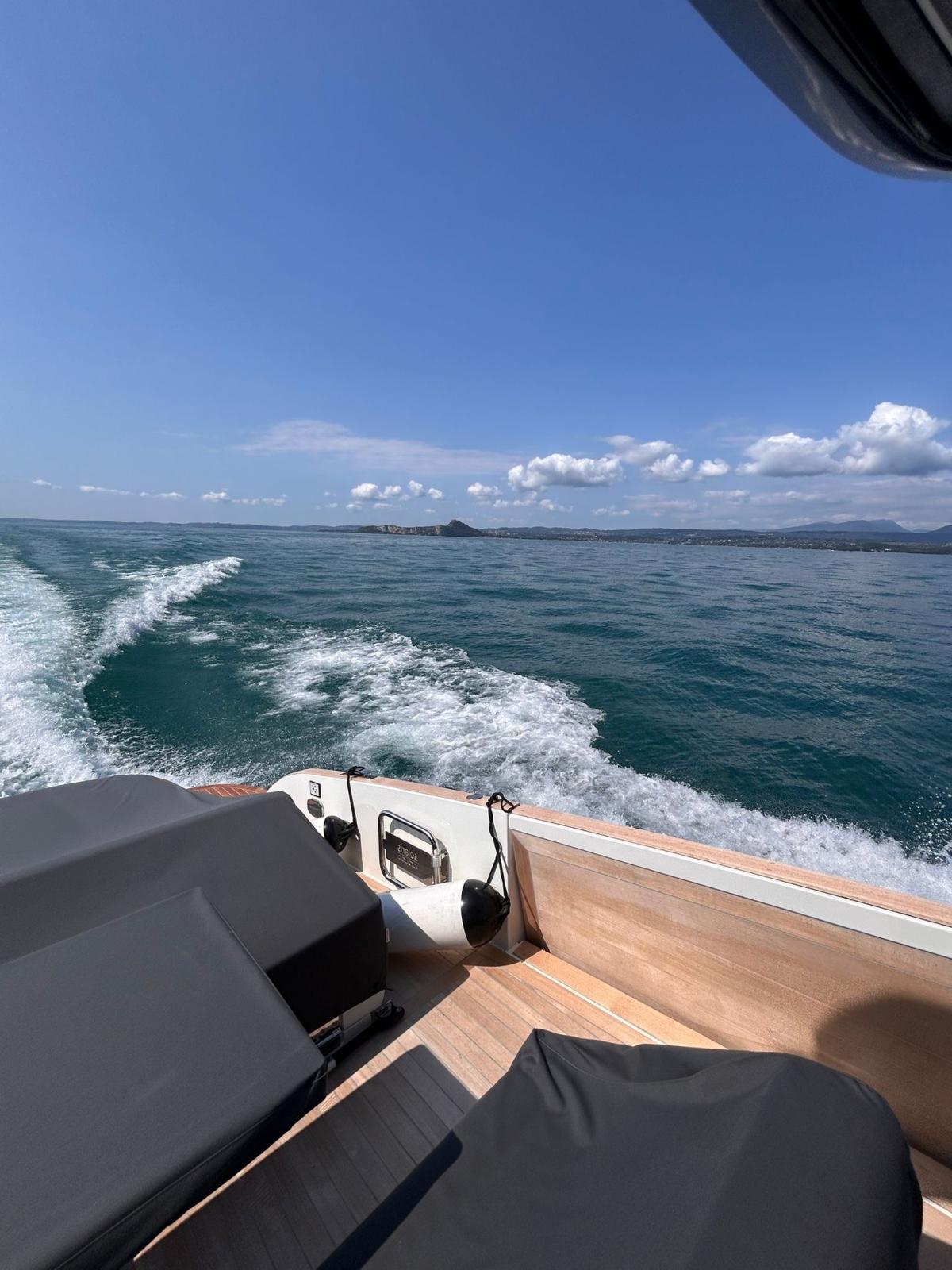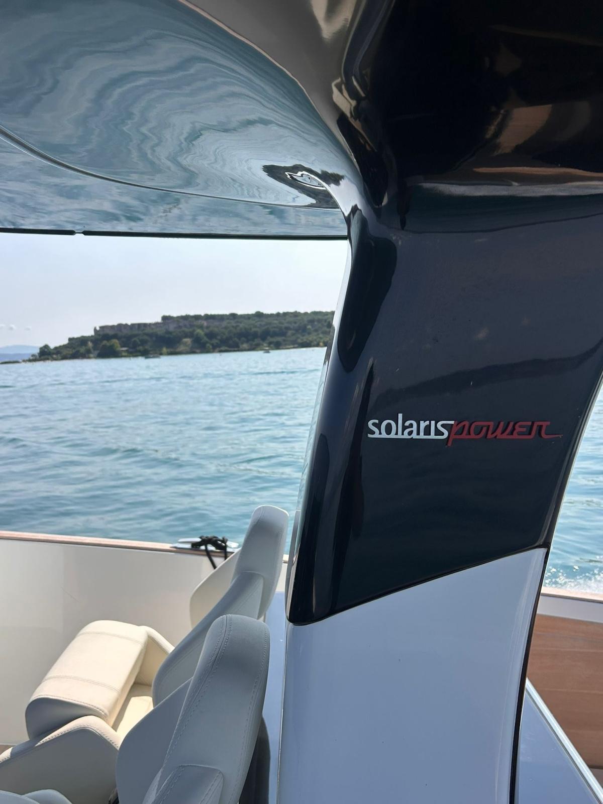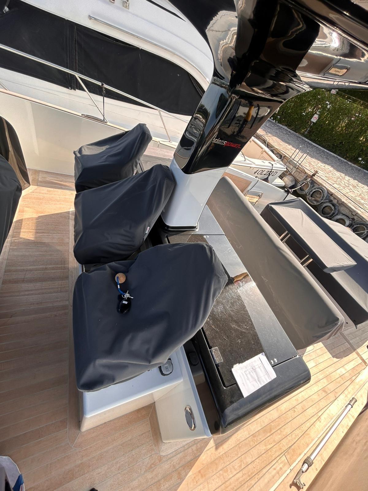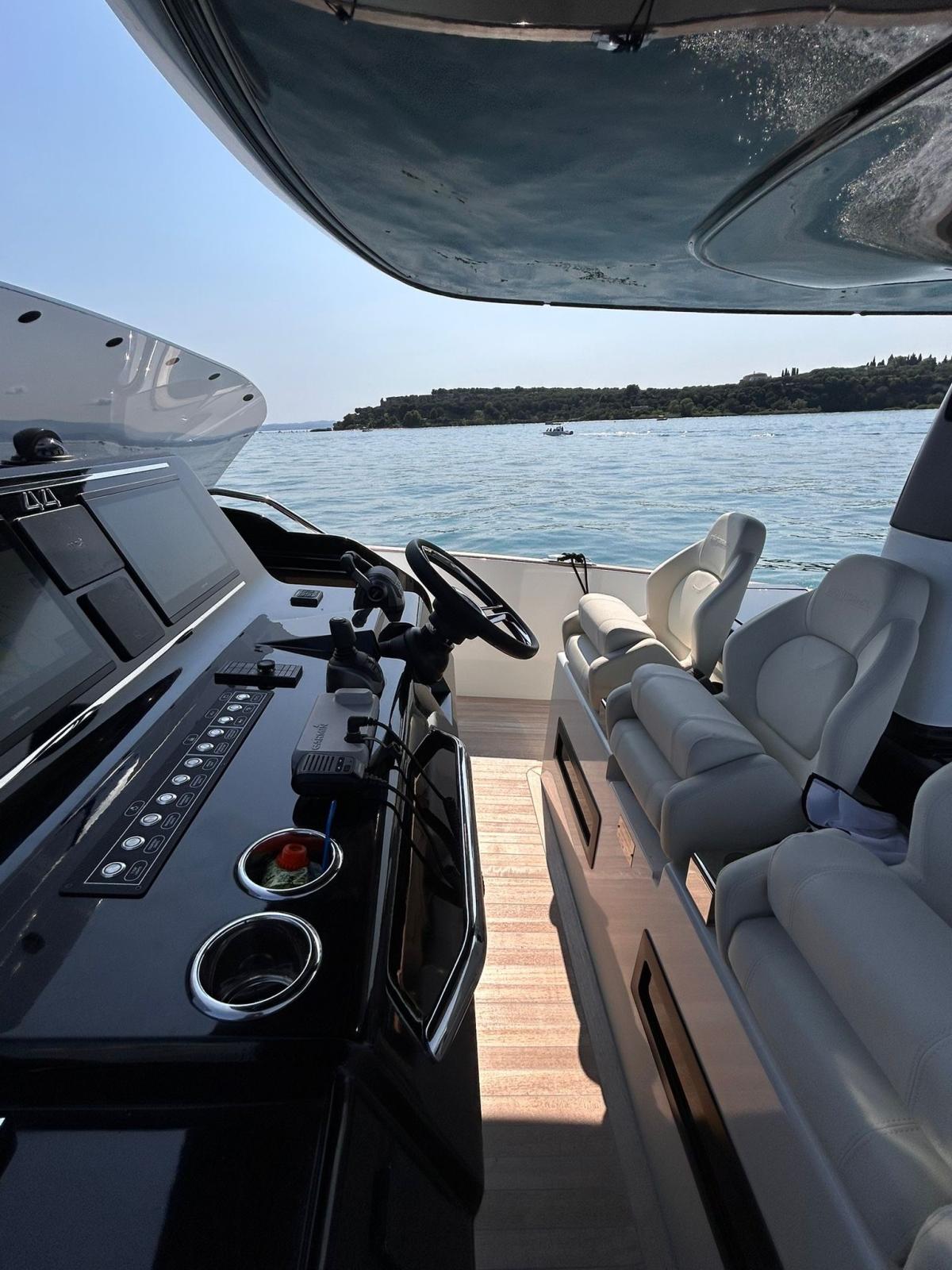 Cockpit dishwasher and icemaker, kitchen cabinet total cover, windshield and console total cover, antifouling, black waterline, hydraulic side terraces with teak insert, aft sundeck with garage below and electric opening, stern and bow sunbathing cup holders (n.4), driver's seat cup holders (n.2), opening porthole in the bow, N. 2 aft cleats, Aft master cabin complete with hull glazing, Separation bulkhead with door for the two cabins, Luxury kit (broadside compartments with fabric finish - straight mobile top and bedside top with eco-leather finish - eco-leather movable handles), Stainless steel stern gates, Stainless steel bow locker fender rod, Shaped stainless steel transom mirror, Owner's cabin stereo system with Bluetooth, 2 interior speakers and two additional speakers for the T-Top outdoor area, Courtesy light package, includes: external walkway lights, T-Top lights, bow pop-up sundeck lights, stern sundeck lighting, N. 2 220 V watertight sockets in the aft locker, Transparent splash guard for helm station, Cover package (the package includes: console cover, table, PP seat, PP sundeck, PR sundeck, pilot seats), dark stern awning, black antifouling, icecream color external fabrics.
