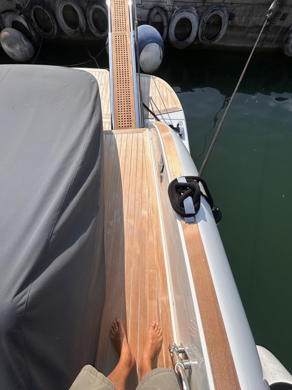 Engine Alarm, Bilge Alarm, Anchor (inox 16 kg con snodo), Auto Dynamic Trim Interceptor, Water pressure pump, Batteries (servizi (500Ah)), Folding cleats, Teak Side Decks (con commento grigio chiaro), Deck Shower, Hard top, Fire Extinguishing System, Washbasin in the cockpit (cucina), Courtesy Lights, Gangway (idraulica telescopica), Platform (Spiaggetta di poppa lunga con sistema idraulico sali e scendi compresa scaletta di discesa automatica), Entry door, Teak Cockpit (con commento grigio chiaro), Shorepower connector, Electric Windlass, swimming ladder, Stabilizers (Quick MC2 x 10 Gyro), cockpit table (allungabile in teak), Horn.