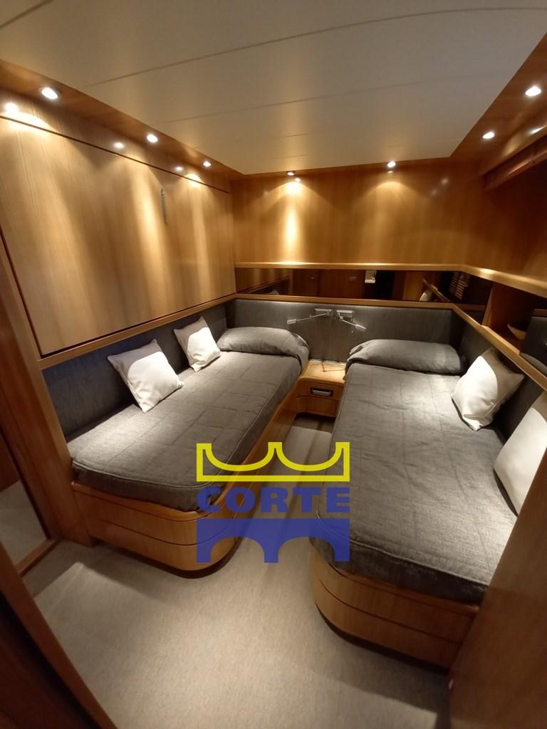 Engine Alarm, Bilge Alarm, Water pressure pump, Teak Side Decks, Deck Shower, Hydraulic Flaps, Davits for tender on fly, Fire Extinguishing System, Courtesy Lights, Gangway (idraulica a scomparsa), Platform (di poppa in teak), Automatic Bilge Pump, Entry door, Side door, Teak Cockpit, Shorepower connector, Water harbor connector system, Electric Windlass, swimming ladder, cockpit table, Horn, 2 Stern Winches, Bow Winches.
