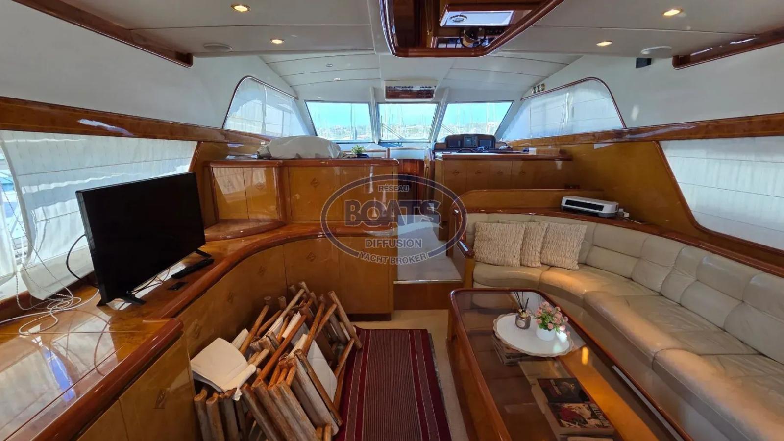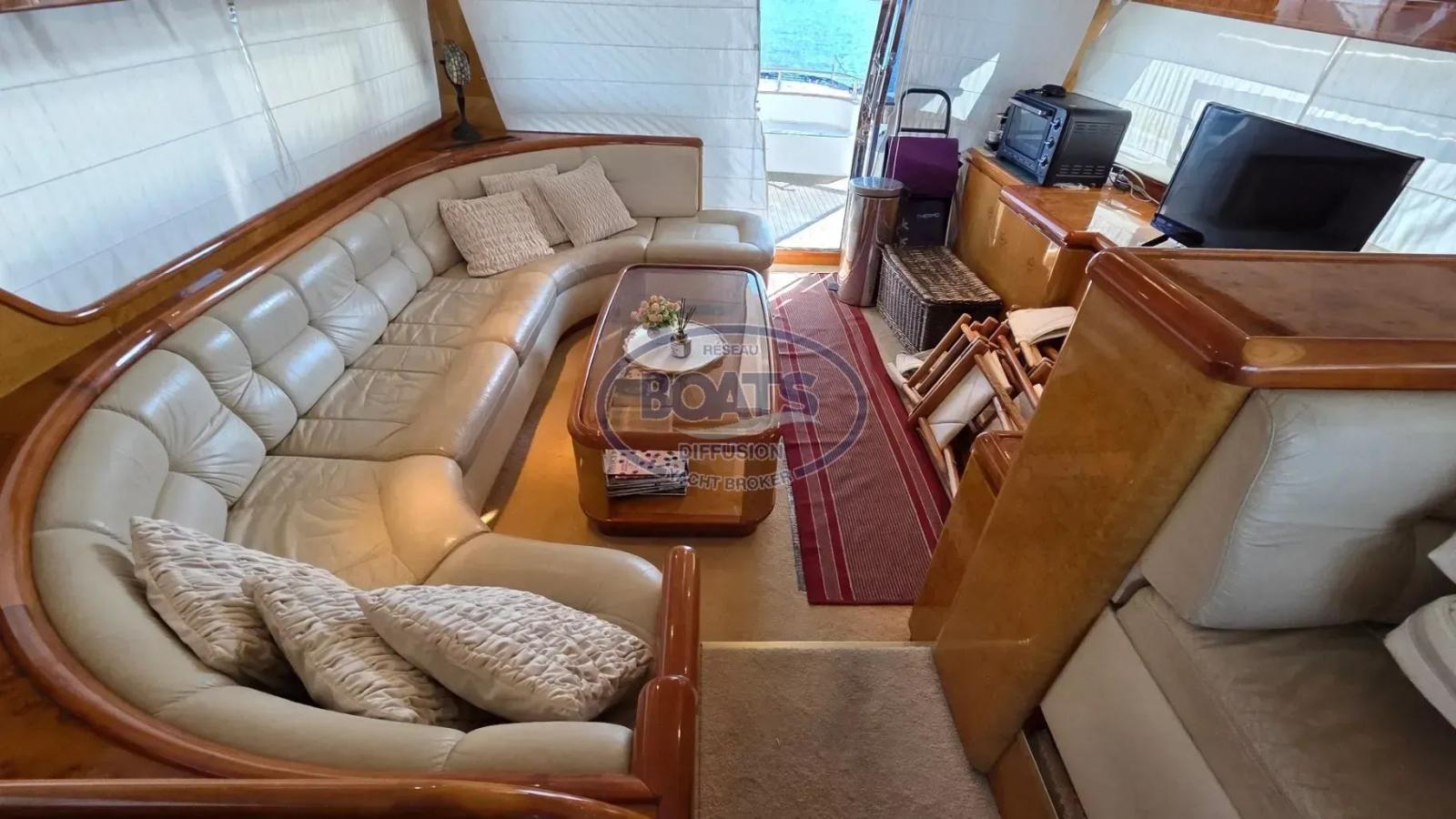 Inside, superb lounge area, dining area, and helm station,