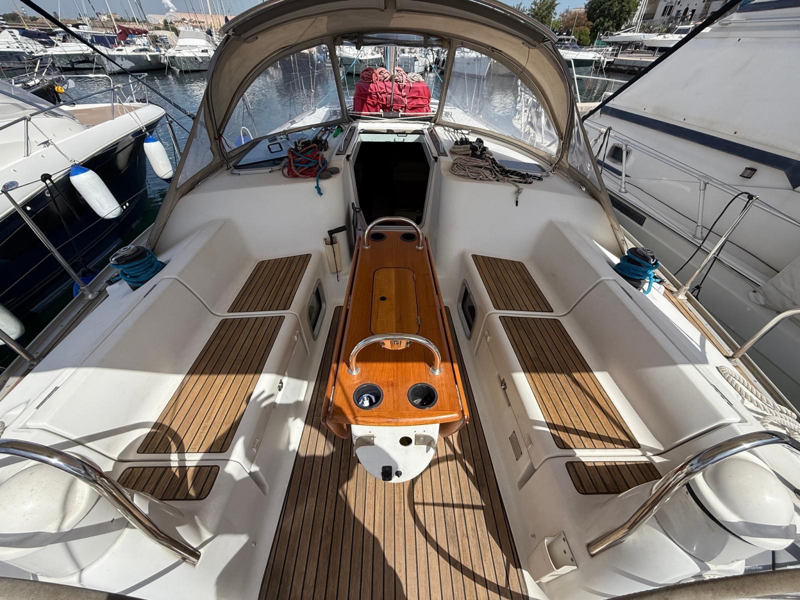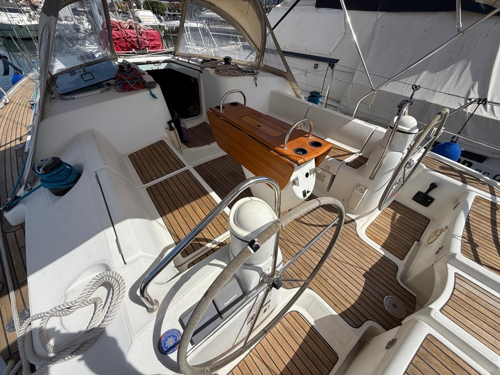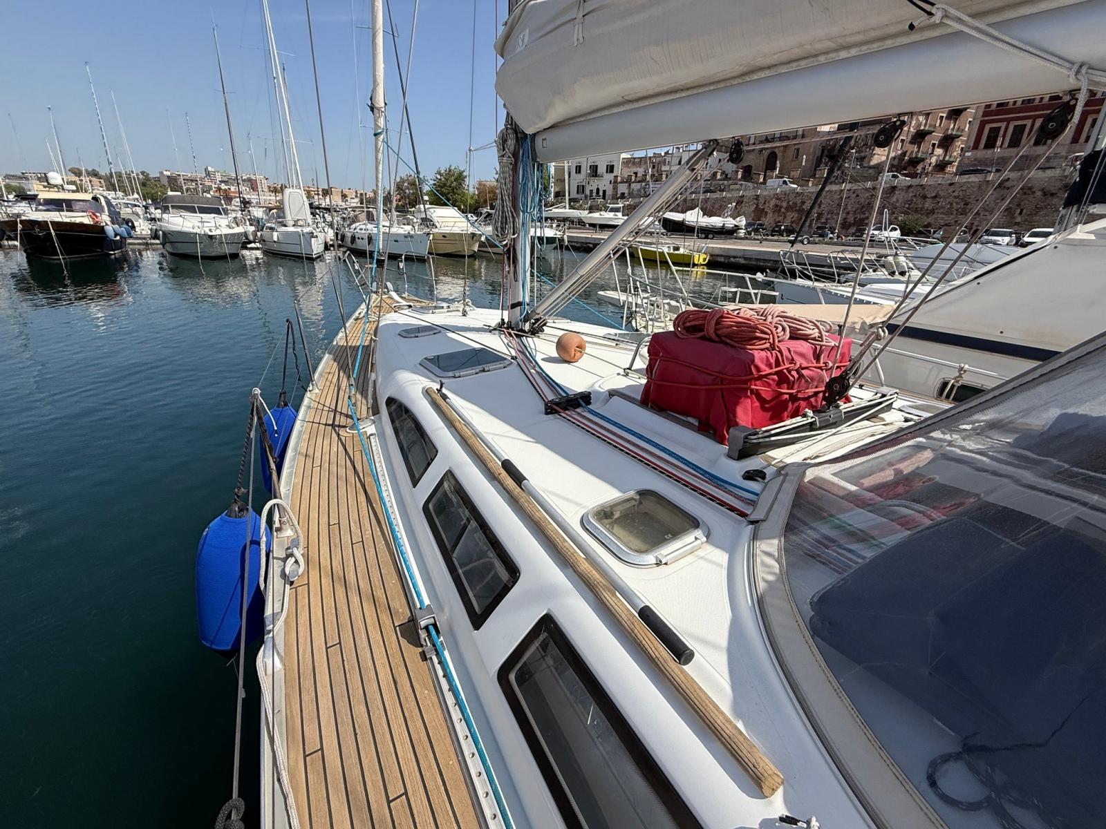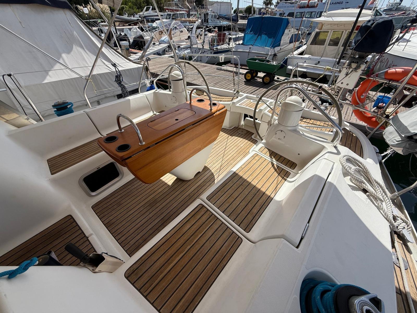 Anchor (DELTA), Batteries (1 MOTORE + 3 SERVIZI + 1 ELICA DI PRUA), Teak Side Decks, Deck Shower, Twin Steering, Fenders, Manual Bilge Pump, Entry door, Teak Cockpit, Shorepower connector, Electric Windlass, Strand rigging, swimming ladder, cockpit table, 3 Winch.