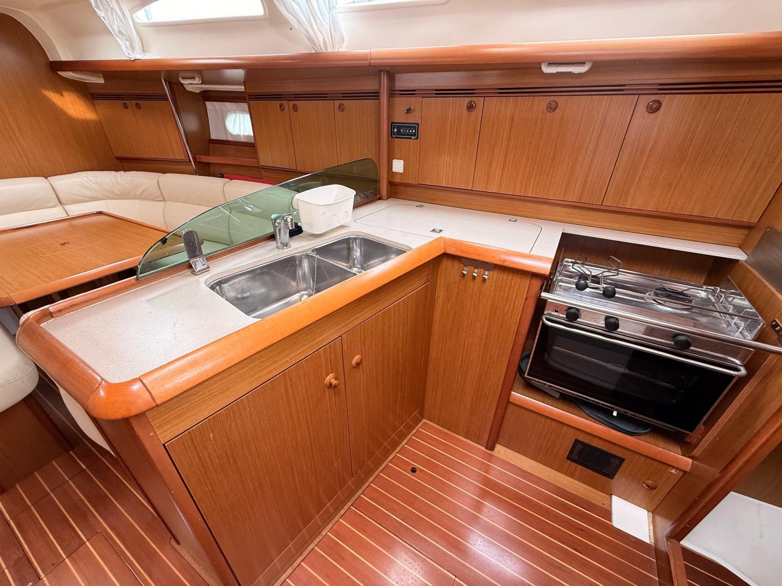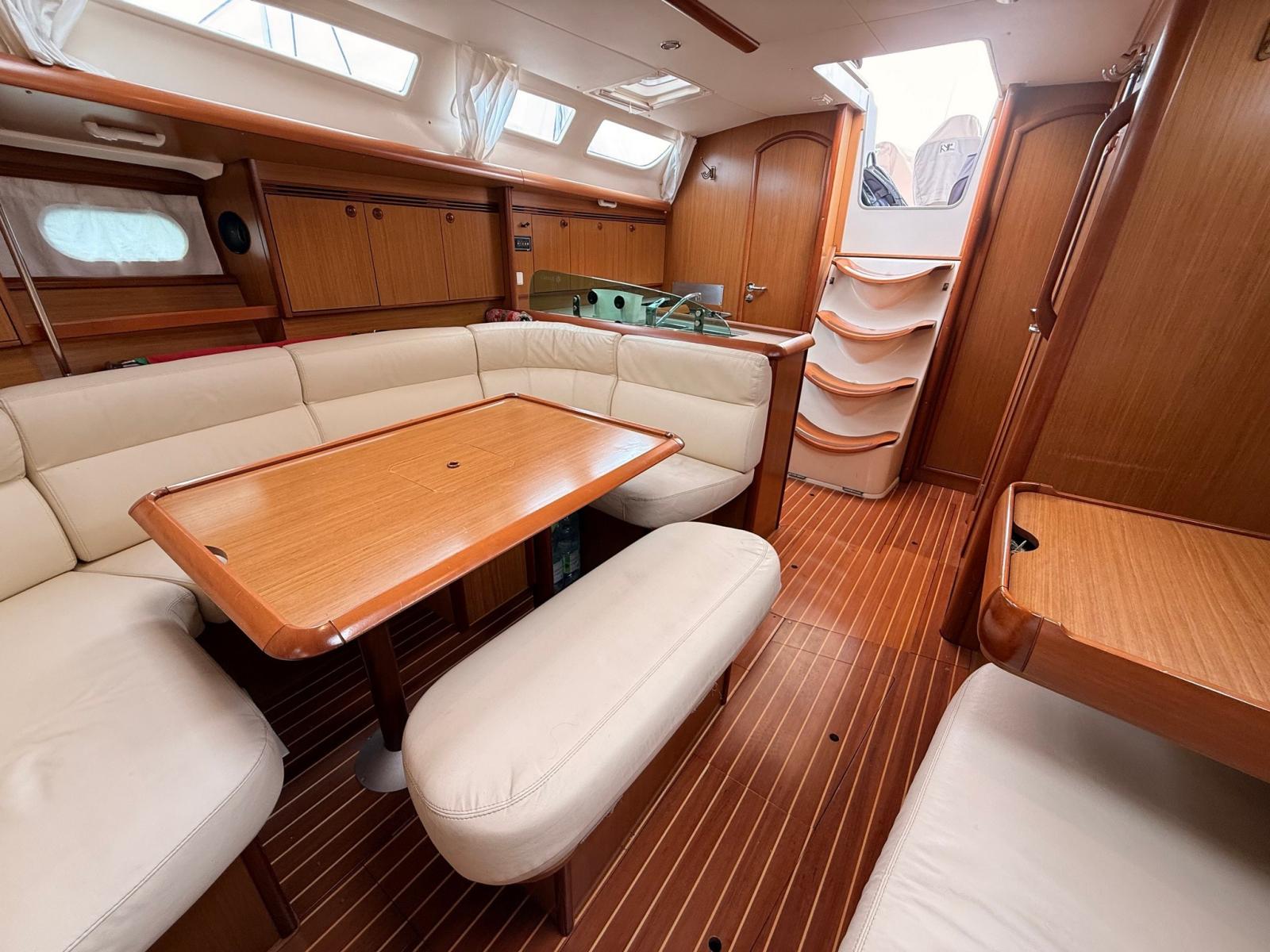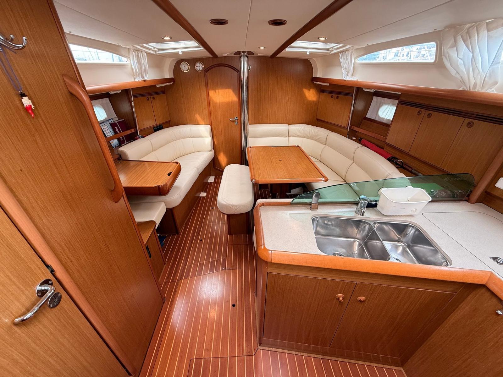 Warm and bright interior with 3 cabins and 2 bathrooms, large central dinette and full kitchen.