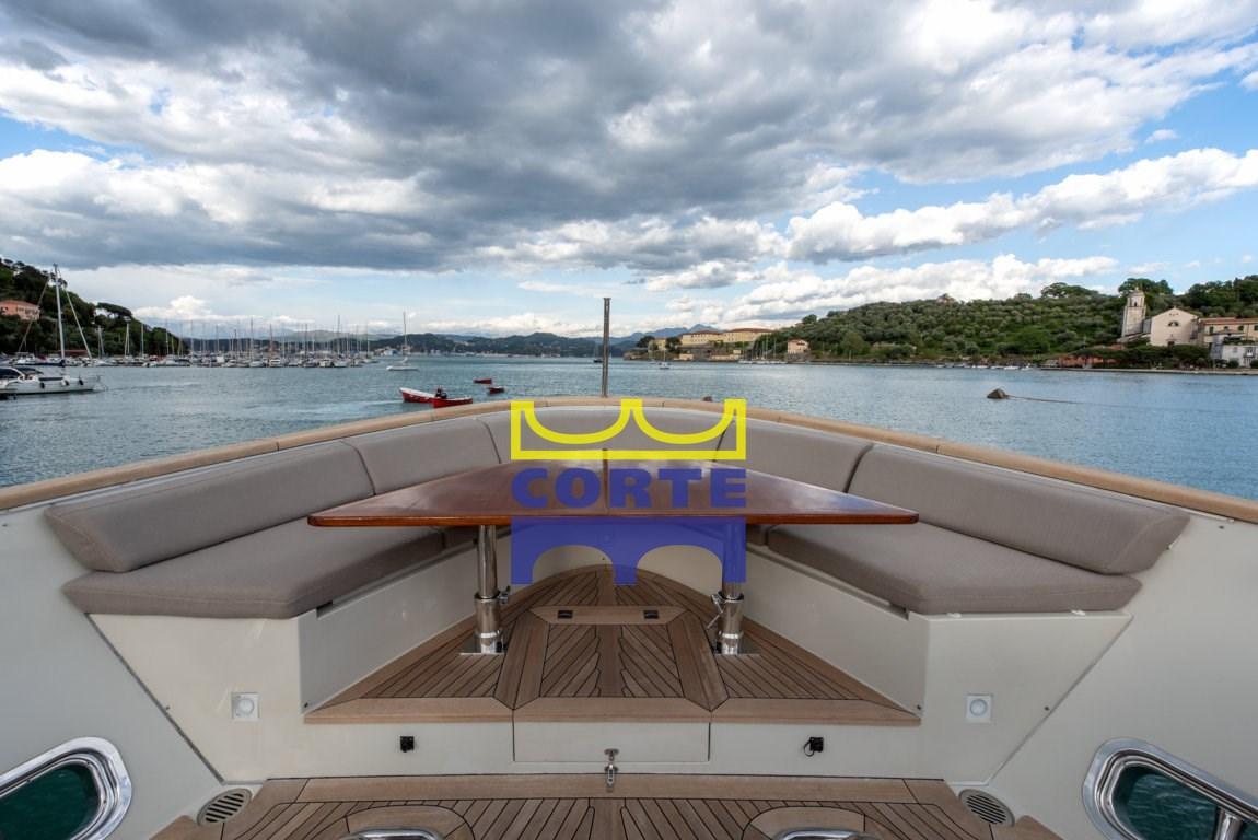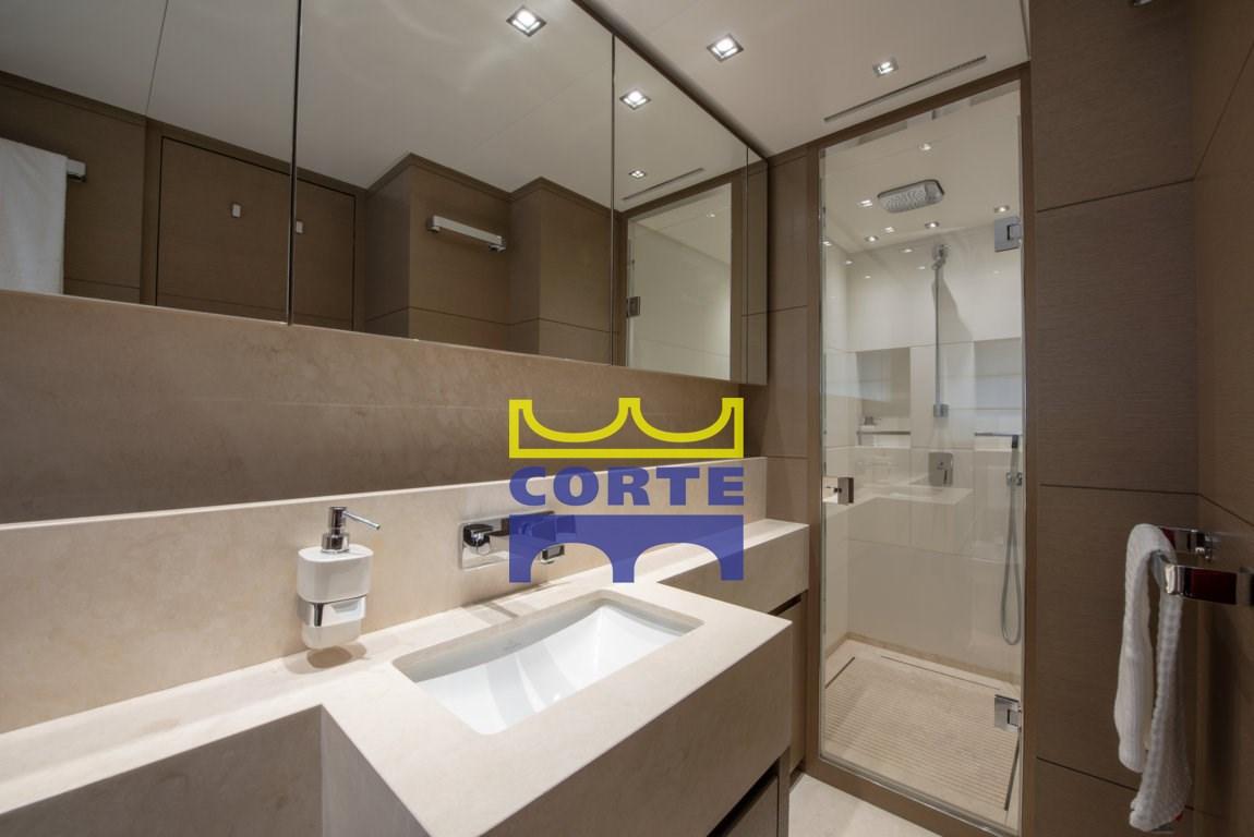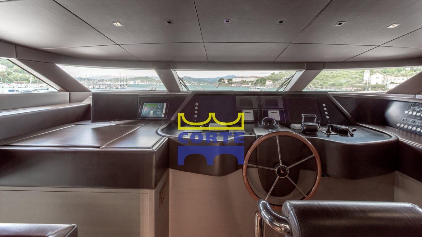 Fume/Gas Detector, Engine Alarm, Bilge Alarm, 2 Anchor, Water pressure pump, Draining System, Teak Side Decks, 2 Battery charger, Deck Shower, Twin Steering, Stern Thruster (idraulica), Bow Thruster (elettrica), Directional Spotlight, Hydraulic Flaps, Tender Garage, Jet-Ski Crane, Hard top, Fire Extinguishing System, Flaps Indicators, Anchor Chain Washdown, Courtesy Lights, Underwater lights, Gangway (elettroidraulica a scomparsa), Platform (poppa in teak), Automatic Bilge Pump, Entry door, 2 Side door, Teak Cockpit, Shorepower connector, Water harbor connector system, Electronic instrumentation repeater, 2 Electric Windlass, swimming ladder, Waste Water Purifier System, Stabilizers (pinne), cockpit table, Horn, 2 Stern Winches, Bow Winches.