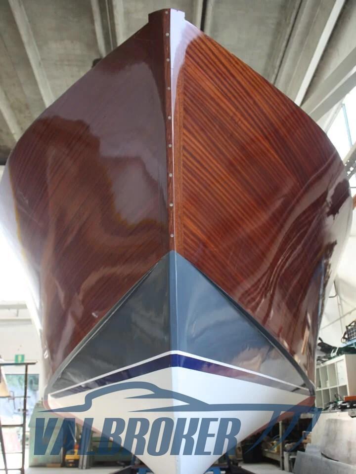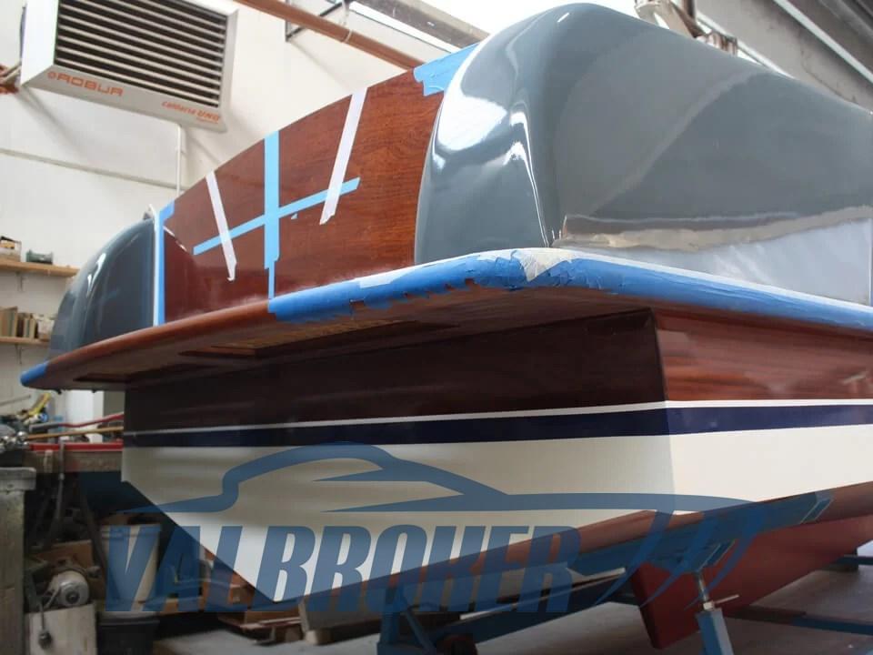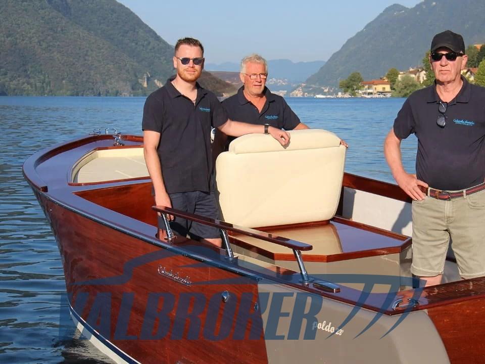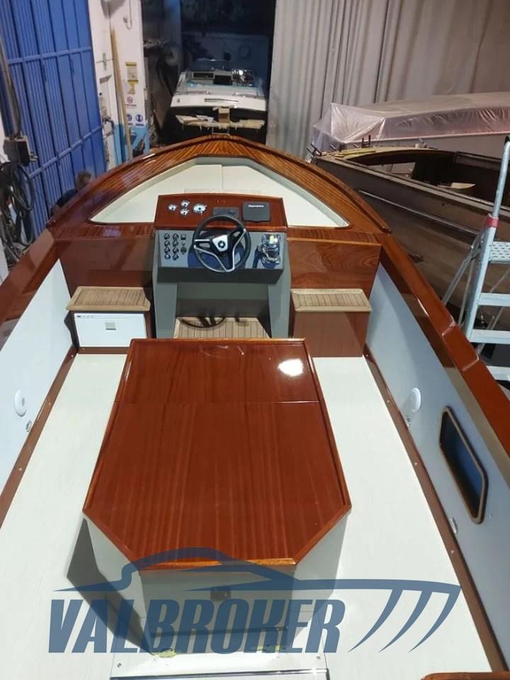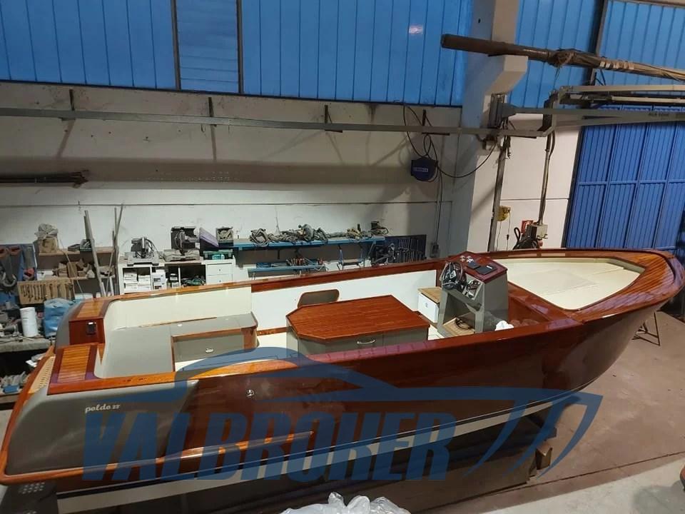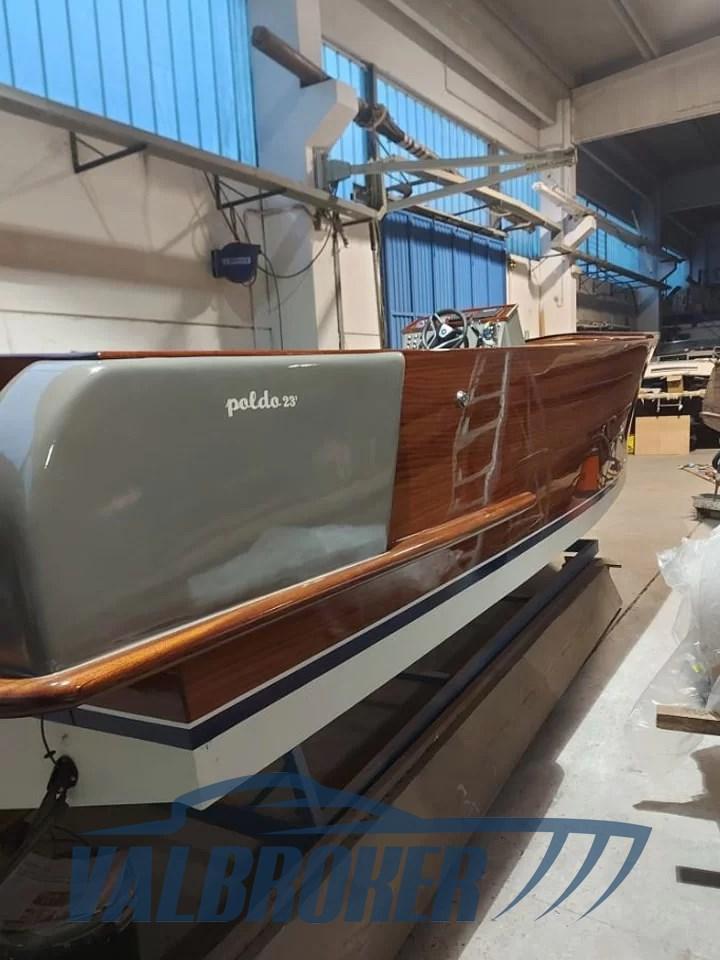 NEW BOAT. Poldo 23, the 70th Anniversary boat, built in mahogany, oak and iroko. Equipped with a diesel inboard engine and shaft line transmission. Large sundeck in the bow, the helm station with folding seat for standing driving, the central engine compartment, the aft seats with the 'U' shaped sofa and finally the swim platform with teak grating. The cushions of the forward sundeck hide a large locker for the storage of life jackets and equipment, which can become an emergency berth if necessary. It is accessed via two steps on the sides of the dashboard. The console is equipped with classic navigation instruments, including the tachometer, fuel level, oil pressure, digital hour meter. Two 80 Ah batteries each provide power for the motor and services.