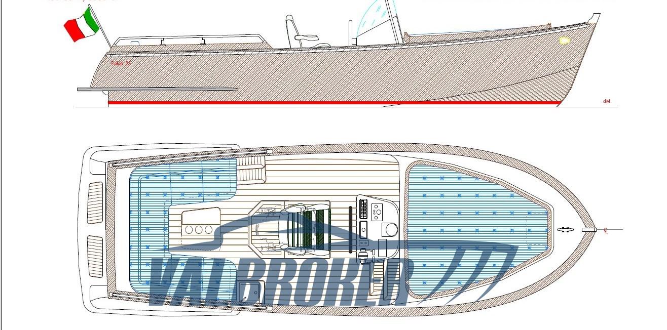 Stern shower cubicle, 6 Fenders, 2 fire extinguishers, 1 Boat hook, Boat cover, Exhaust line with silencer and RINA approved pipes, Diesel supply system with decanter prefilter, Engine instrumentation (tachometer, oil pressure, water temperature, hour meter), Engine control and single-lever inverter, Bottle holder seats, Bumper edge on the braided line on the sides, Handrail handles on both sides of the sundeck, Mooring cleat at bow and stern, Support for flagpole, teak pole and flag Anchor housing and retractable anchor line on deck at the bow