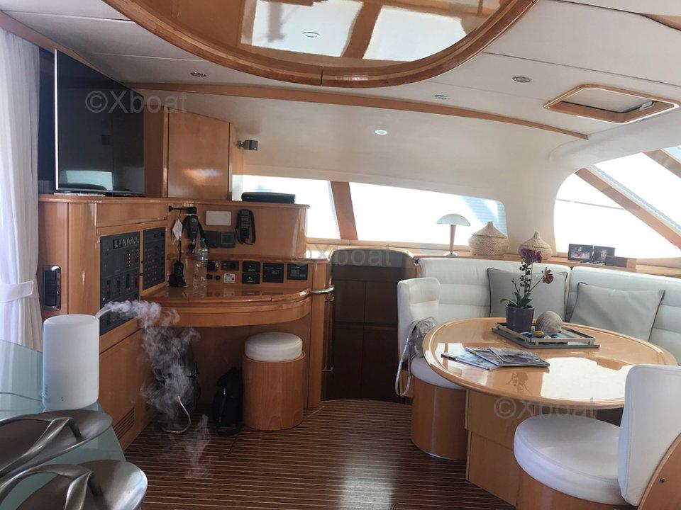 This owner's version is built in maple, with a very beautiful interior joinery and alcantara for the vaigrages; a daybed has been arranged in the lounge area, with a nice dining space, a fitted bar, and the chart table right at the entrance.