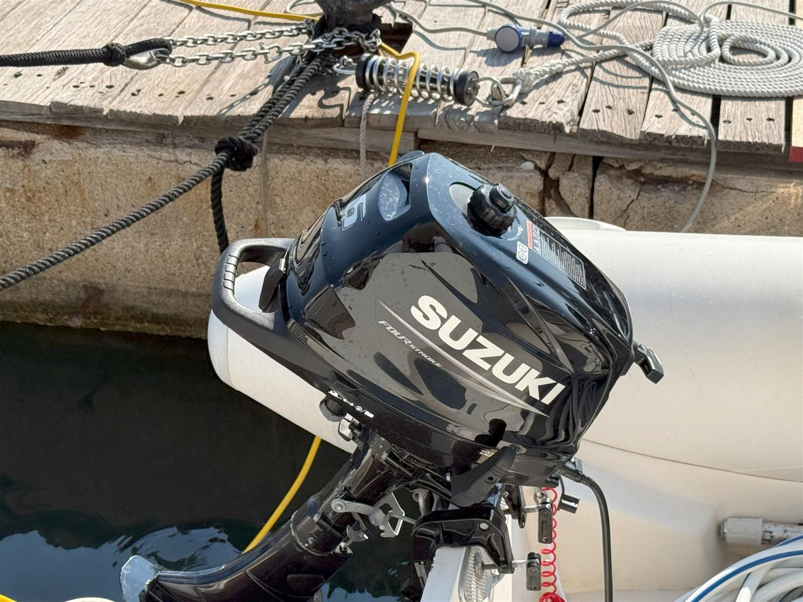 Engine Alarm, Bilge Alarm, Alternator, Anchor (con catena inox + ancora di rispetto), Water pressure pump, 7 Batteries (AGM servizi 2025), Battery charger (2025), Shore power cable, Guard rail, Safety rail, Deck Shower, Twin Steering, Directional Spotlight, Anchor mount, Hydraulic Flaps, Fire Extinguishing System, Flaps Indicators, Anchor Chain Washdown, Washbasin in the cockpit (Sul FLY), Courtesy Lights, Battery Monitor, Outboard engine for tender (Suzuki 6 hp), 10 Fenders (8 standard + 2 tondi), Gangway, Platform, Waste Water Tank Drain Pump, Automatic Bilge Pump, Manual Bilge Pump, Entry door, Shorepower connector, Water harbor connector system, Voltage Rectifier, Electronic instrumentation repeater, Rollbar, Electric Windlass (2025), swimming ladder, Saddles for tender, cockpit table, Tender, guard rails with gates, Horn, Stern Winches, Bow Winches.