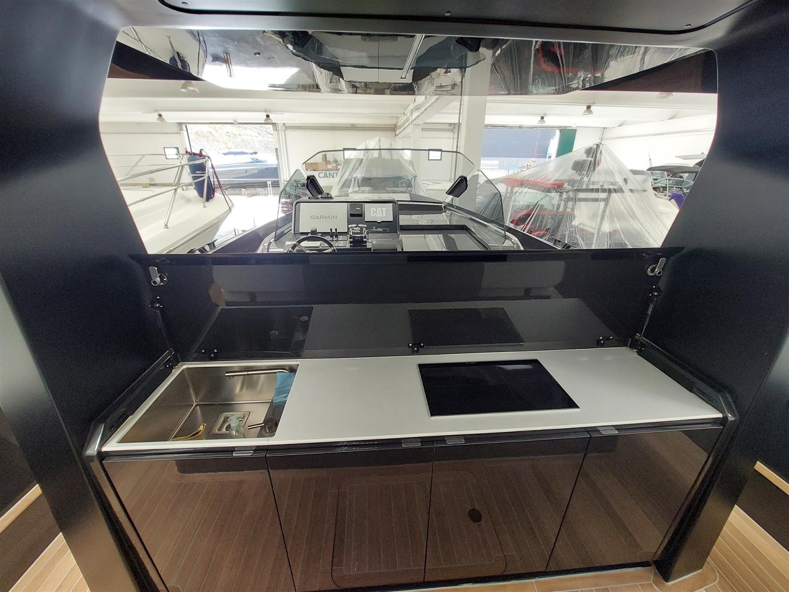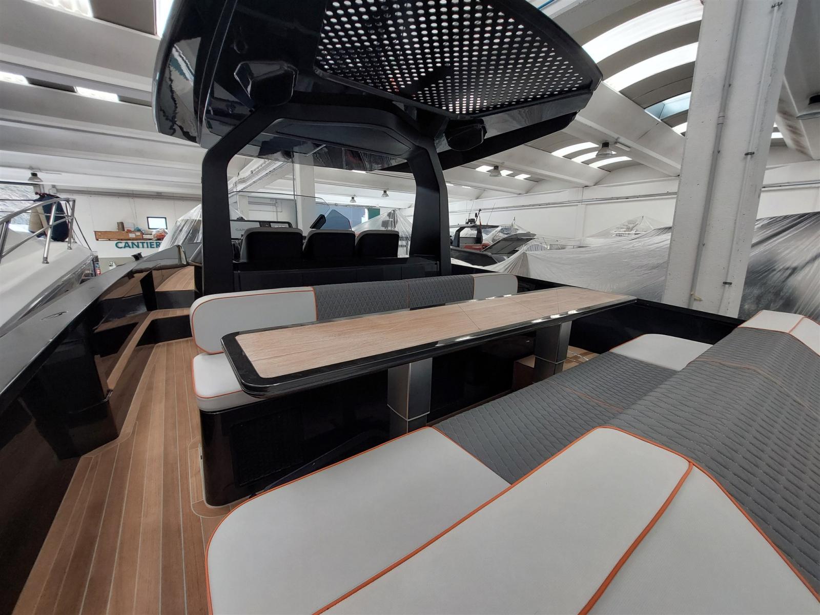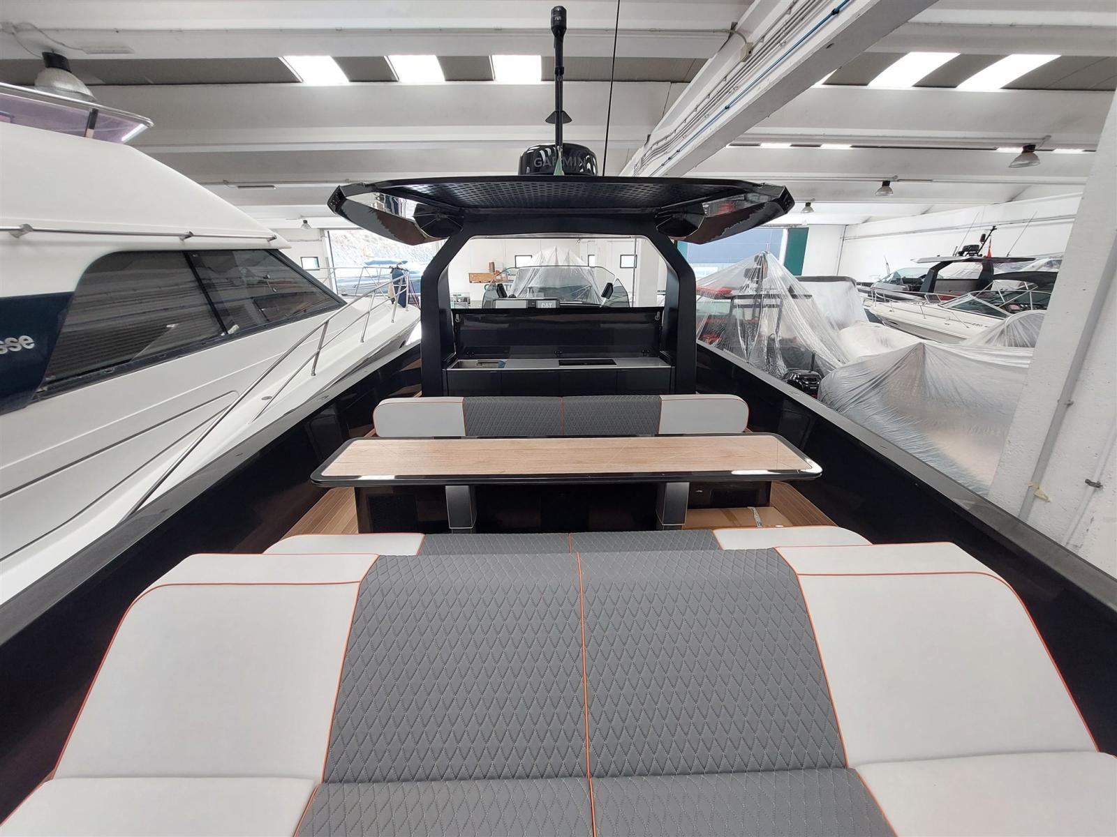 Fume/Gas Detector, 2 Engine Alarm, Bilge Alarm, Electric Engine Compartment Opening, Water pressure pump, Auto-Trim, Teak Side Decks, Shore power cable, Special Colour, Deck Shower, Headlights fixed on the stem, Anchor mount, Electric Flaps, Hard top, Fire Extinguishing System, 2 Flaps Indicators, Anchor Chain Washdown, Washbasin in the cockpit, Courtesy Lights, Underwater lights, Platform, Manual Bilge Pump, Teak deck, Entry door, Teak Cockpit, Shorepower connector, Rollbar, Electric Windlass, swimming ladder, cockpit table, Horn, T-Top.