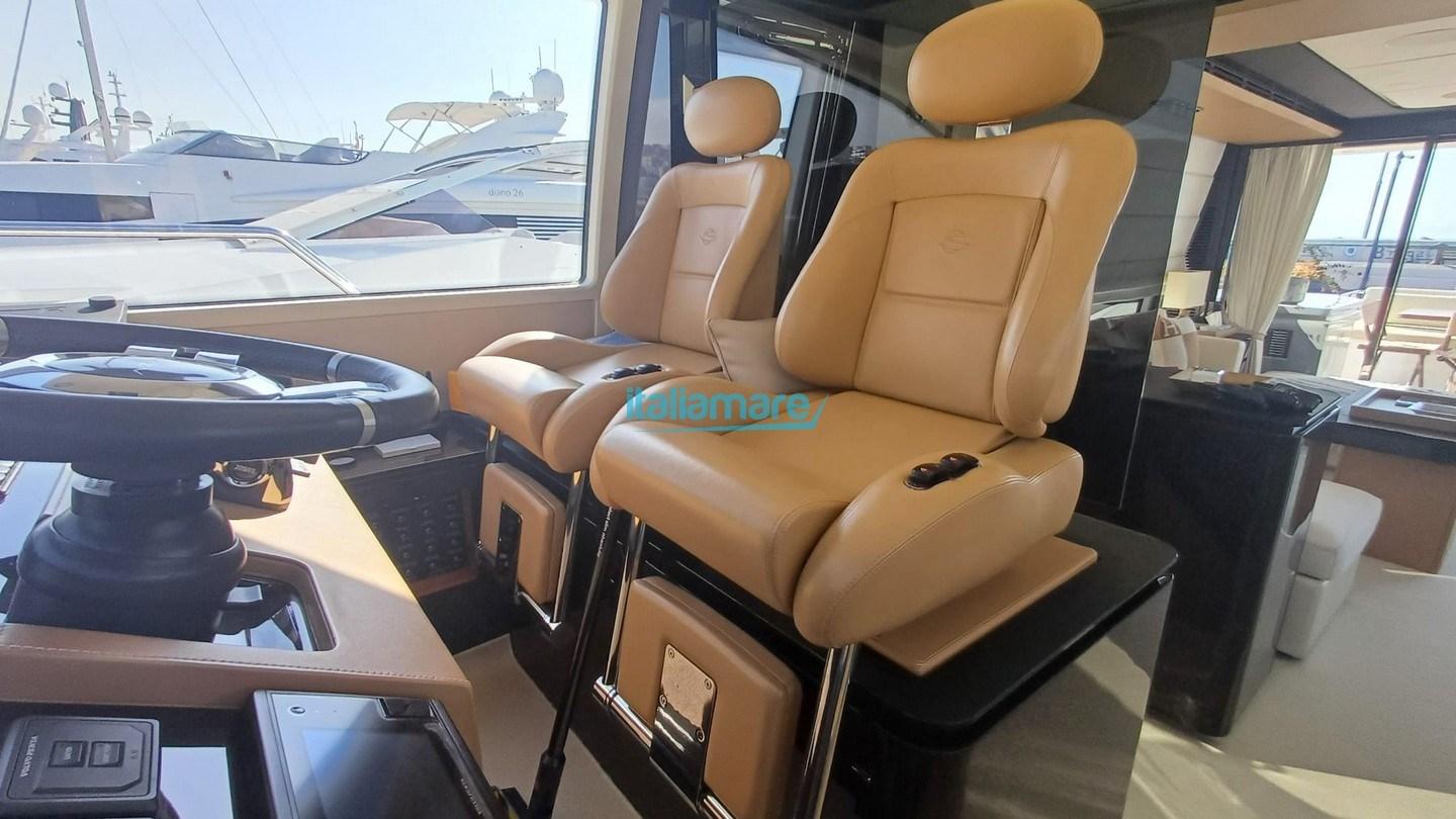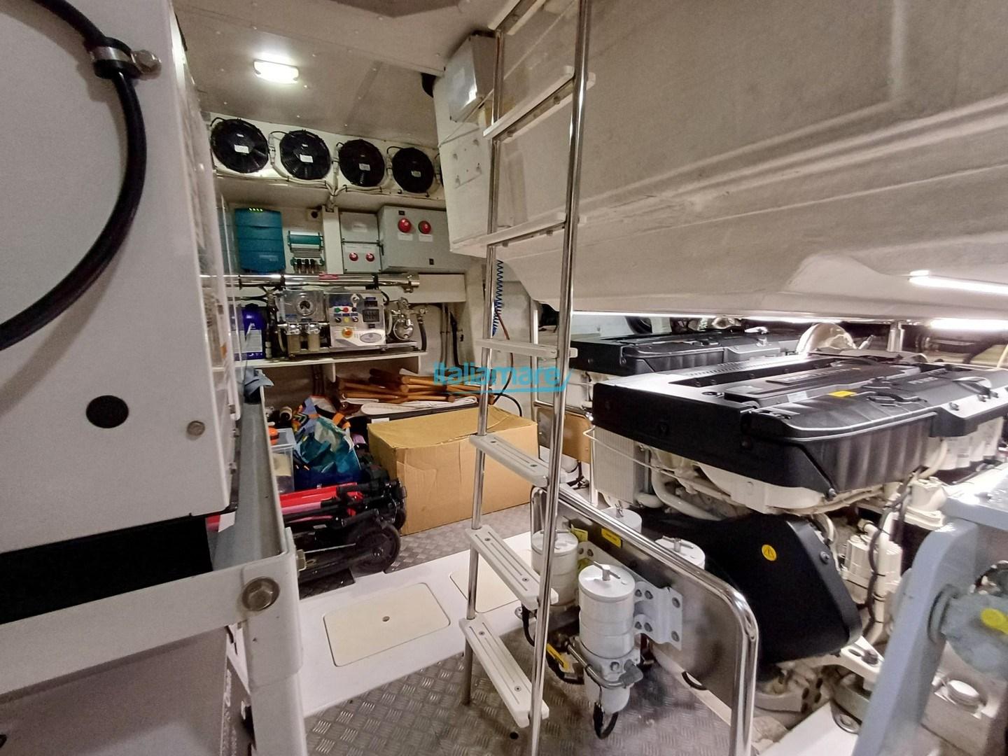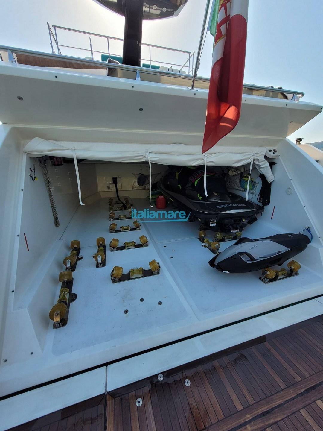 Engine Alarm, Bilge Alarm, 2 Water pressure pump, Teak Side Decks, Special Colour (CHAMPAGNE), Deck Shower, Twin Steering, Directional Spotlight, Electric Flaps, Tender Garage, Hard top, Fire Extinguishing System, Compressor Air System, Flaps Indicators, Anchor Chain Washdown, Courtesy Lights, Underwater lights, Gangway, Platform, Automatic Bilge Pump, Manual Bilge Pump, Side door, Teak Cockpit, Shorepower connector, Water harbor connector system, Electronic instrumentation repeater, Electric Windlass, swimming ladder, Stabilizers, cockpit table, Teak Deckhouse, Stern Winches, Bow Winches.